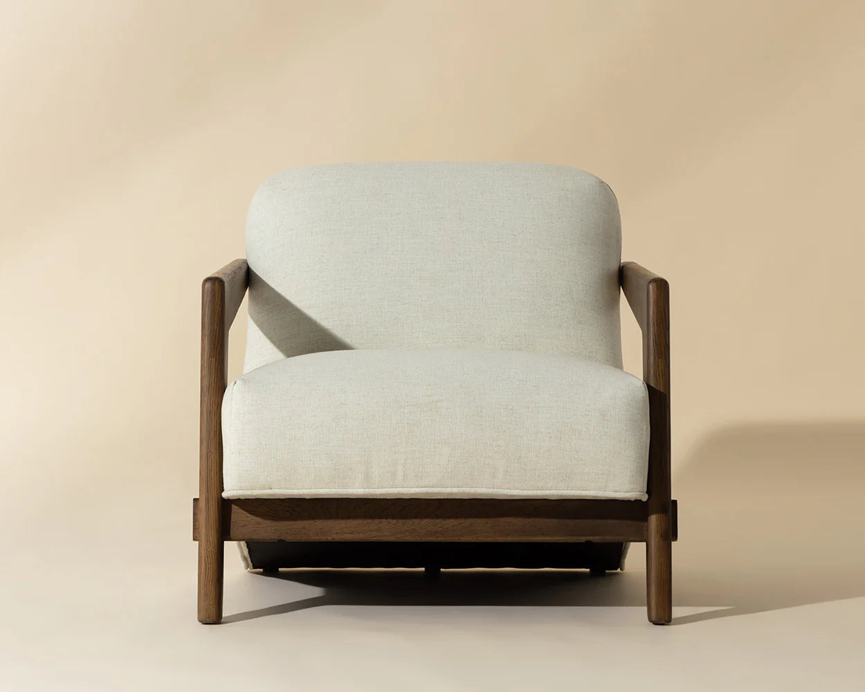 The Bosco Lounge Chair, with its sharp and subtle design, is a mid-century marvel. The warm brown oak wood frame is streamlined for relaxed, surprisingly soft seating thanks to plush cushioning upholstered in geralt linen performance fabric.