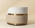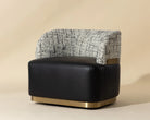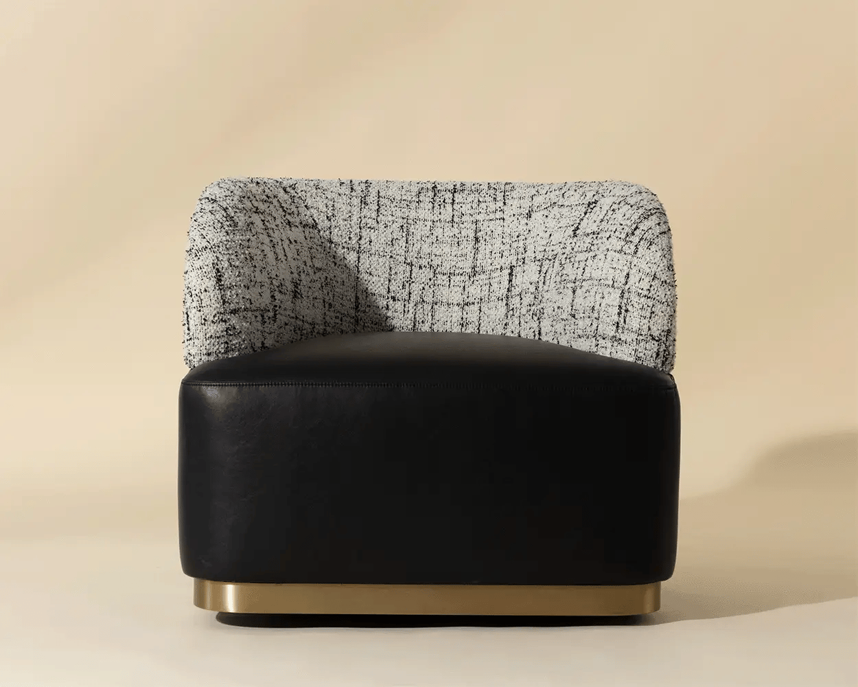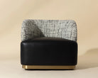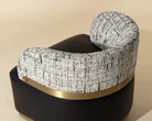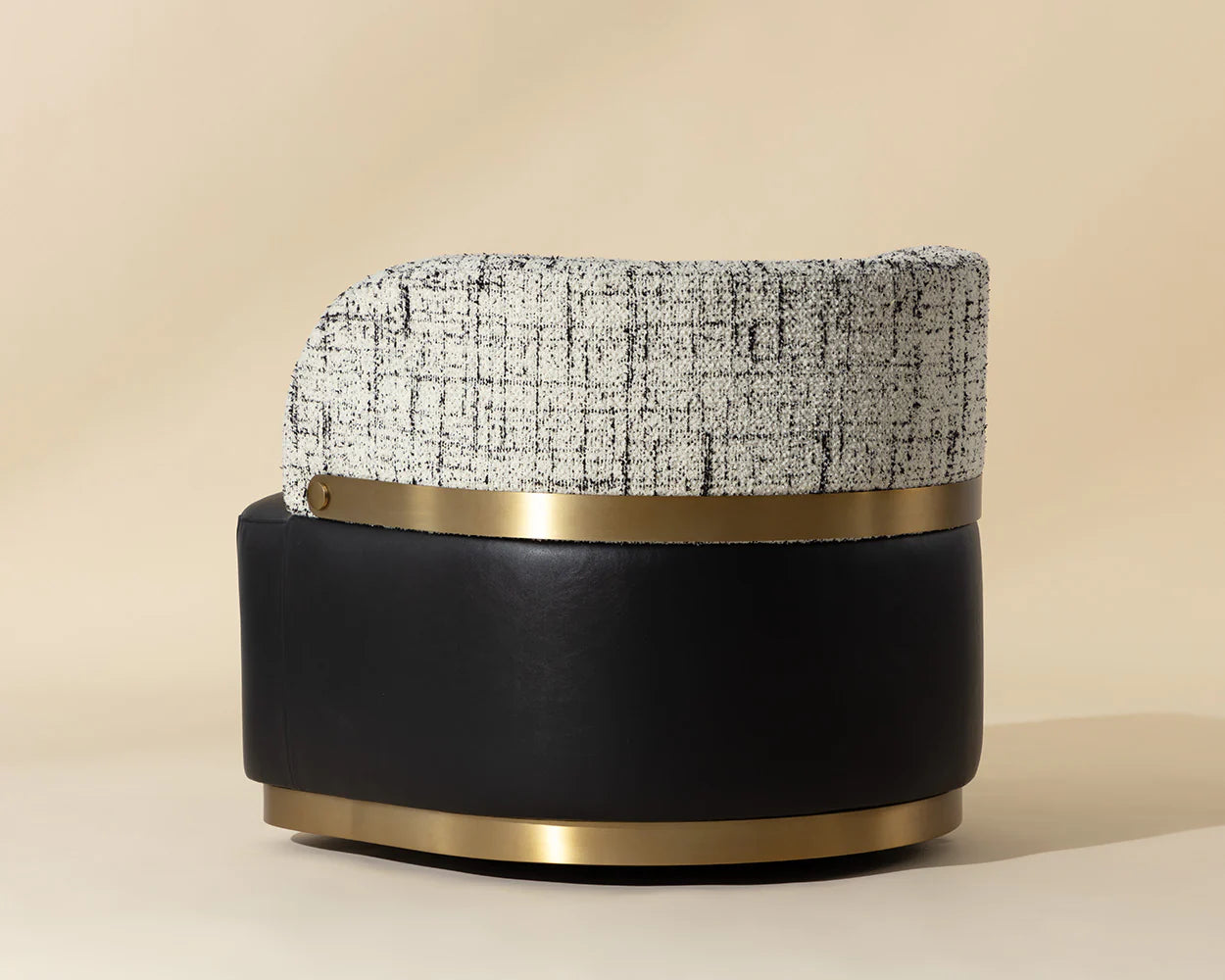The Brinda Swivel Lounge Chair is a mid-century delight that showcases a mastery of craft and dazzling style. Upholstered in smooth bravo black leather and halton birch fabric, this gorgeous lounge chair features a gold powder-coated stainless steel accent on the backrest and a matching plinth base. Also available in smooth napa beige faux leather and hailey moon fabric.