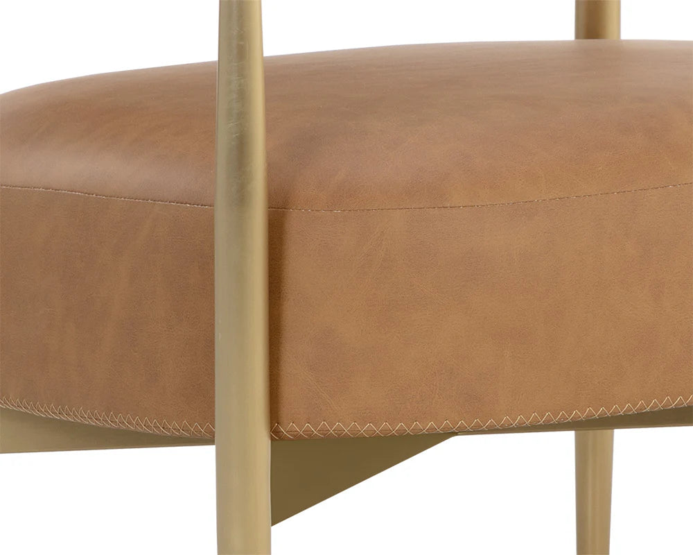 Every detail that makes up the handsome Heloise Lounge Chair is designed with purpose. Bravo black or miliken cognac faux leather upholstery and rope detailing is paired with powder-coated gold stainless steel for optimal style and comfort. Visible stitching on the seat and backrest accentuates the chair's smooth contours. This elegant barstool will perfectly complement any dining space. Handle With Care: This design has been crafted with faux leather. Faux leather is manufactured to reflect the natural characteristics of leather; as such, colour variations, markings, wrinkles, grooves, and light scratches are appreciated characteristics. No two pieces will be alike. Visit our Product Care page for more information on how to ensure the lasting beauty of this piece.