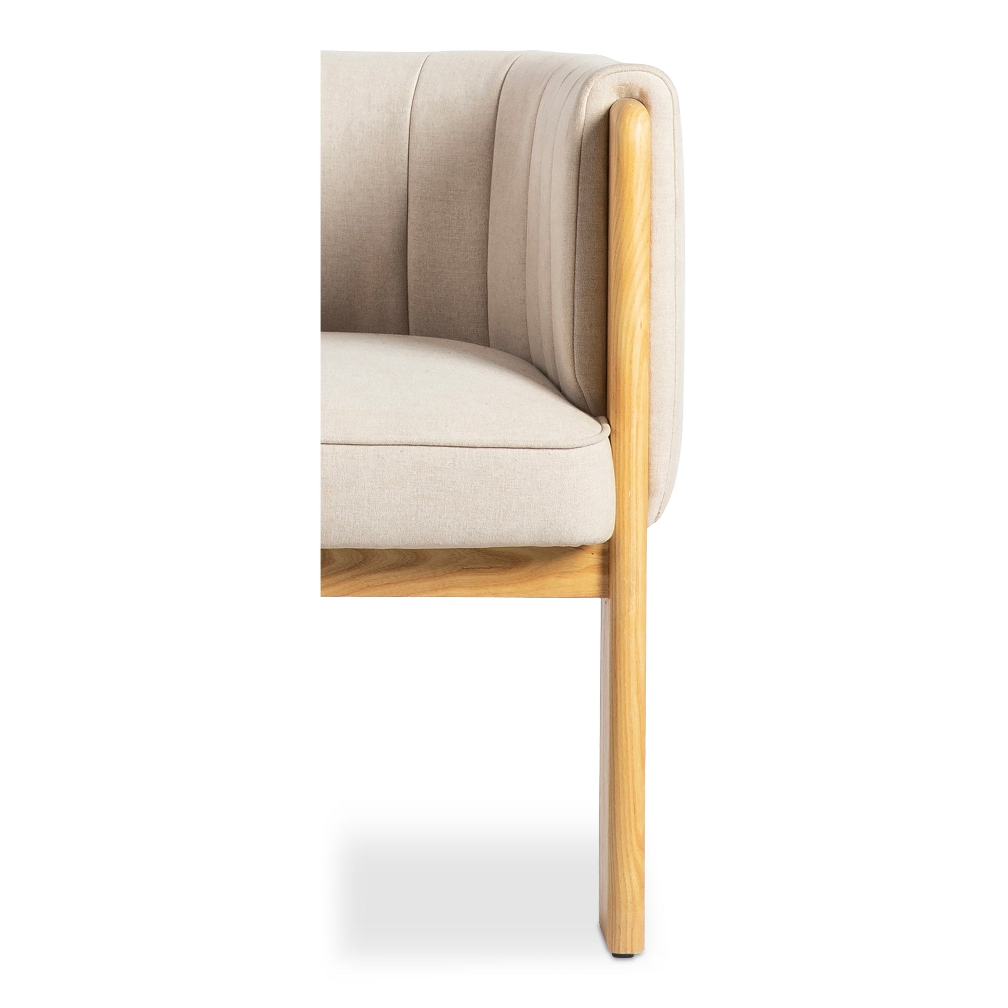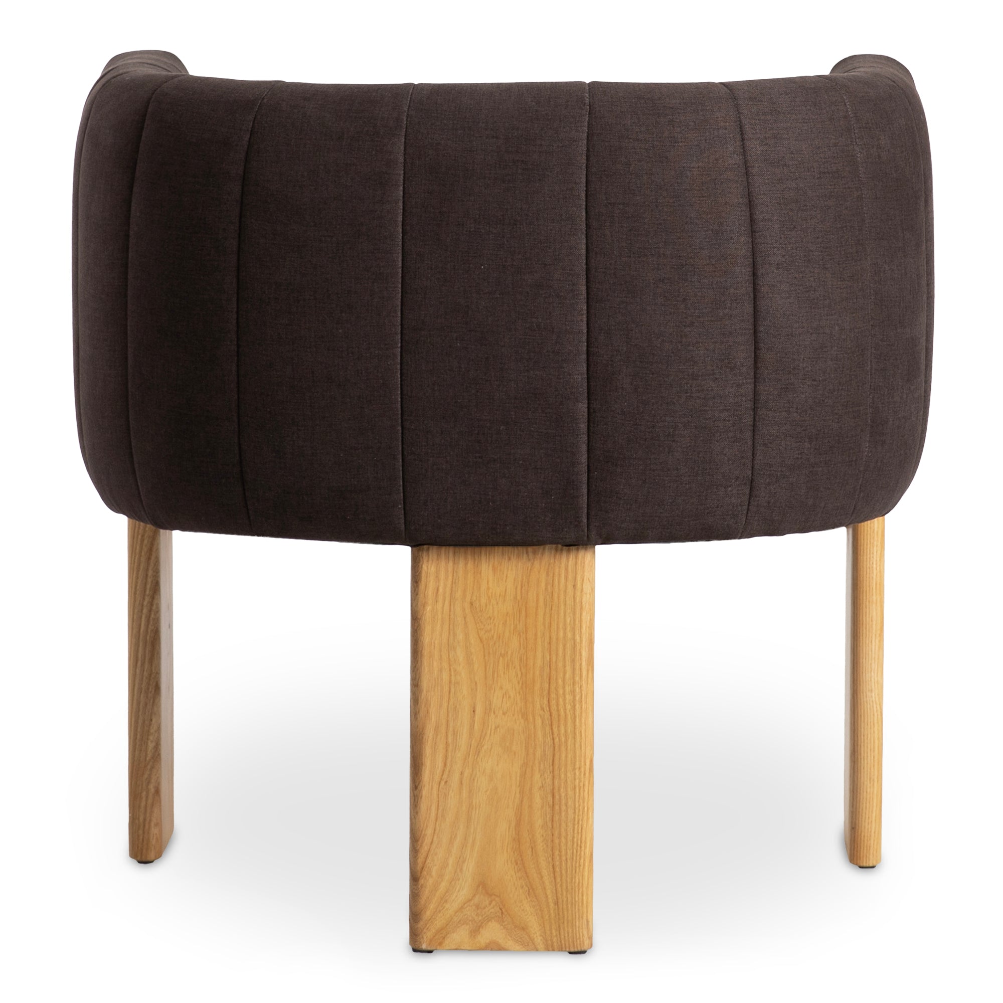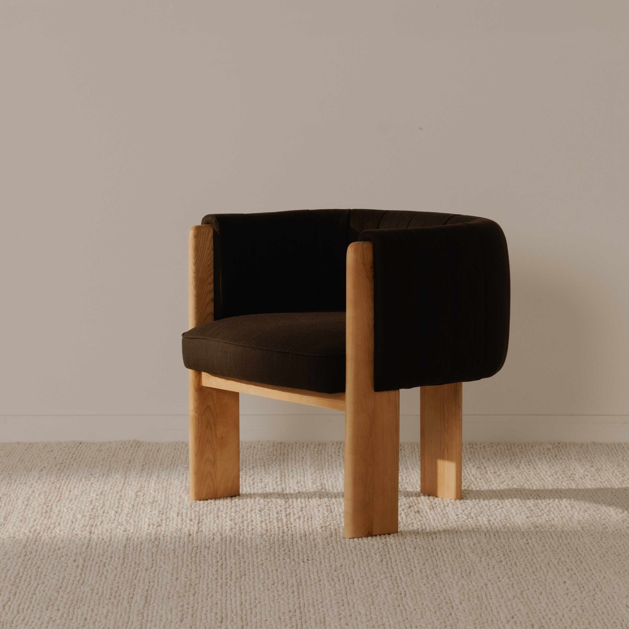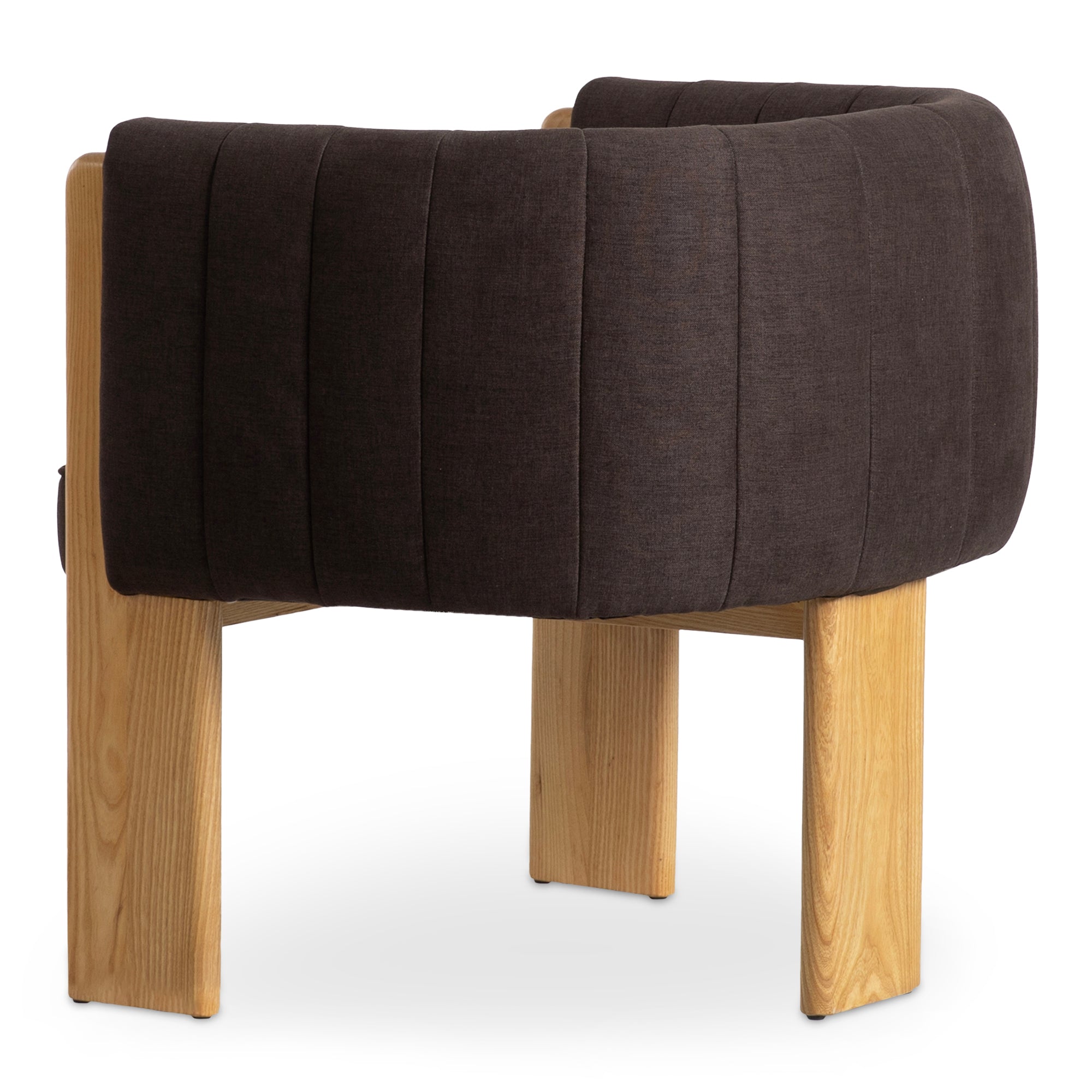 The Sofi accent chair brings contemporary design with vintage allure. An interplay of warm, 70s-inspired accentuate a bold sculptural, 3-leg design. Fold-over-like detailing on the arms of the chair expose the lustrous golden ash wood frame, while intricate upholstery channel detailing adds depth and texture to this inviting and nostalgic piece.