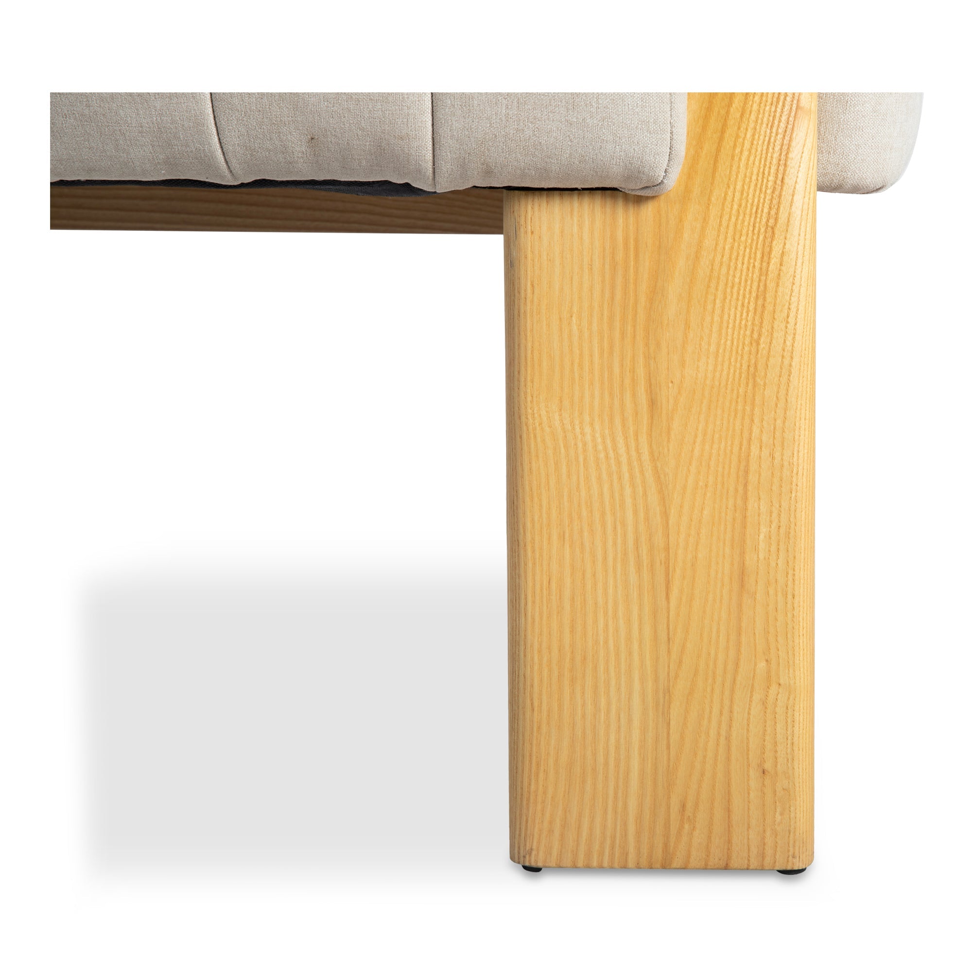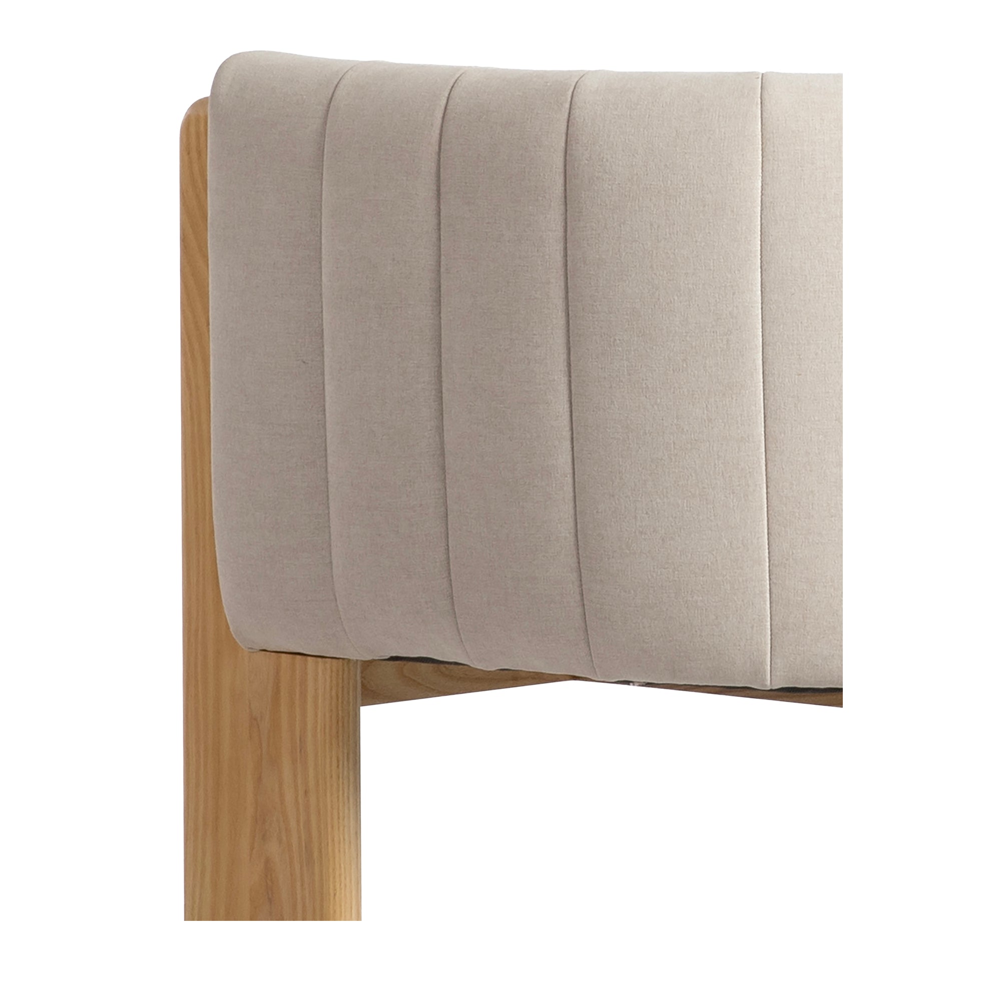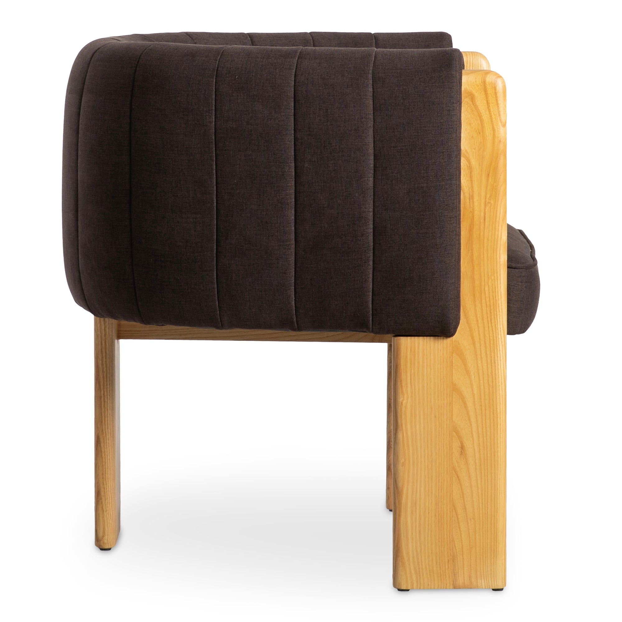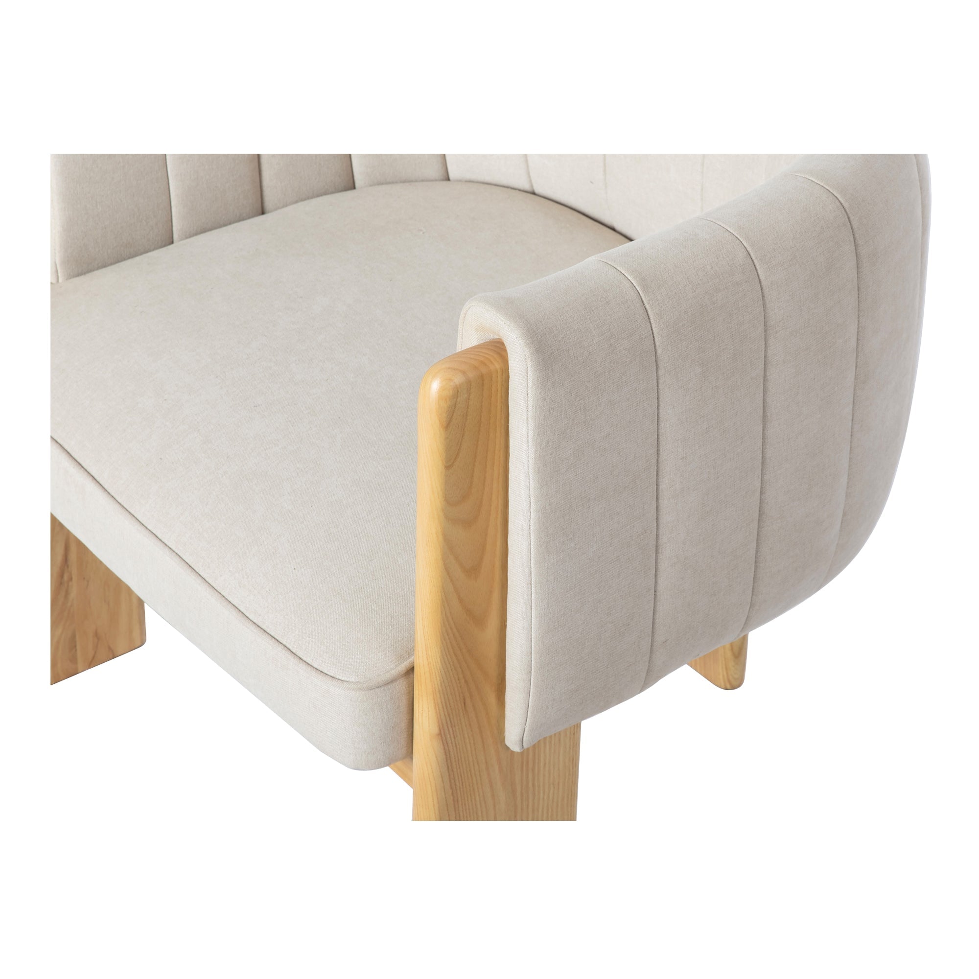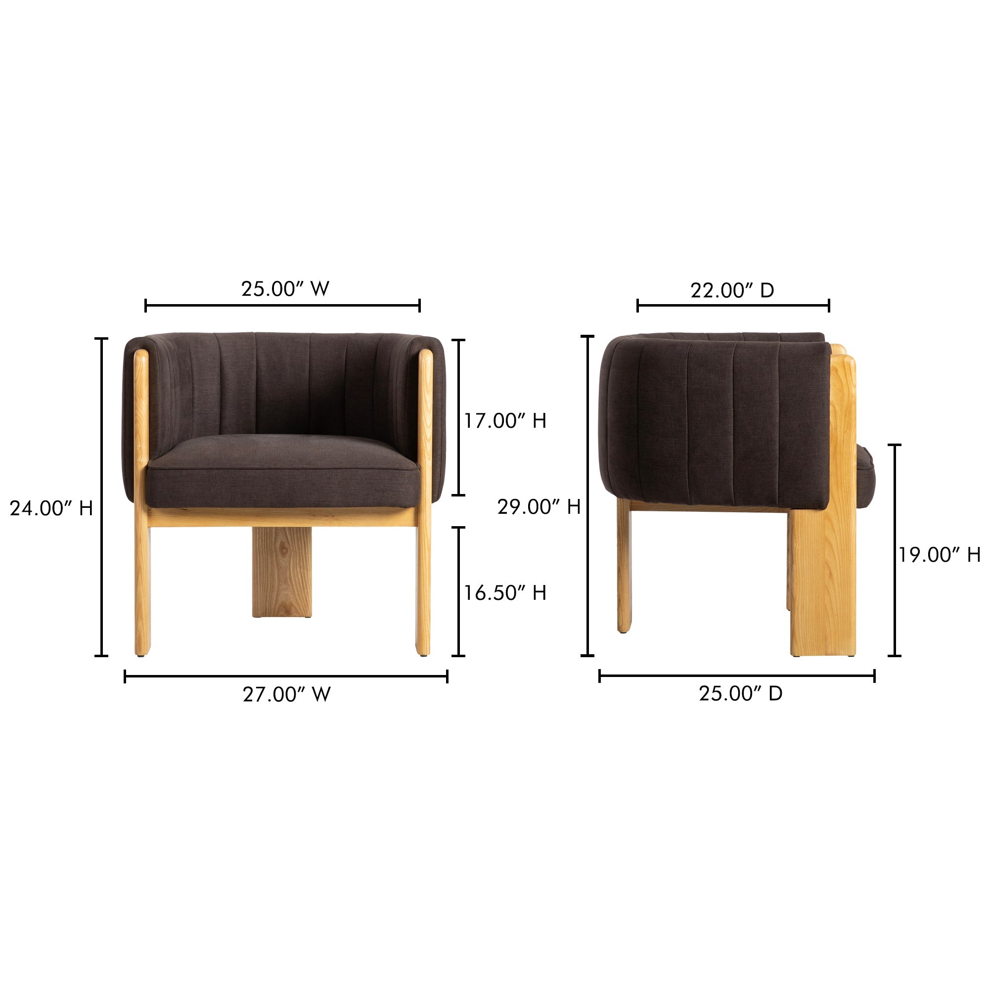 The Sofi accent chair brings contemporary design with vintage allure. An interplay of warm, 70s-inspired accentuate a bold sculptural, 3-leg design. Fold-over-like detailing on the arms of the chair expose the lustrous golden ash wood frame, while intricate upholstery channel detailing adds depth and texture to this inviting and nostalgic piece.
