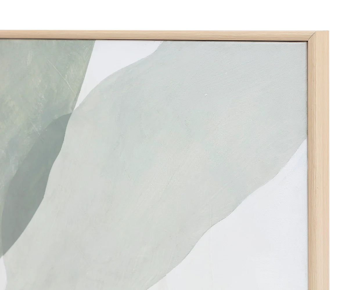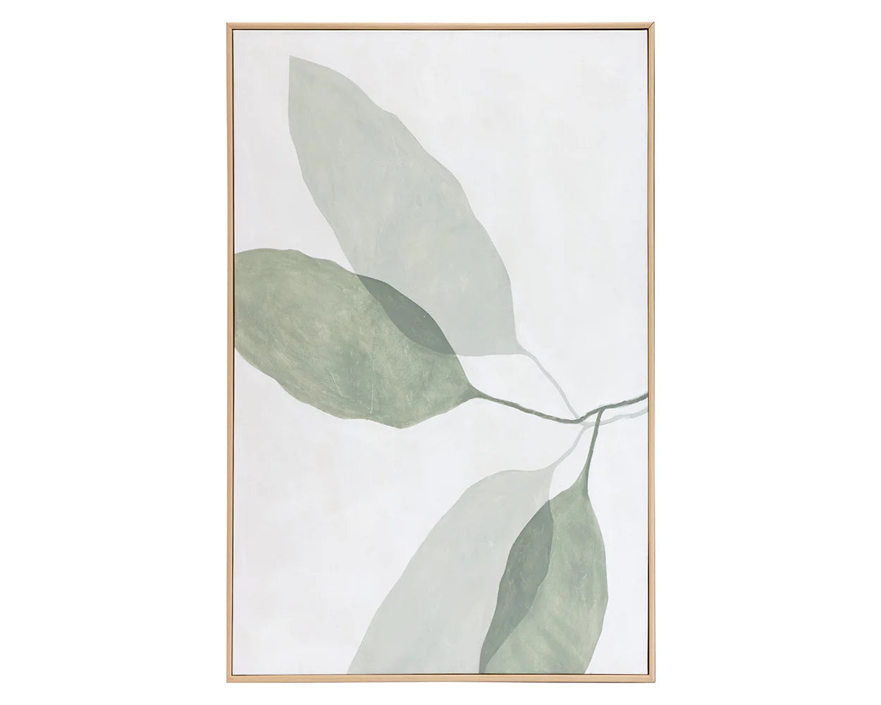 Freshen up any room with the cool green hues featured in this diptych painting. This piece features an image of hand-painted leaves that evoke a sense of nature and calmness. Features a natural wood floater frame that complements the artwork.