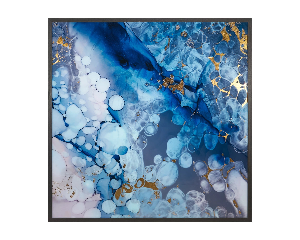 A lively blue image printed on acrylic from our Luxe Art collection. Features hues of blue oil bubbling on the surface of a watery pool. A final touch of hand applied gold leaf completes the look. Finished with a charcoal wood floater frame. Due to the reflective nature of acrylic and gold leaf, images on site may not capture the artisanal characteristics precisely. Hand-finished items will vary from piece to piece, resulting in a truly one-of-a-kind artwork.
