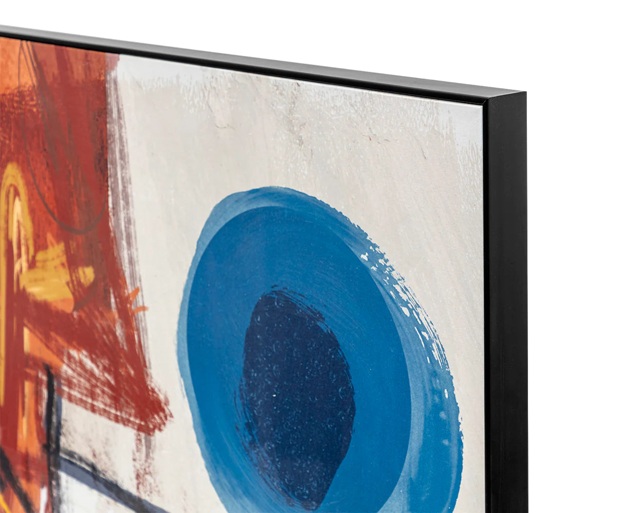 Colonial Revival is an abstract expression of varying shapes and colours for a striking piece of art. Hand textured on canvas and finished with a black wood floater frame.