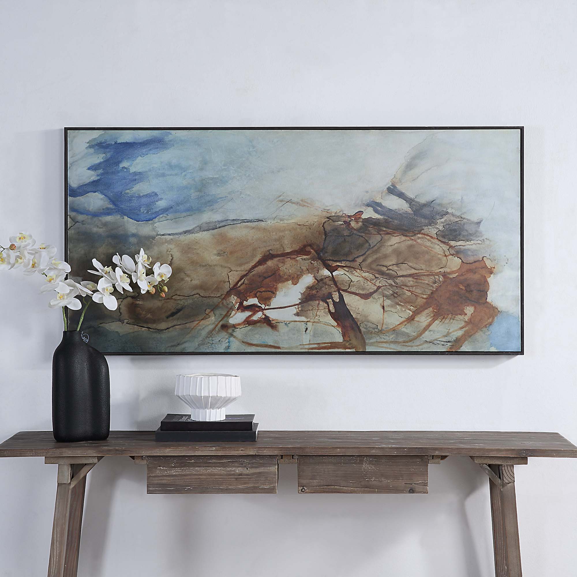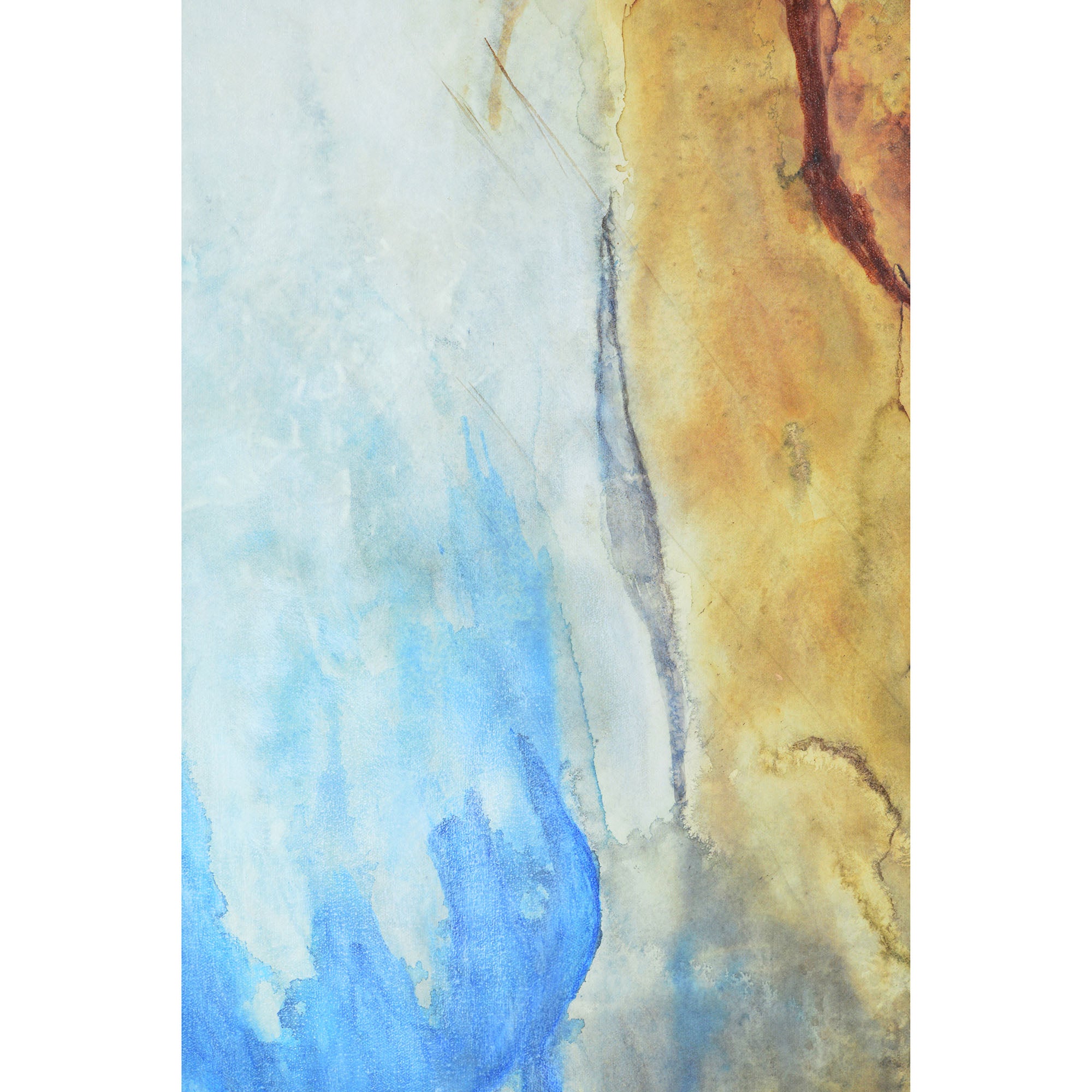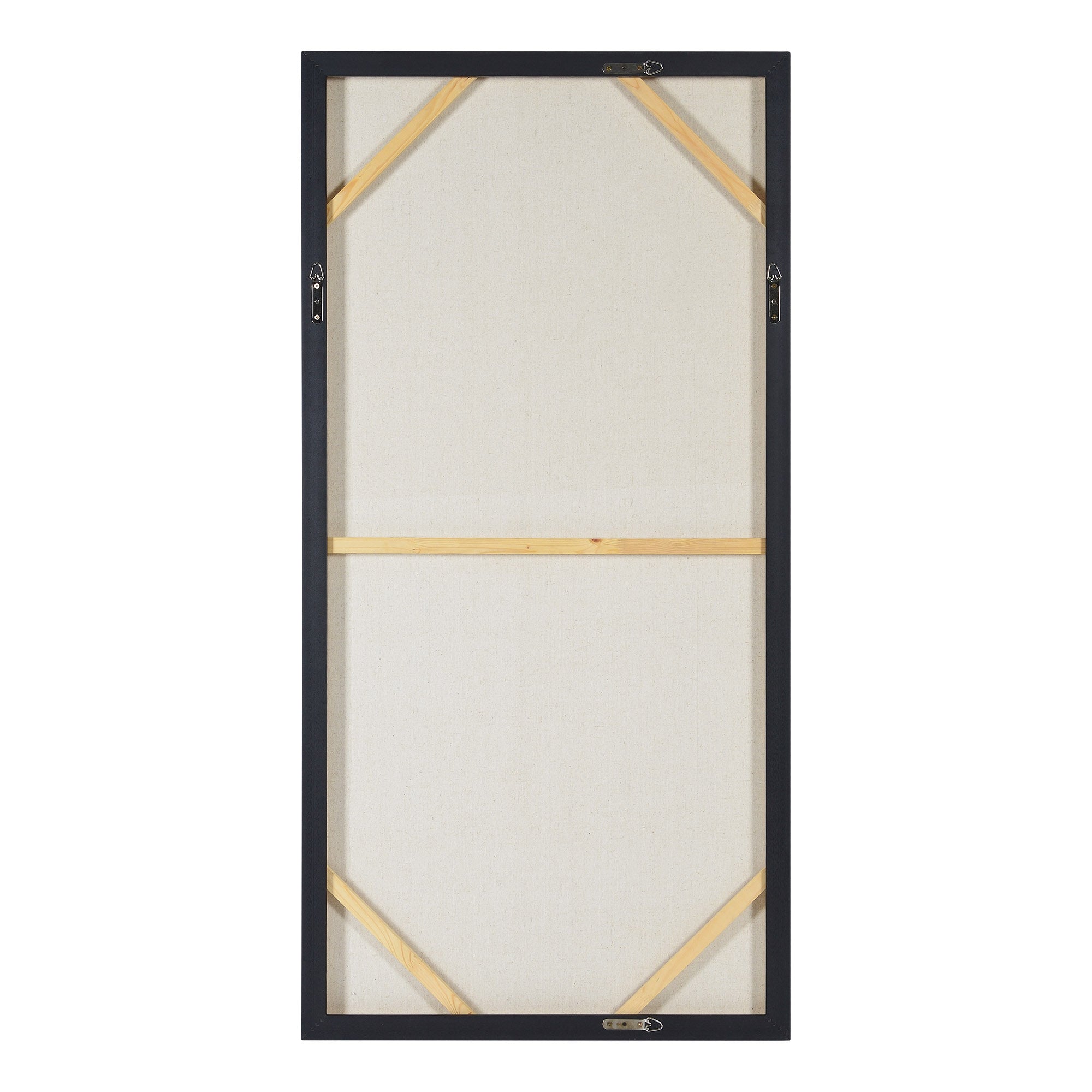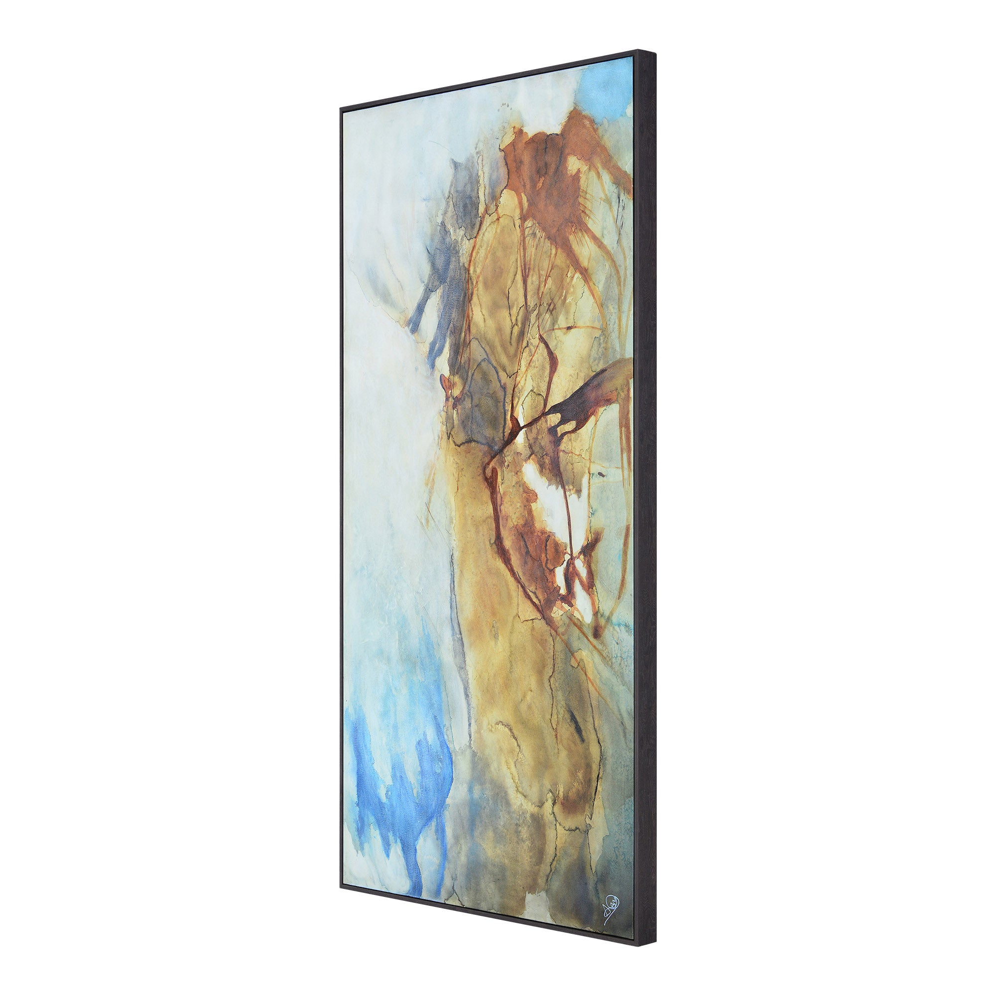 Printed details and hand painted brush strokes come together to form a captivating abstract design in this ART painting. Capable of hanging vertically or horizontally, this painting tells an entirely different story with each arrangement. Featuring a dark brown frame, the gold and rust-toned details have a chance to stand out even further.