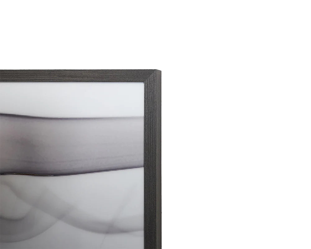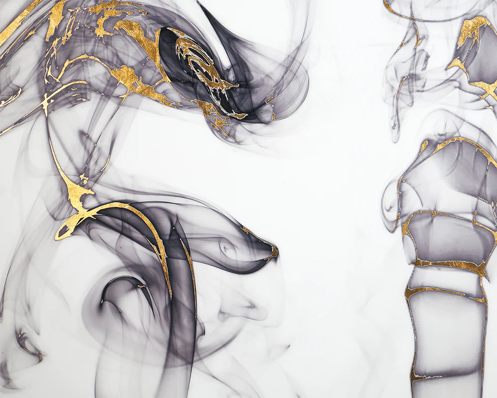 A billowing black and white image printed on acrylic from our Luxe Art collection. This print features black swirls of smoke drifting over a white background. A final touch of hand applied gold leaf completes the look. Finished with a charcoal wood floater frame. Due to the reflective nature of acrylic and gold leaf, images on site may not capture the artisanal characteristics precisely. Hand-finished items will vary from piece to piece, resulting in a truly one-of-a-kind artwork.