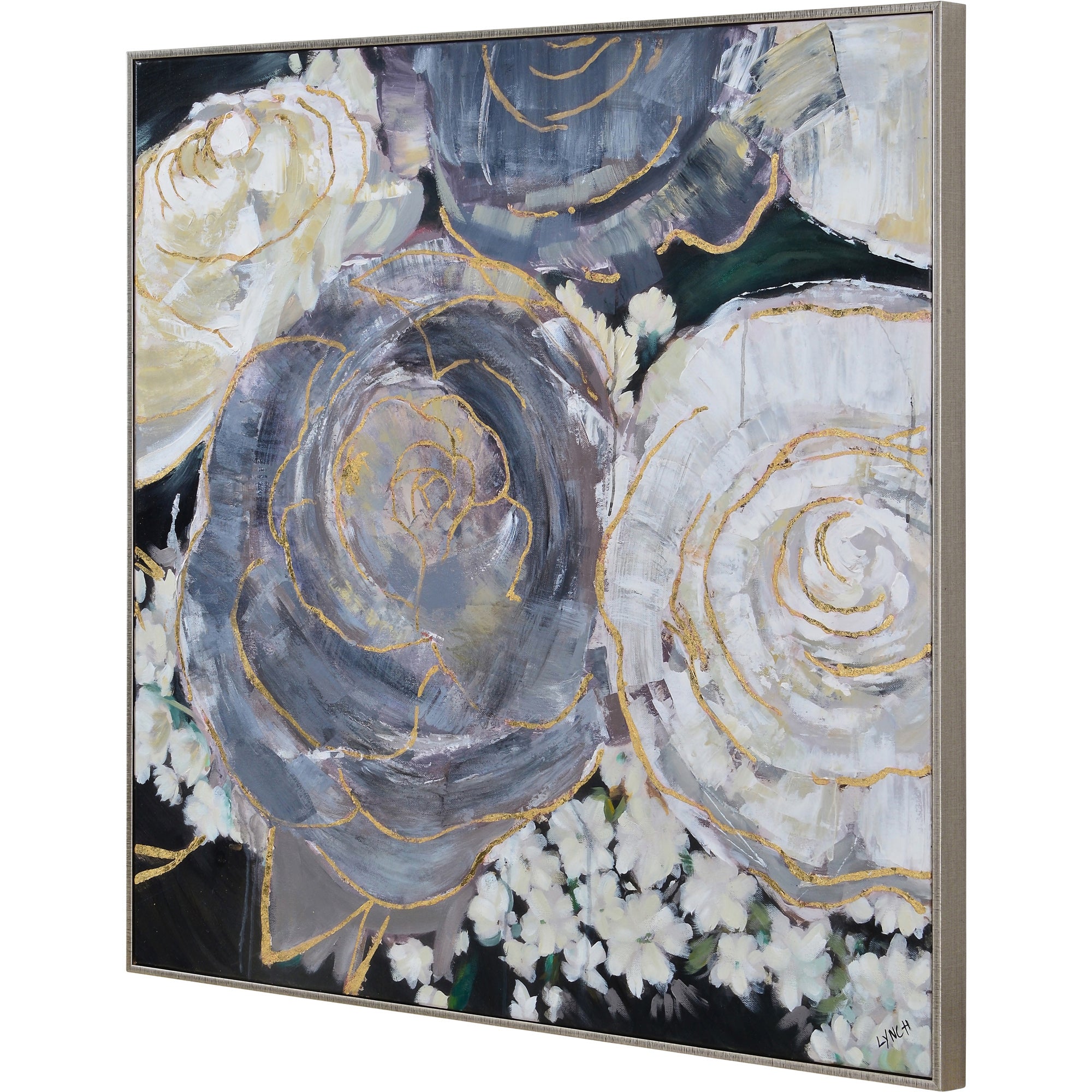 The standard floral painting takes on a creative, luxe quality in this framed oil painting. Featuring a mix of dark and light tones, print and hand painted work, it proves there is great beauty in contrast. Set in the contemporary dining room, this piece will always be in the spotlight.