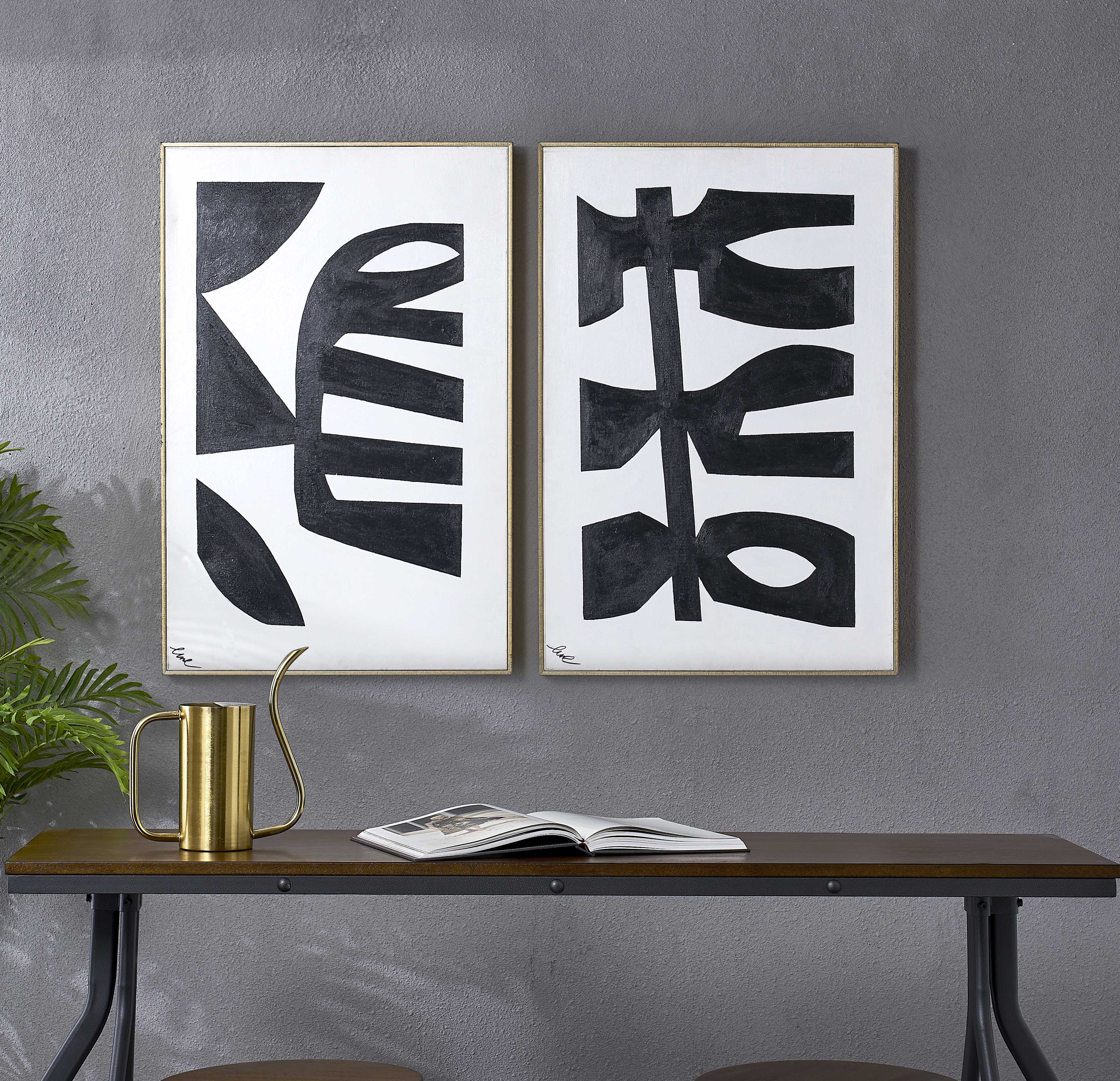 This set of graphic paintings on cotton canvas add a bold touch to the mid-century modern living space. With strong black lines creating shapes akin to leaves on a vine, their vivid designs have a familiar quality. Hang them together or separately within the interior, for a dose of personality.