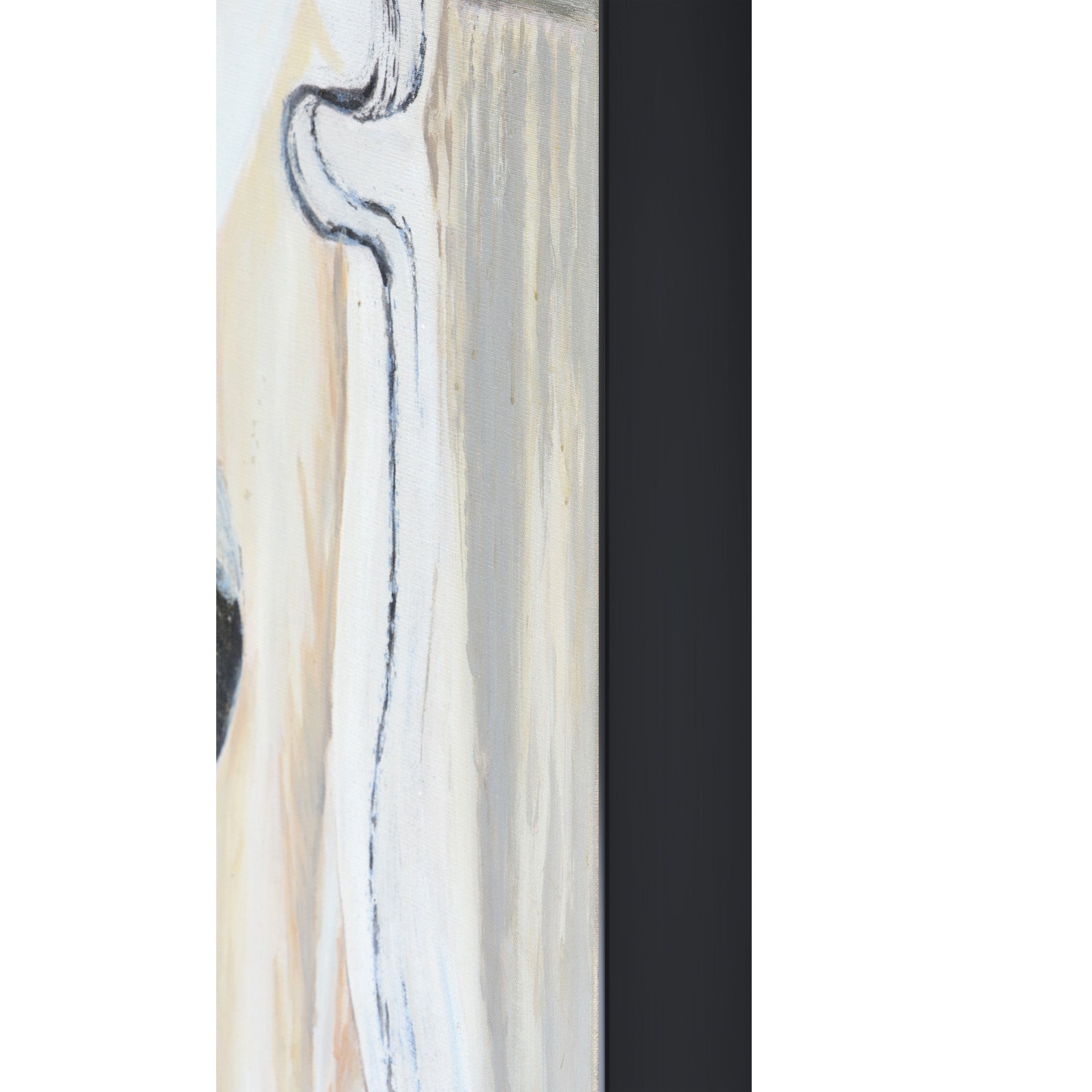 The minimal interior benefits from a pop of personality when this cotton canvas is set on the wall. The blend of textured painting, completed by hand, and print input, coupled with the squiggles and stripes, gives this design a street ART feel. A thin black frame keeps the intricacy of the piece contained.