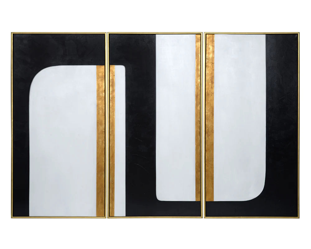 This striking triptych in black, white and gold features a continuous graphic pattern that leads from one painting to the next. Features a gold finished wood floater frame.