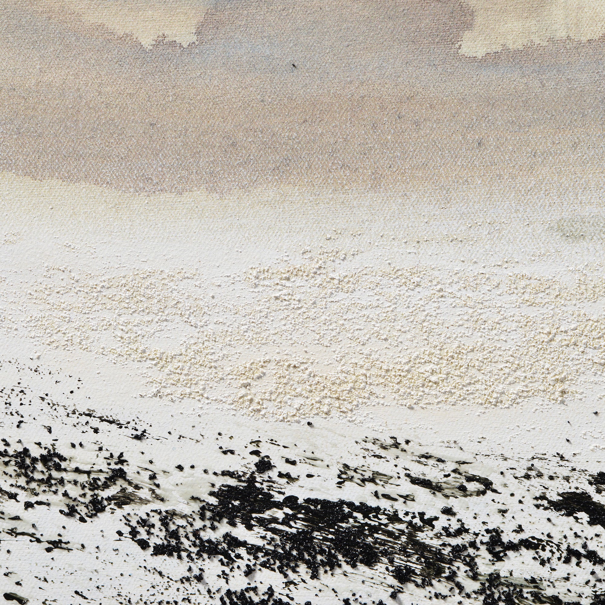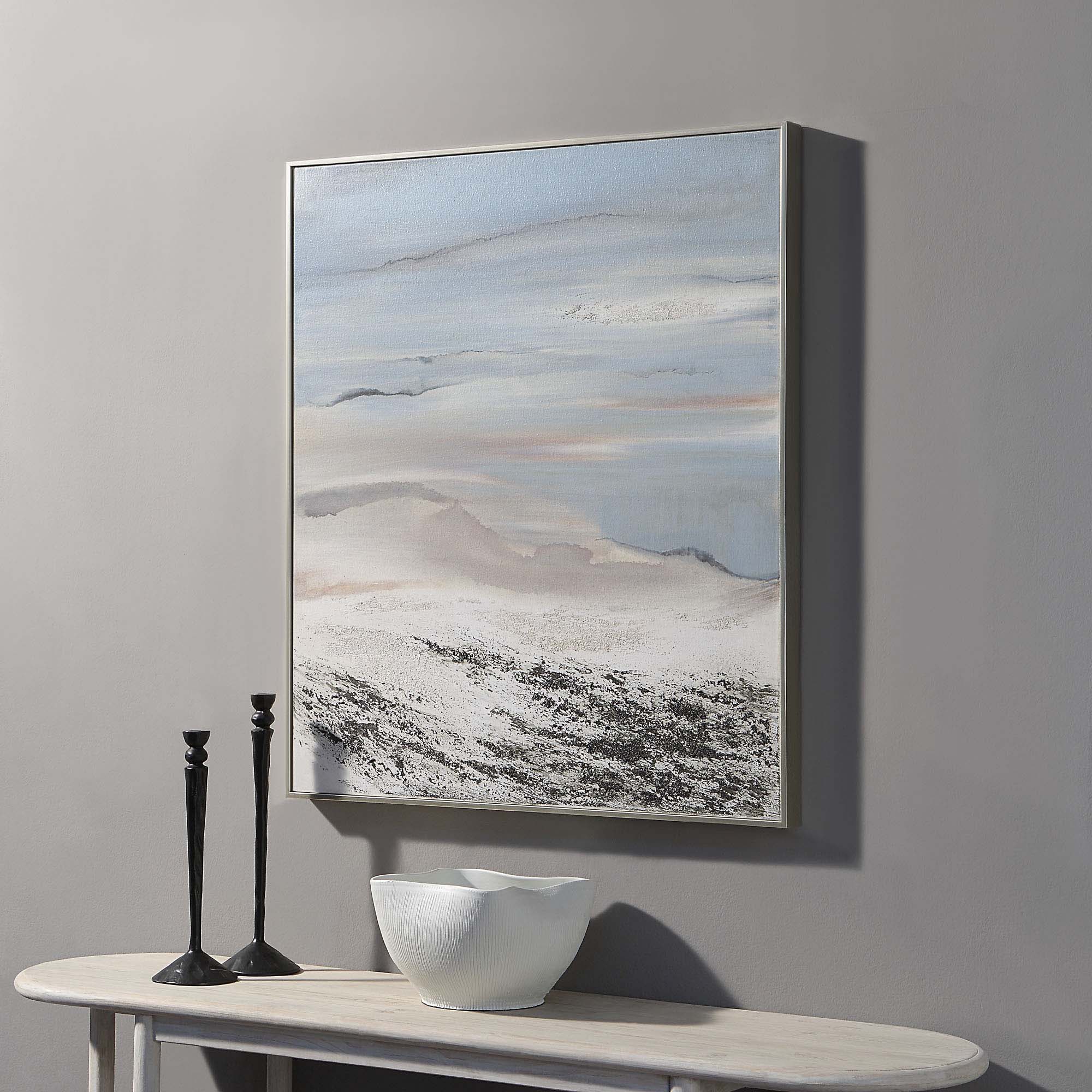 The serene energy of the ocean washes over the room this canvas ART hangs within. Clients styling a coastal cabin or beach house will find the carefree, yet elegant quality of this piece of ART assimilates effortlessly into the space. Featuring soft blue and beige tones, textured sand gel and a champagne frame, it is best arranged with neutral tones and organic textures in a minimalist décor.