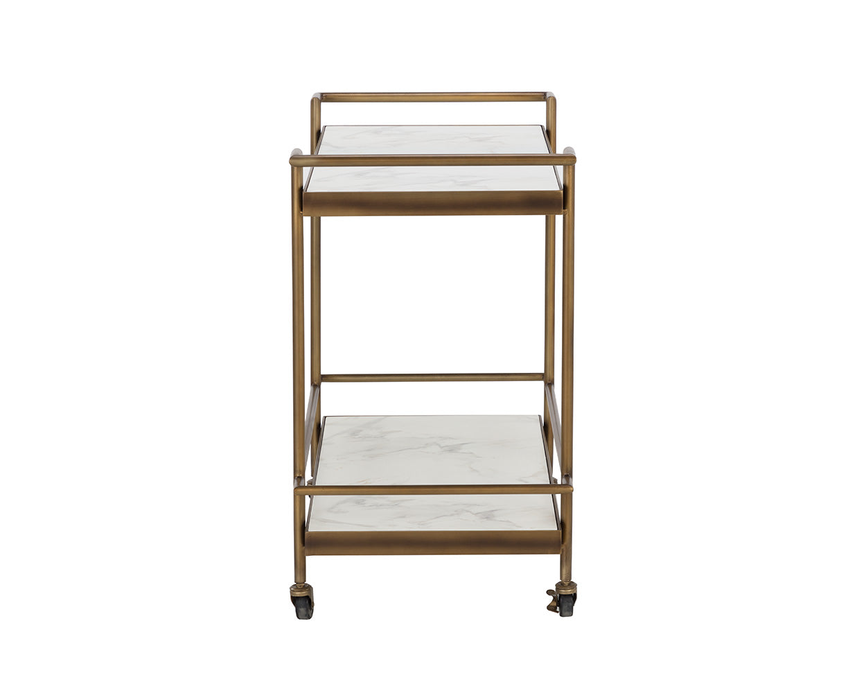 Elegantly display your spirits or drinkware with the Contardi Bar Cart. Built for durability, this bar cart features a powder-coated steel frame with a rustic bronze finish. The bottom and top shelves are made from reinforced concrete with a beautiful white marble look. Suitable for indoor and covered outdoor spaces.
