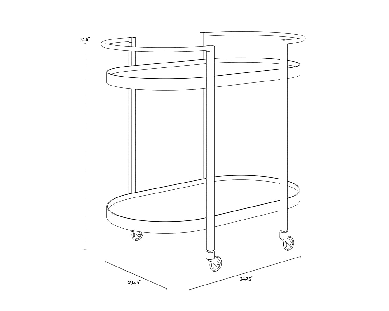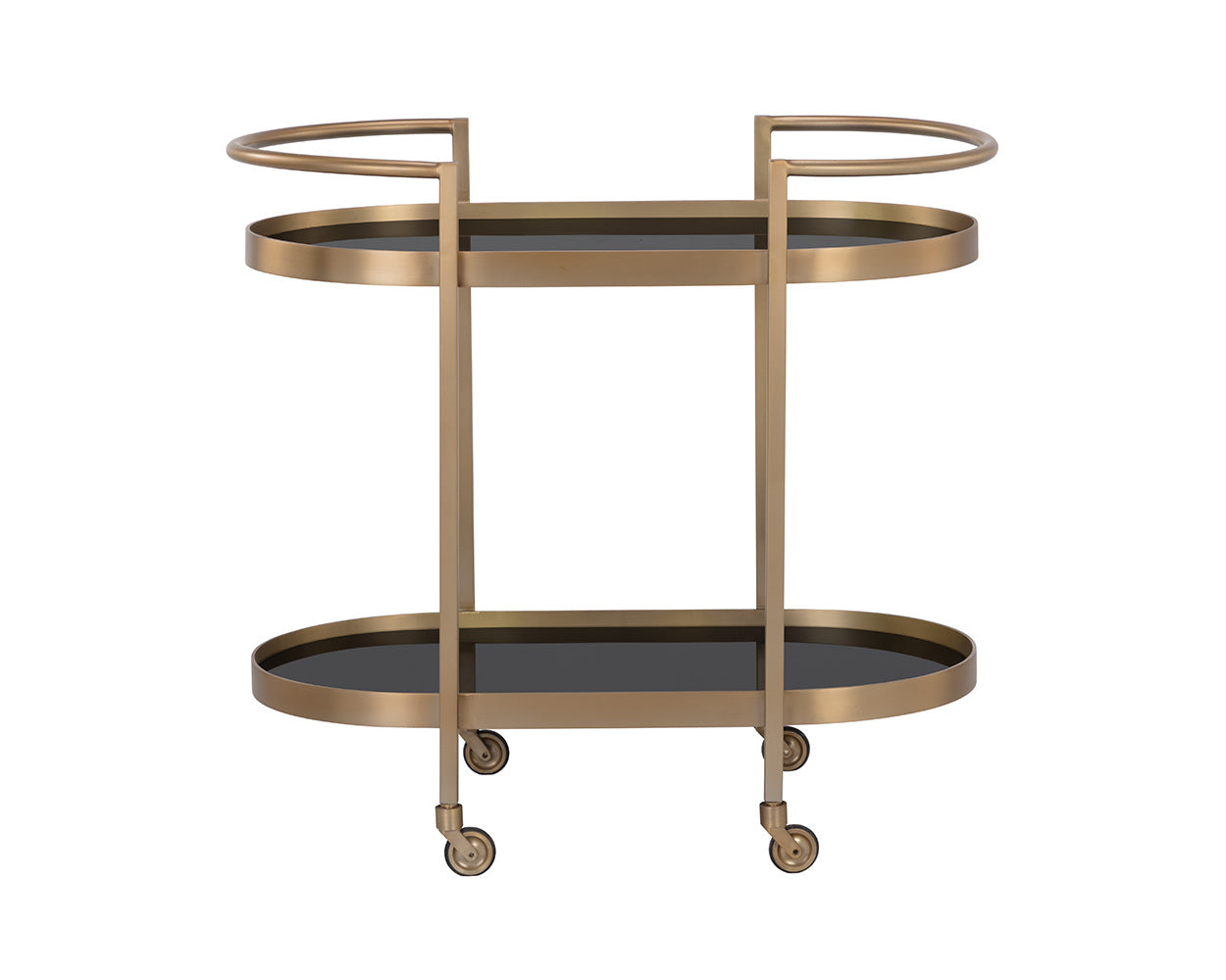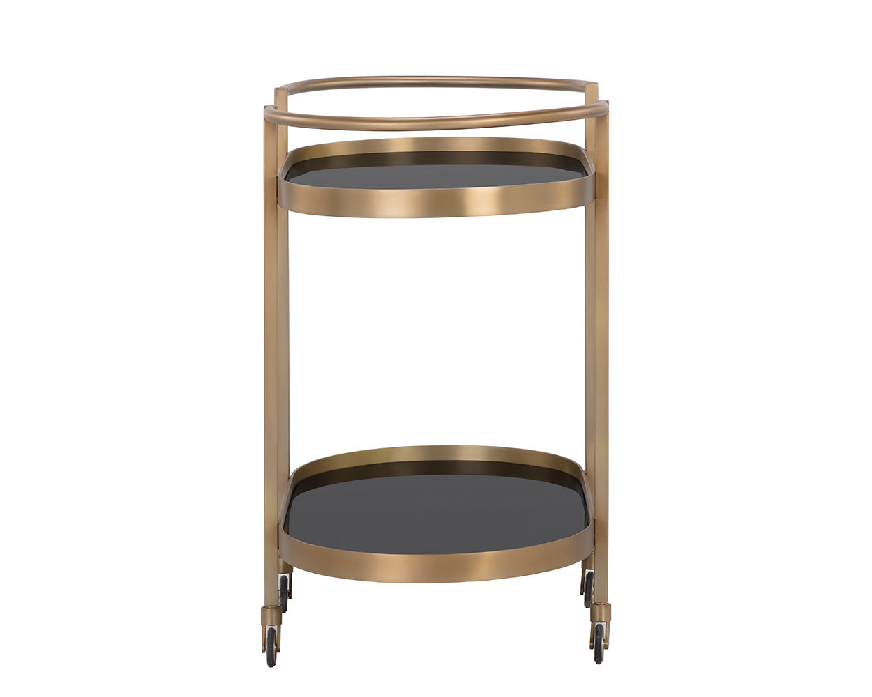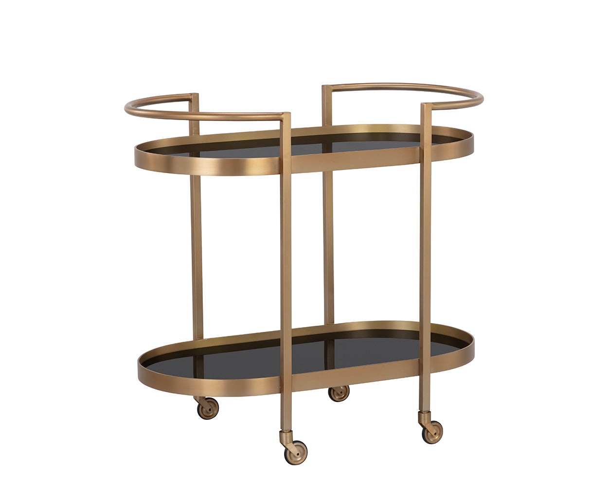 The Koen Bar Cart brings a glamorous addition to any dining space. Black mirrored shelves beautifully complement the antique brass frame for a classic look.