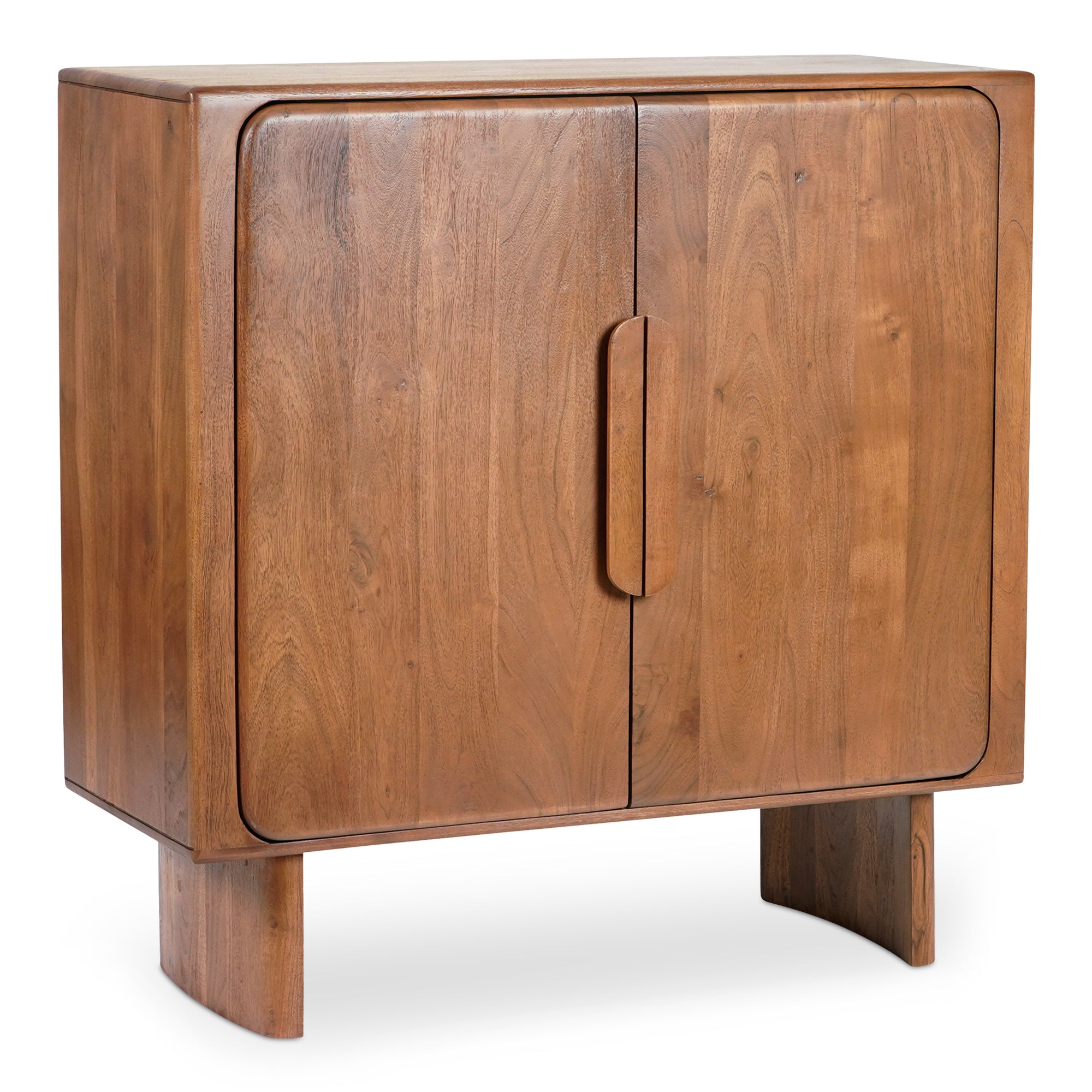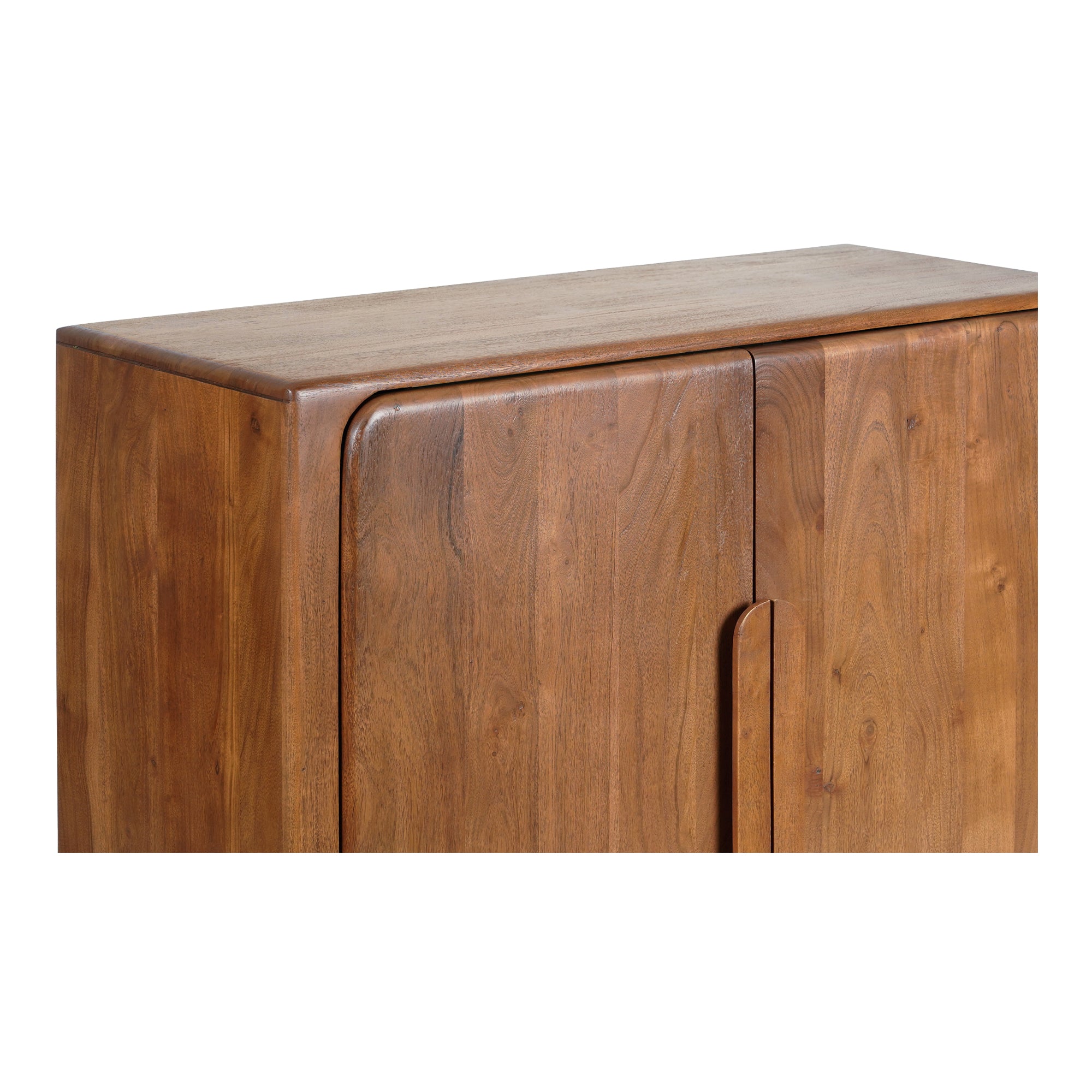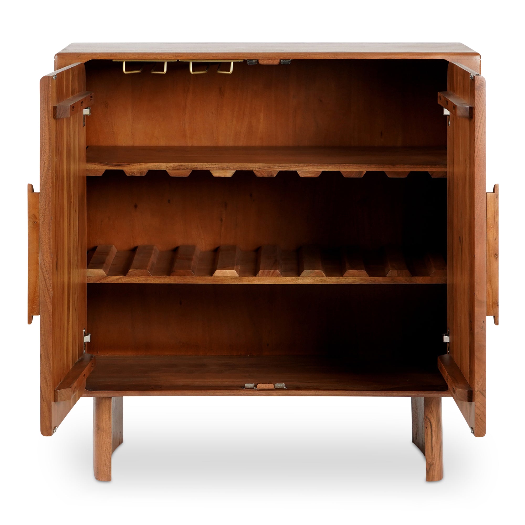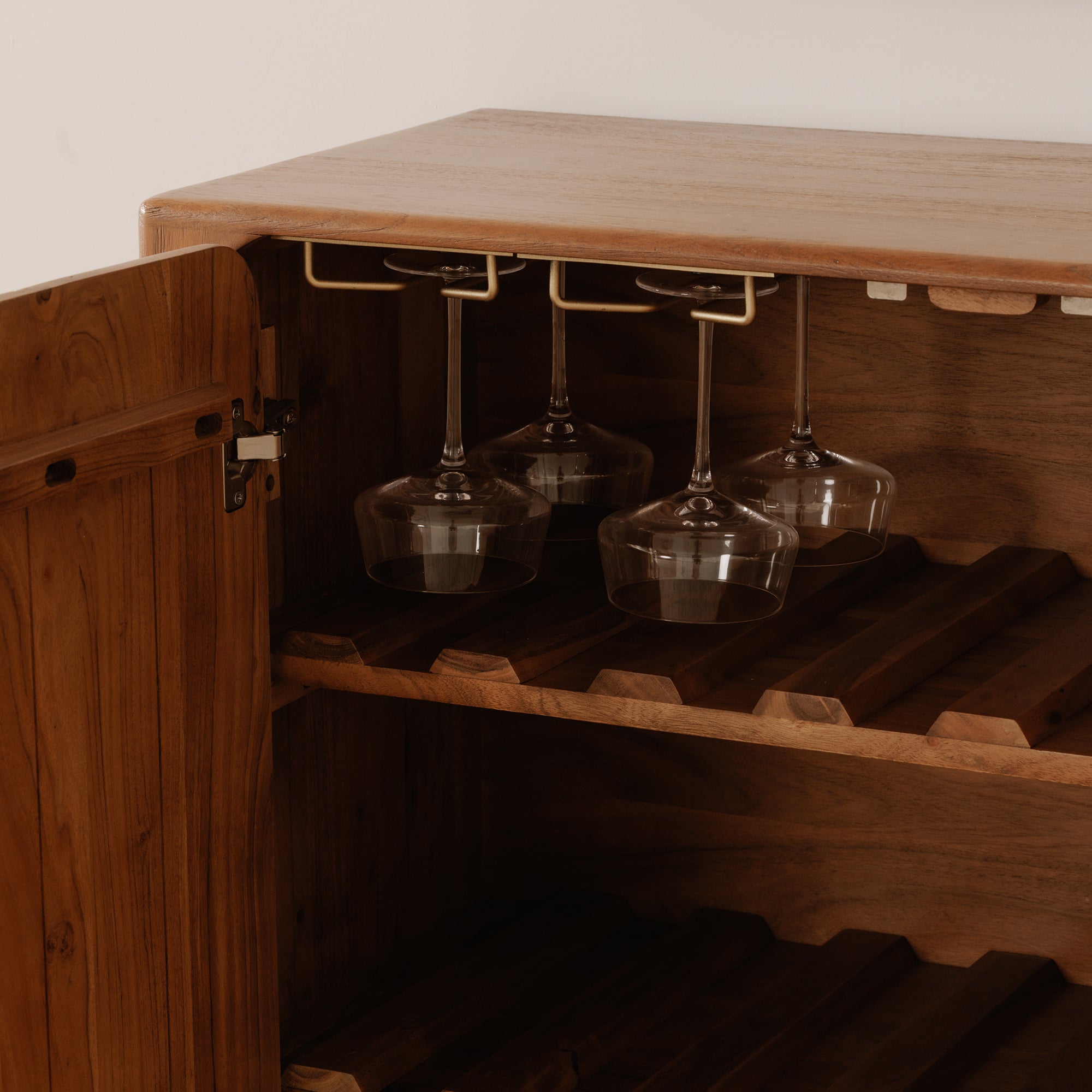 Round curved doors in a rich brown tone exude warmth and elegance in the Orson sideboard. Crafted from durable solid Acacia wood, the gentle curvature on the sides effortlessly softens the inherent charm of the hardwood. A thoughtfully designed interior features a convenient removable stem rack for hanging glasses and two reversible wine shelves.