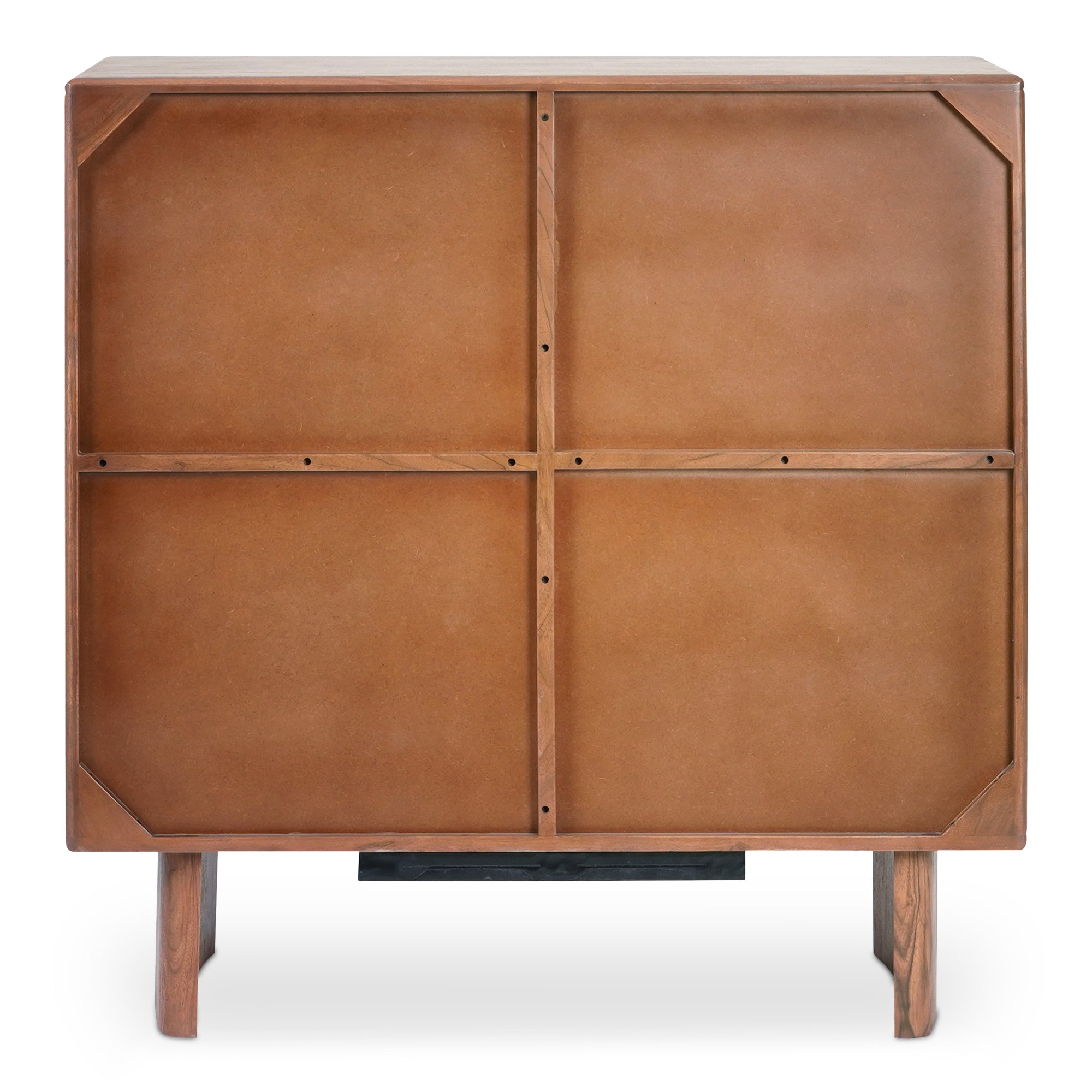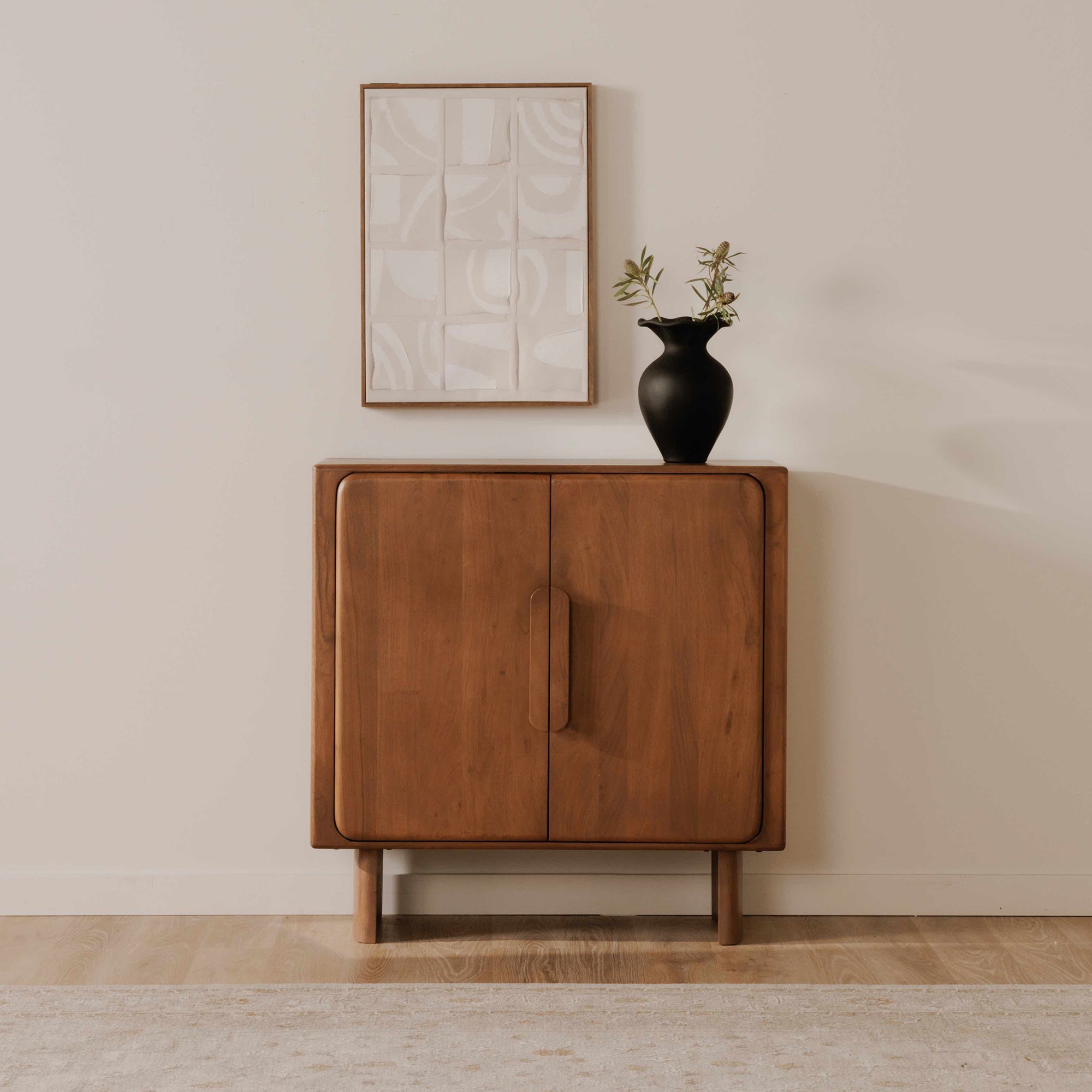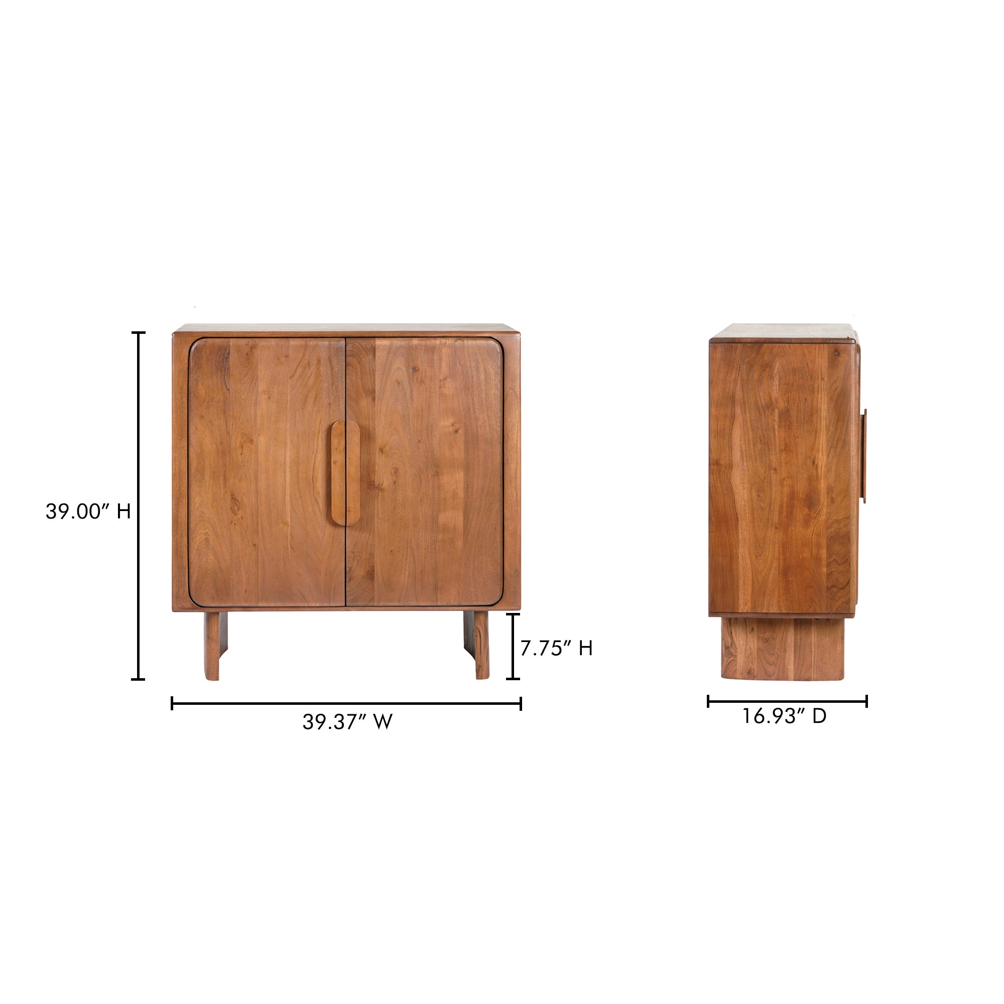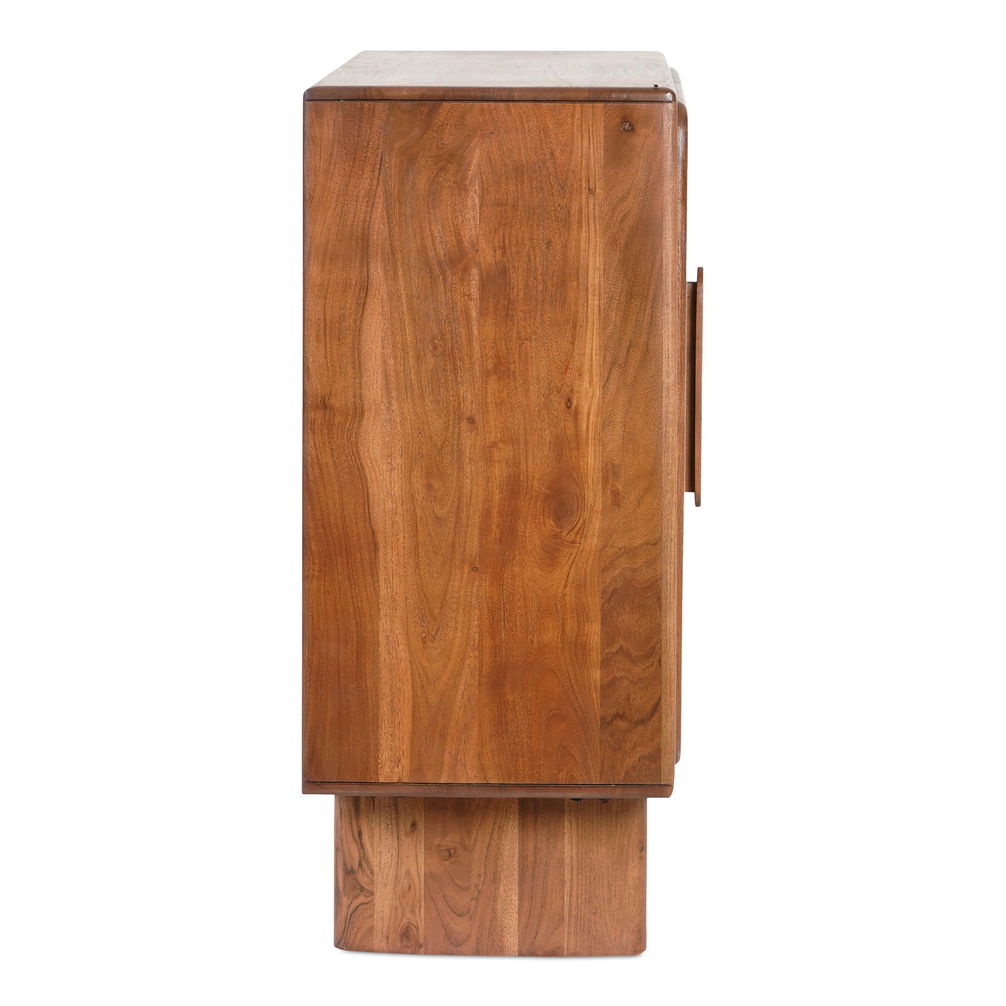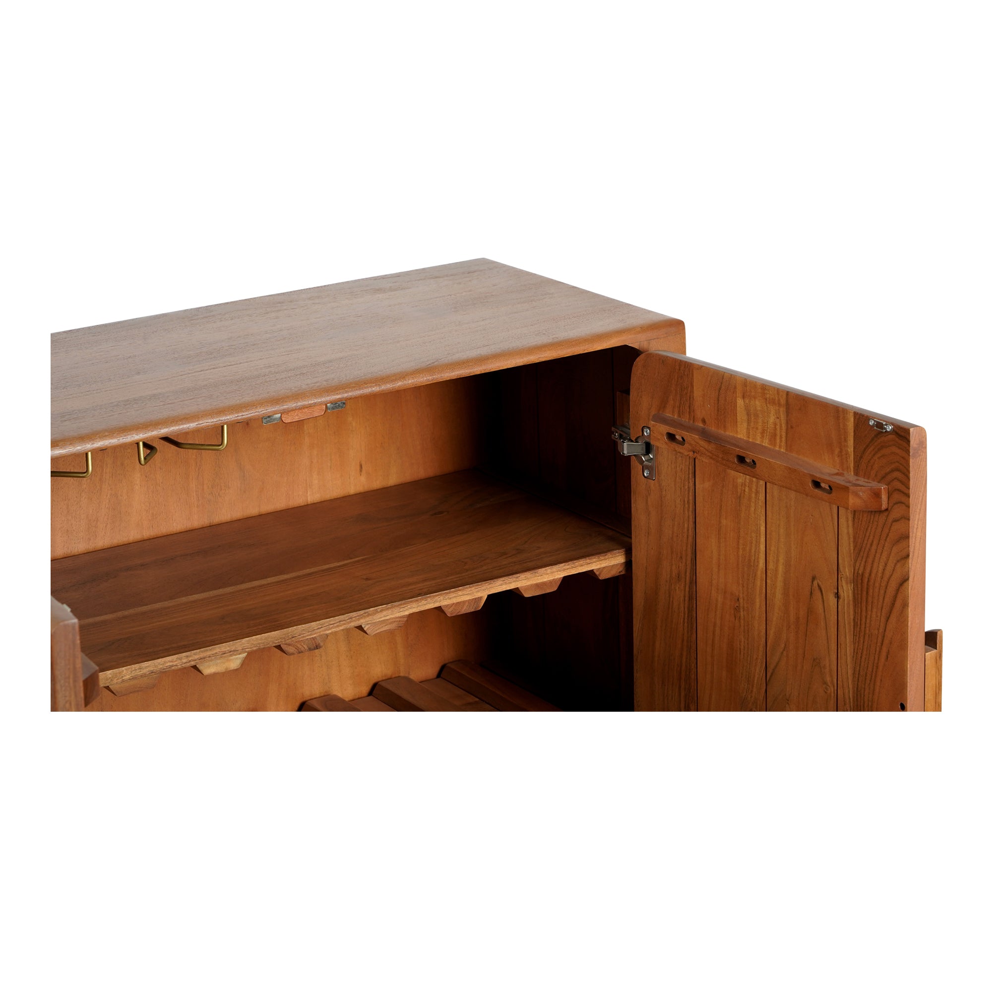 Round curved doors in a rich brown tone exude warmth and elegance in the Orson sideboard. Crafted from durable solid Acacia wood, the gentle curvature on the sides effortlessly softens the inherent charm of the hardwood. A thoughtfully designed interior features a convenient removable stem rack for hanging glasses and two reversible wine shelves.