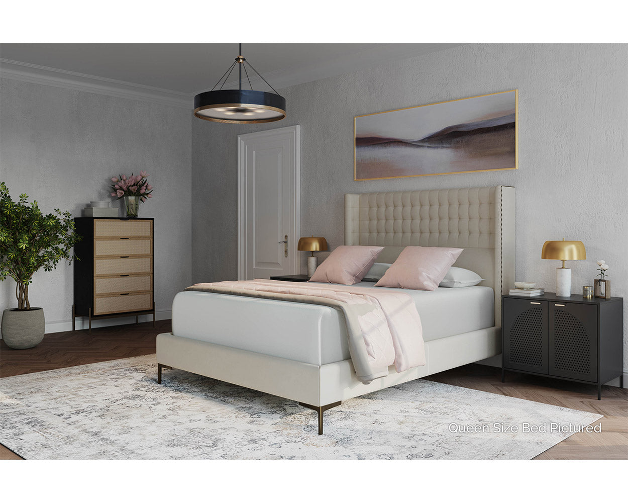 Drift to a blissful escape while resting in the Cairo bed. This design features deep tufting and a generously cushioned headrest for added comfort. Hand-hammered nail heads and antique brass legs complete the look. Stocked in antonio charcoal performance fabric and antonio porcelain performance fabric. Performance fabric is moisture repellent, durable and easy to clean. No box spring is required and folding slats are included.