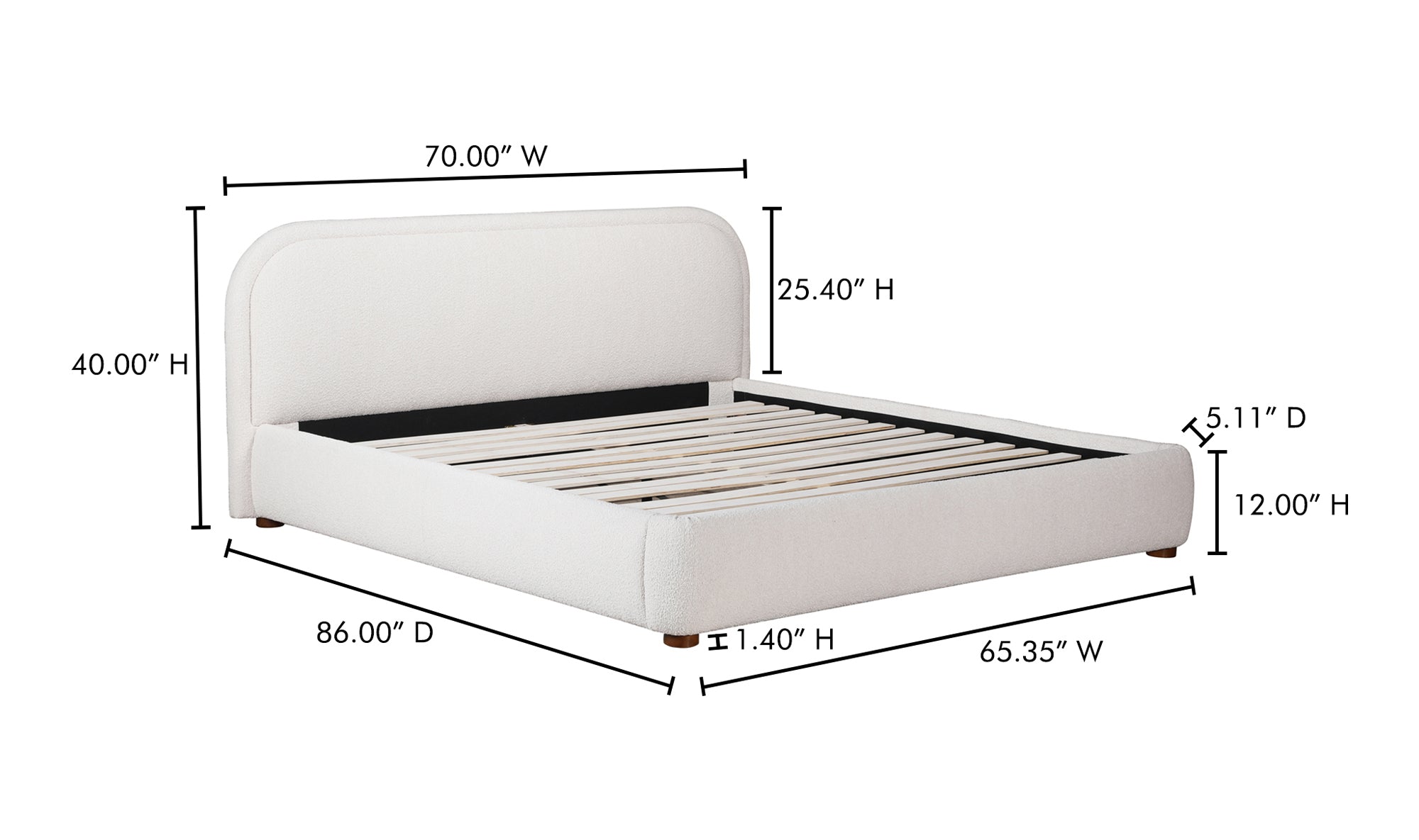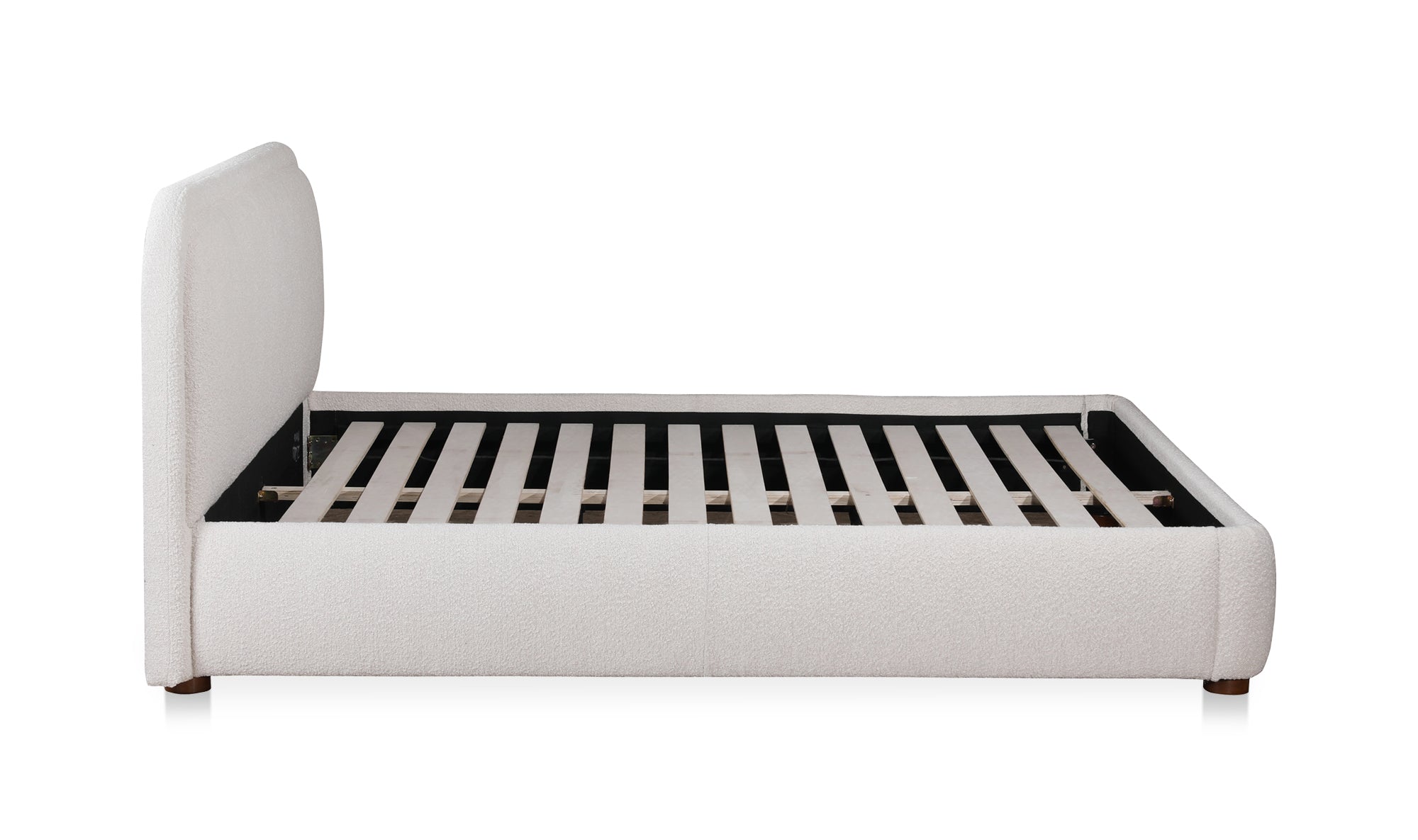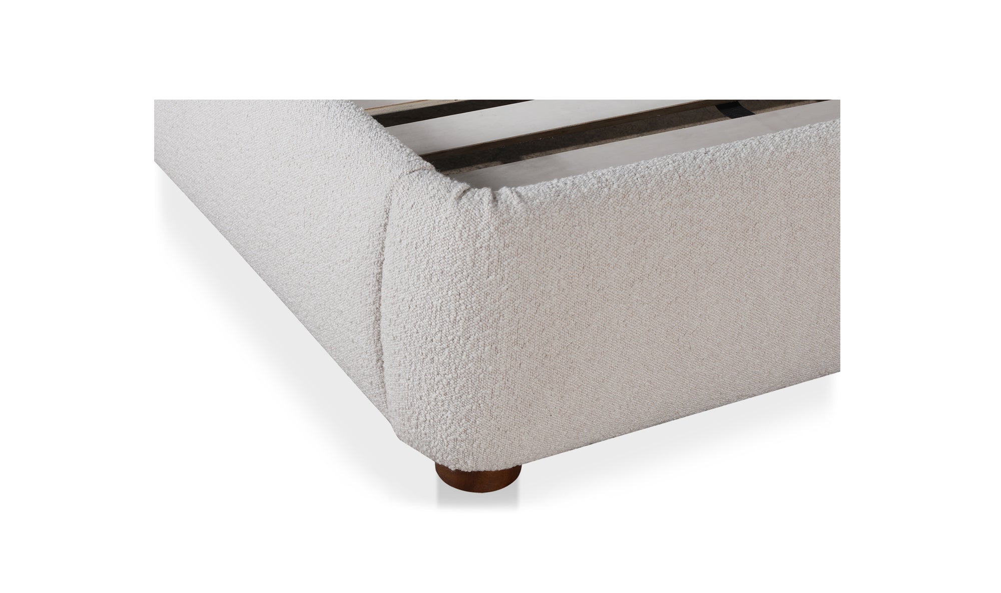 A place of pure bliss and rejuvenation. There are no sharp edges or harsh lines with the Colin bed. Both frame and headboard create a beautifully curved silhouette that's stress-free and perfectly padded in sumptuous bouclé upholstery. Made for mellow spaces and doubled down in softness, this bed's gentle lines and rounded corners will give your bedroom a sense of tranquility. Simultaneously, its dark, subtly exposed wooden post legs provide an added sense of security and stability. Practically a dreamy cloud, Colin is an inviting place of pure relaxation for the body and mind. Rest upon the Colin and watch your worries slip away.