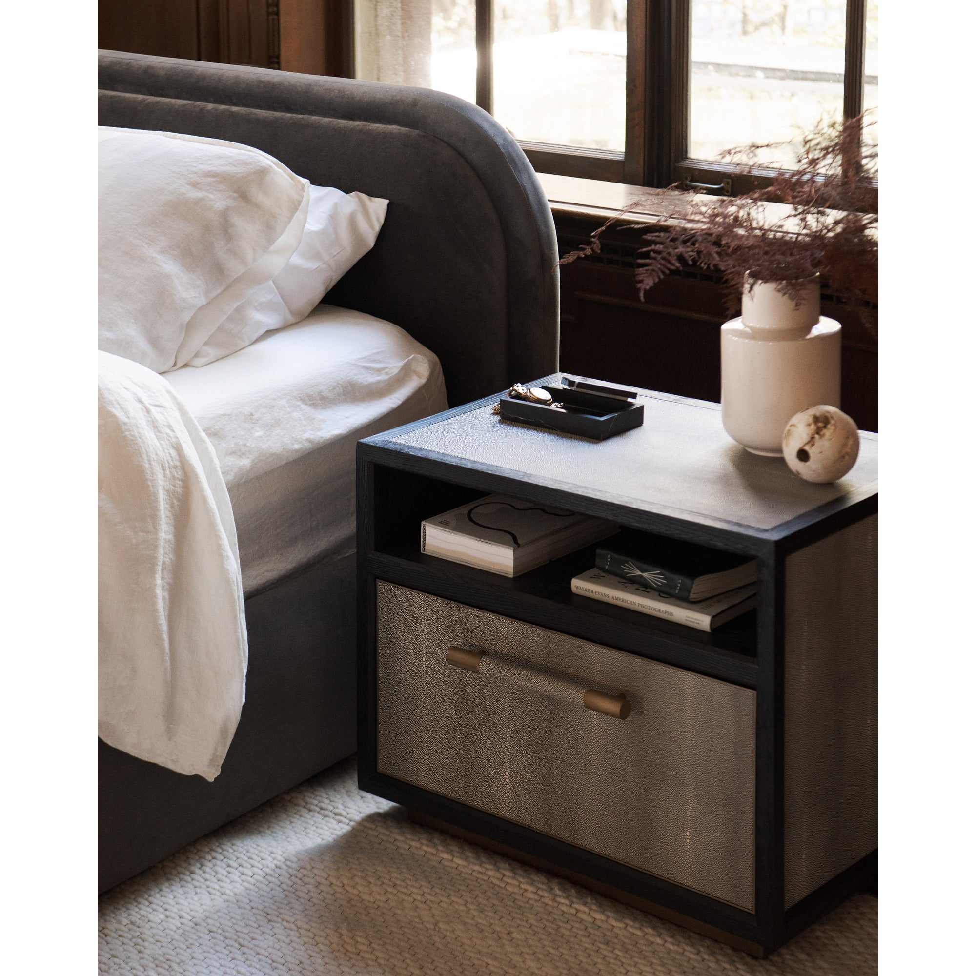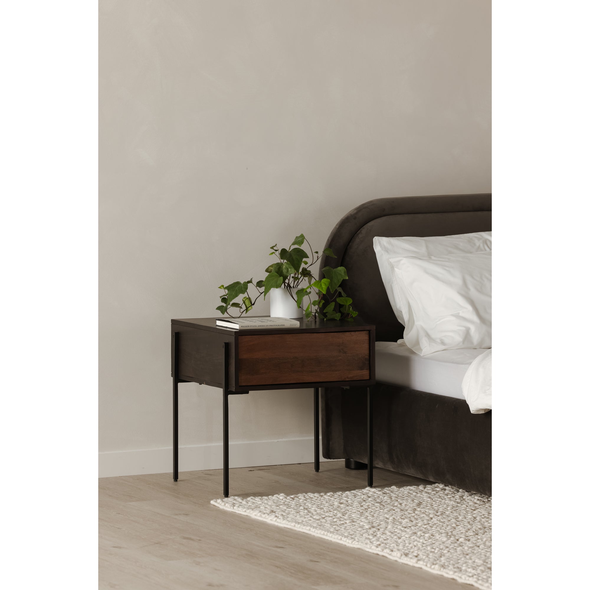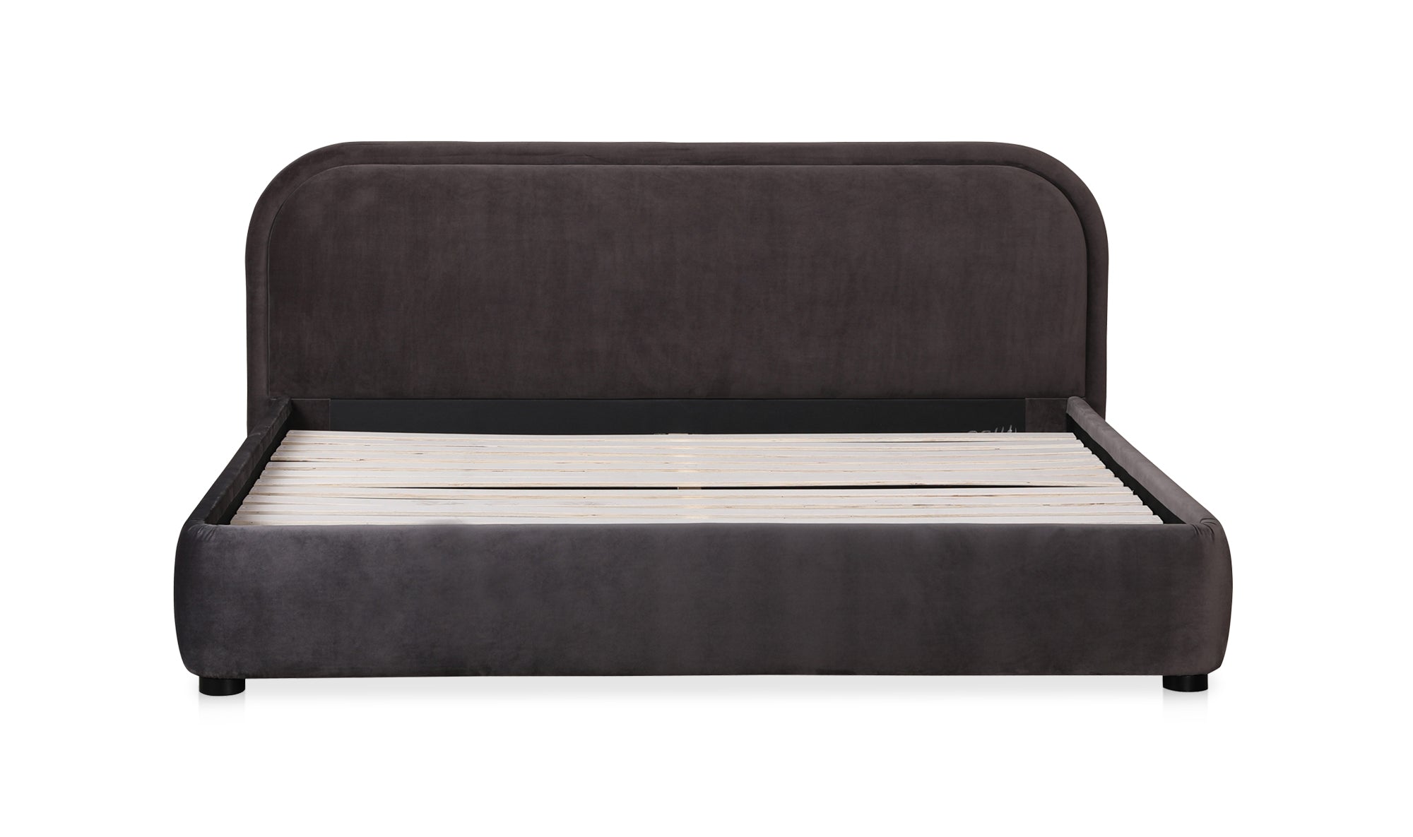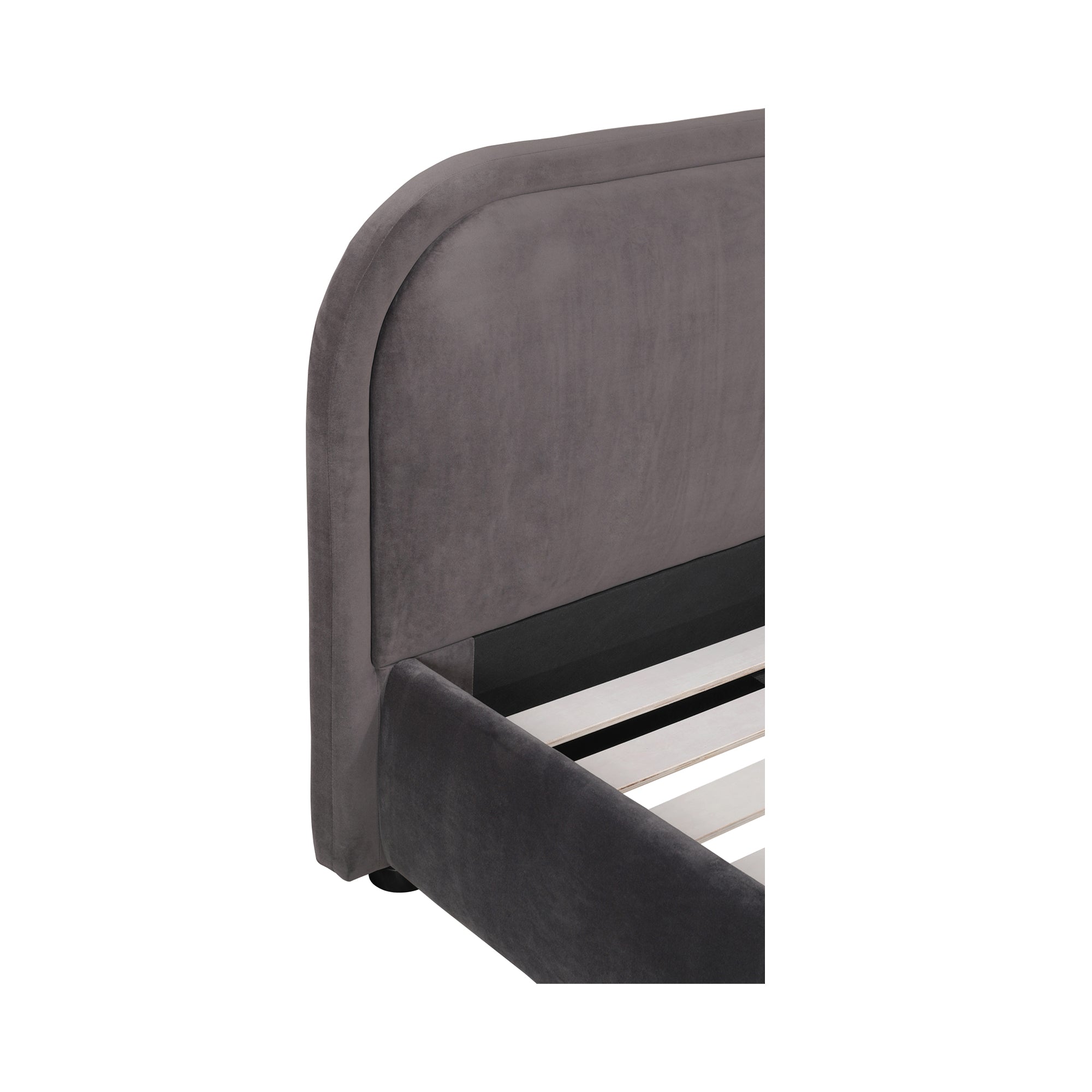 A place of pure bliss and rejuvenation. There are no sharp edges or harsh lines with the Colin bed. Both frame and headboard create a beautifully curved silhouette that's stress-free and perfectly padded in sumptuous bouclé upholstery. Made for mellow spaces and doubled down in softness, this bed's gentle lines and rounded corners will give your bedroom a sense of tranquility. Simultaneously, its dark, subtly exposed wooden post legs provide an added sense of security and stability. Practically a dreamy cloud, Colin is an inviting place of pure relaxation for the body and mind. Rest upon the Colin and watch your worries slip away.