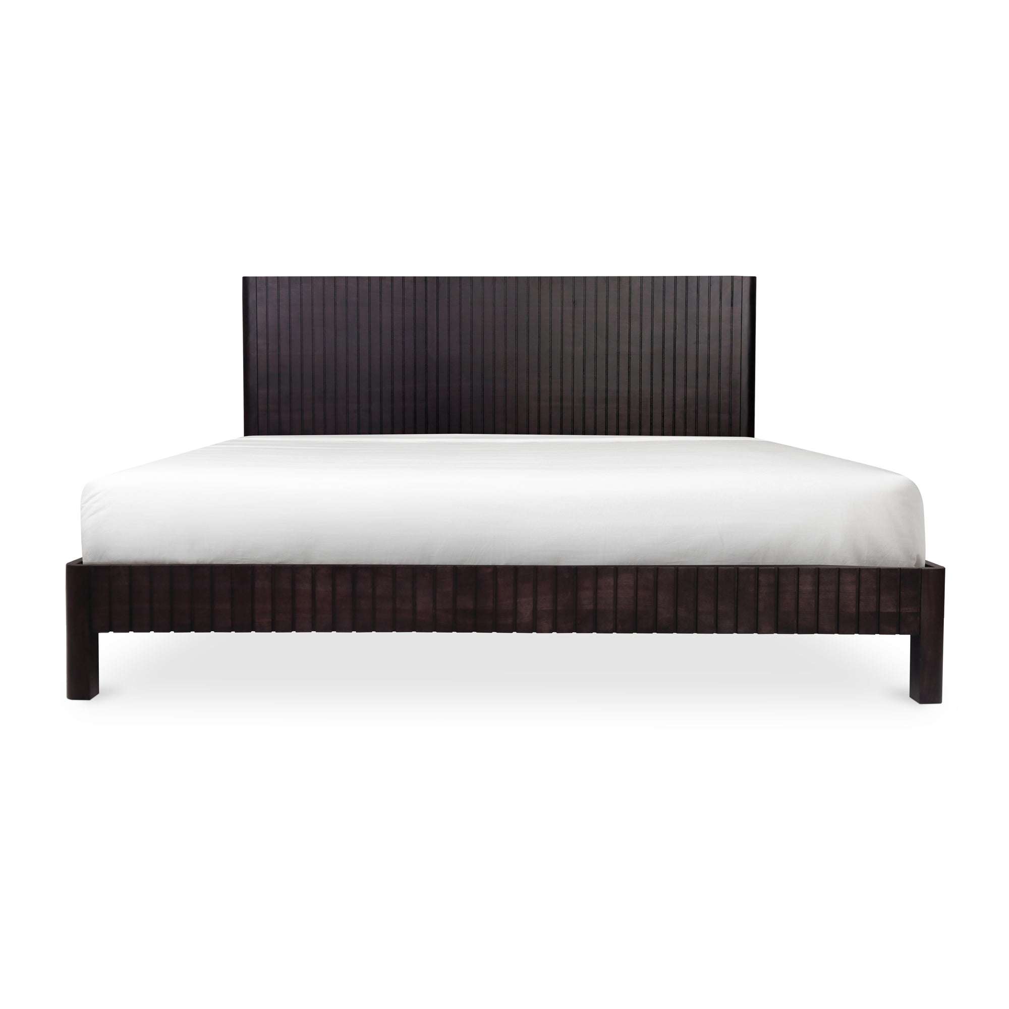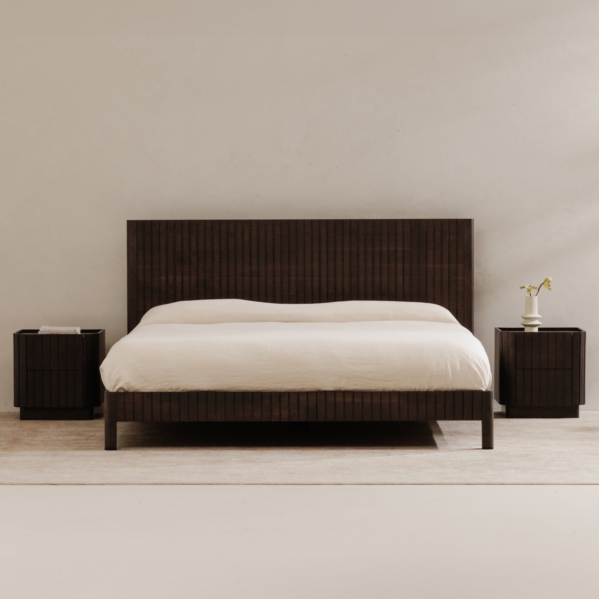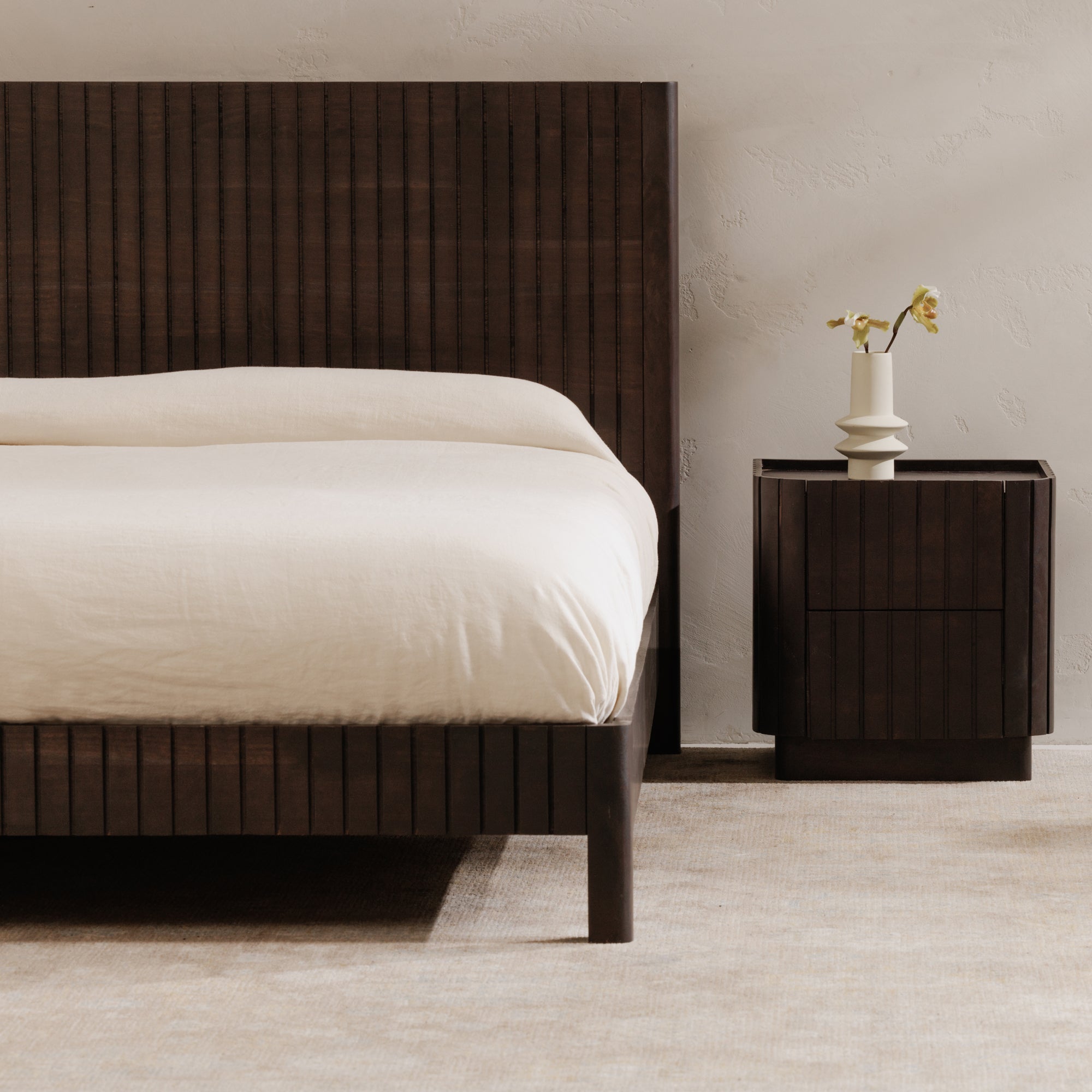 The Povera bed balances detail and form offering bold statement appeal and comfort. This piece anchors the bedroom with its black Acacia façade’s gentle ribbing reminiscent of ripples and waves, adding texture and warmth. Naturally beautiful with an impactful silhouette, a timeless testament to craft and artistry.
