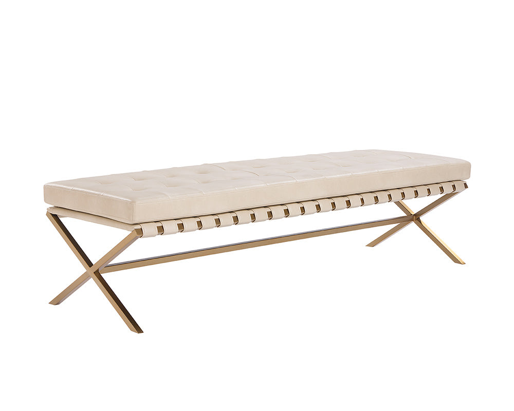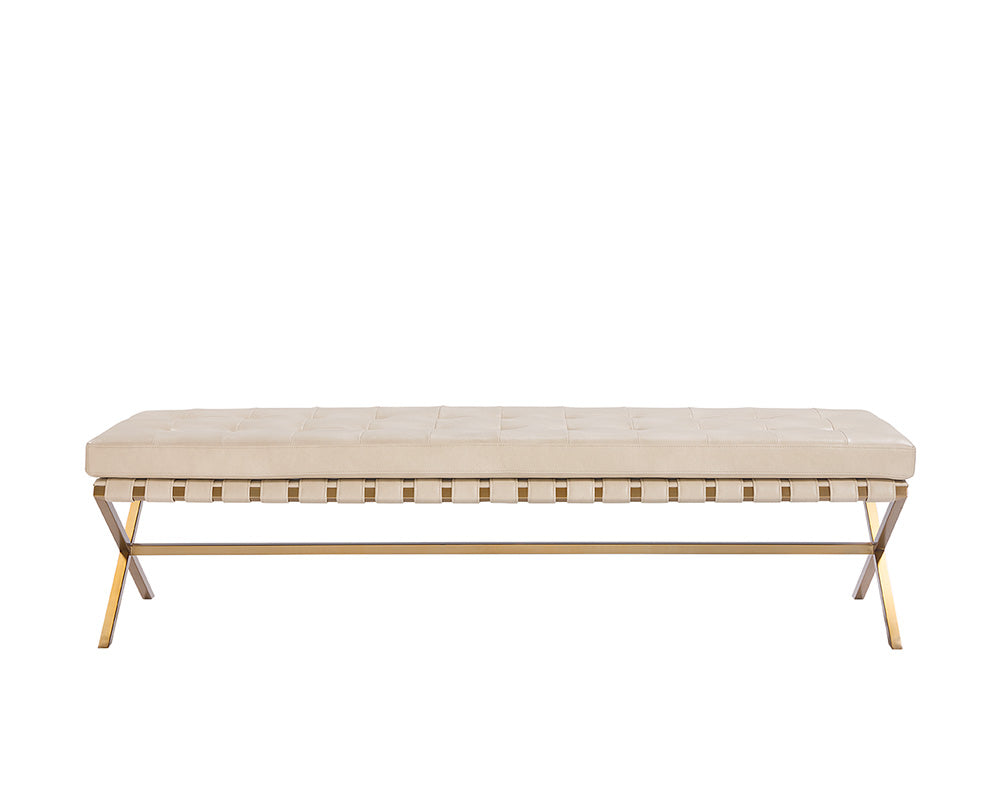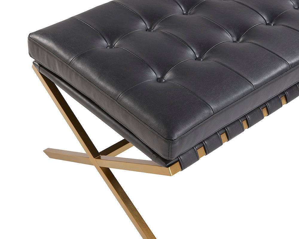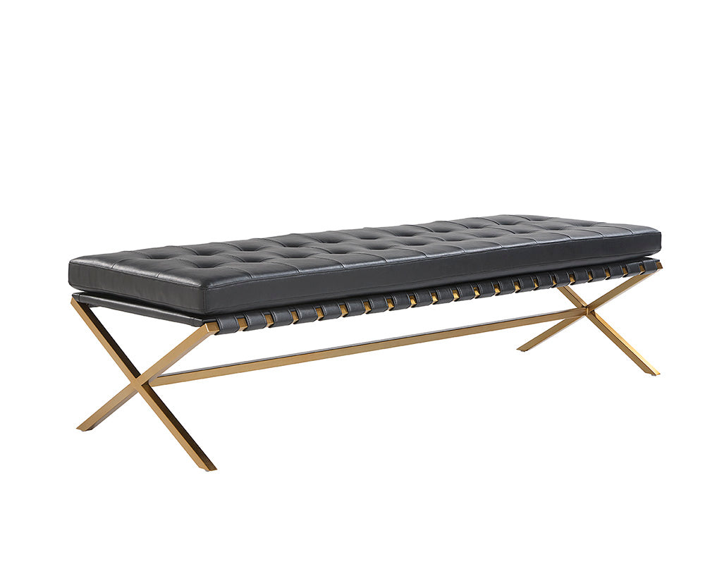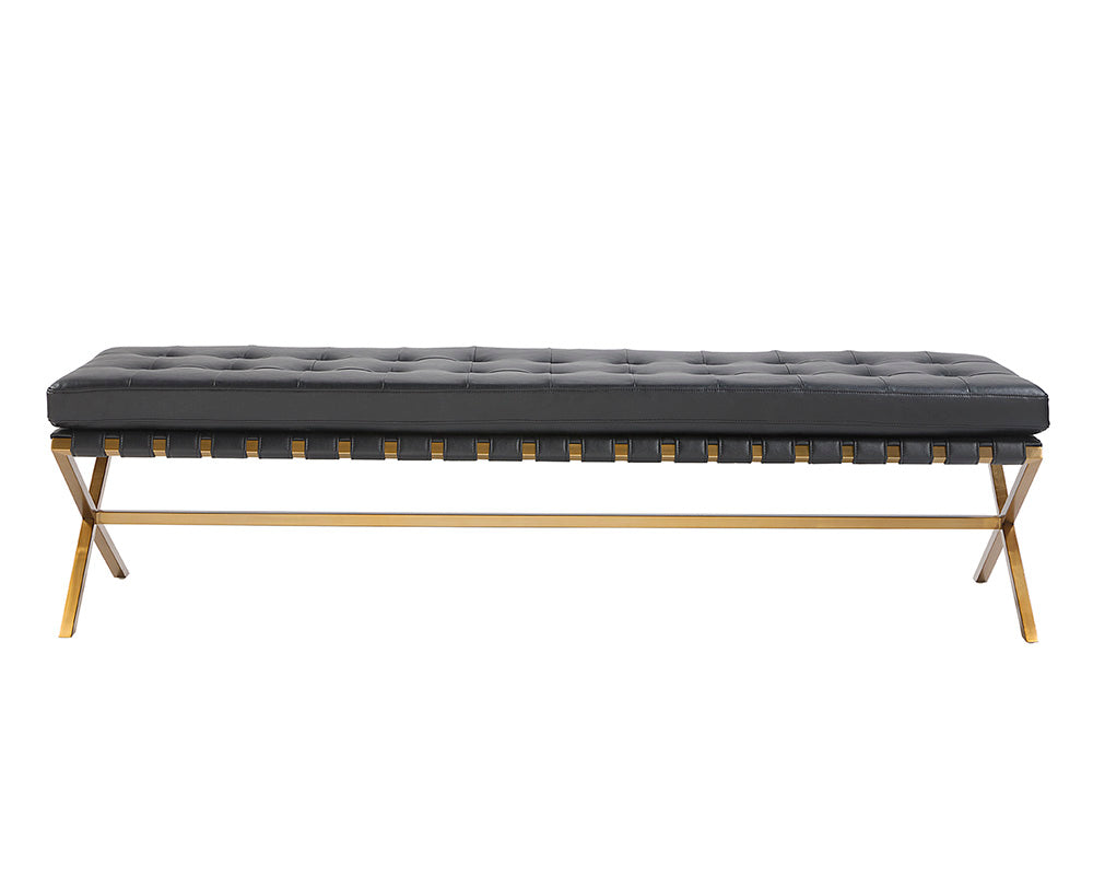 This transitional bench offers comfort and style to living and lounge spaces, bedrooms and more. Features a trestle style black stainless steel frame and completed with a button tufted seat. Stocked in mina light grey fabric. Also available in bravo black and cream faux leathers with a gold stainless steel frame.