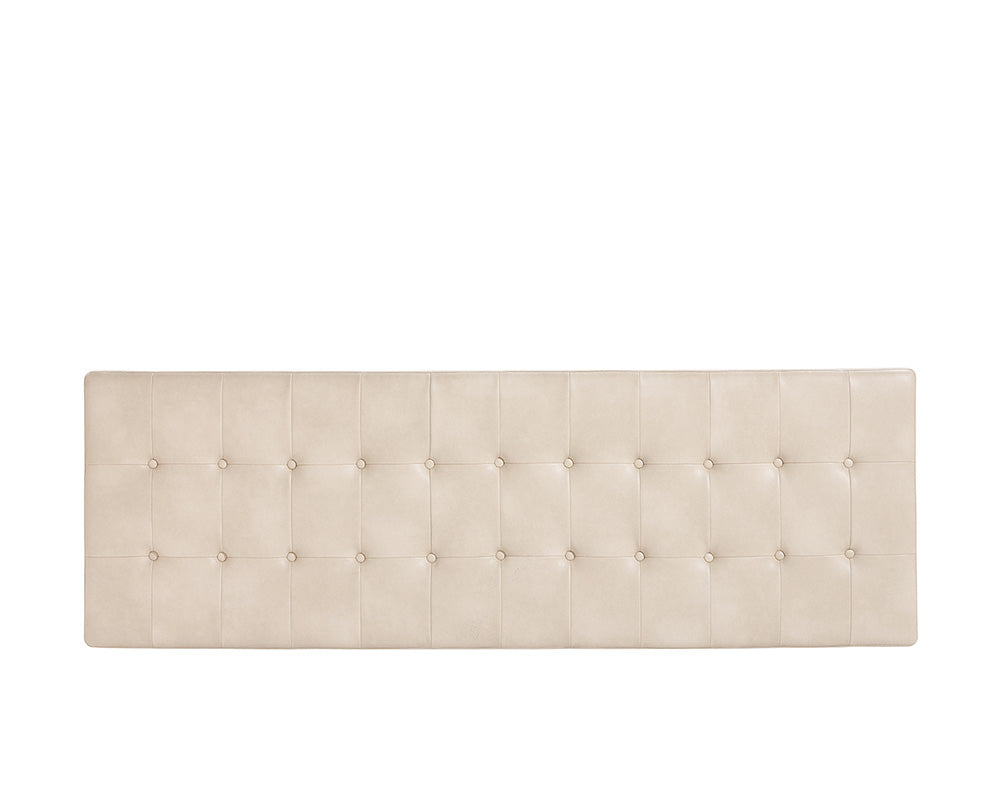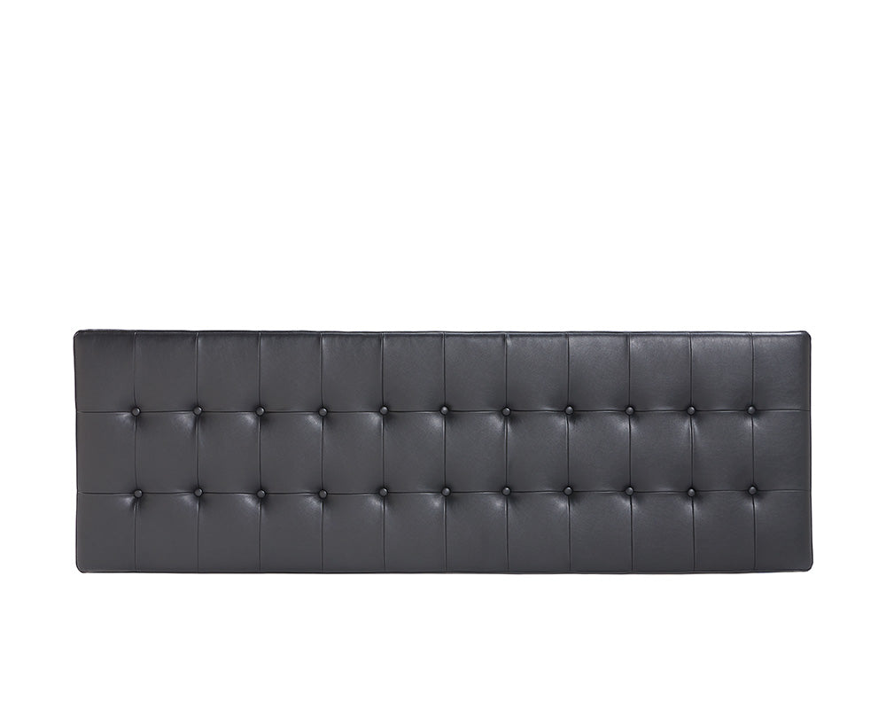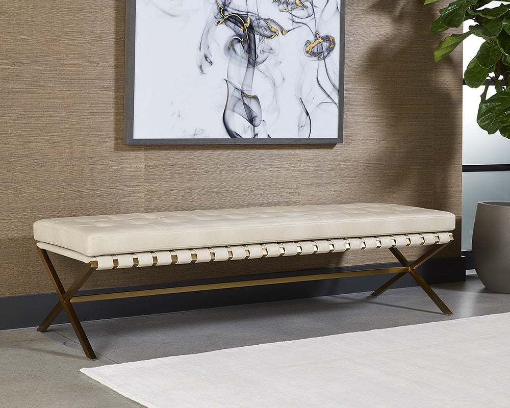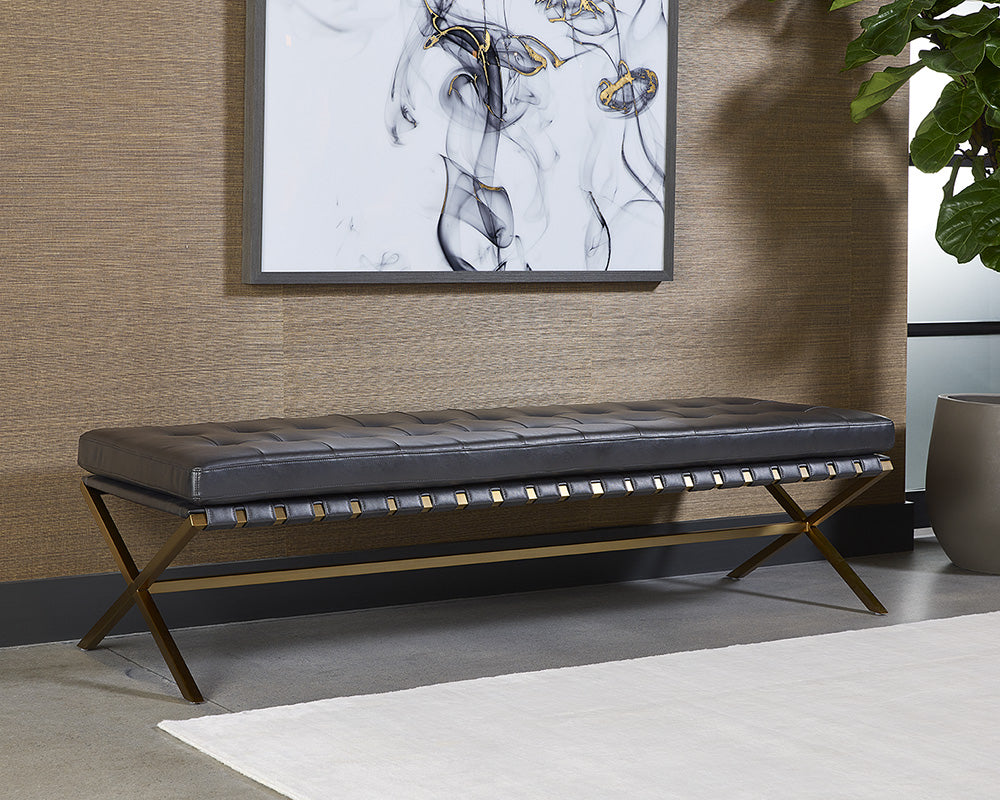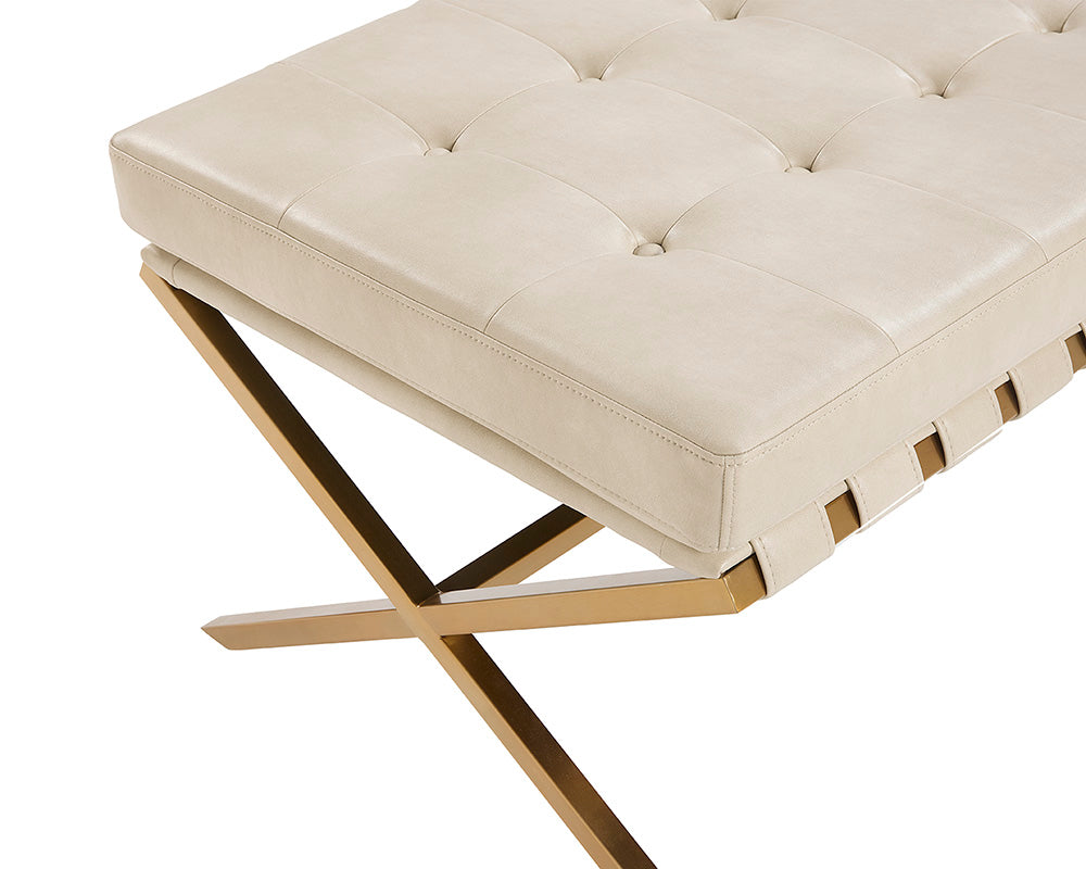 This transitional bench offers comfort and style to living and lounge spaces, bedrooms and more. Features a trestle style black stainless steel frame and completed with a button tufted seat. Stocked in mina light grey fabric. Also available in bravo black and cream faux leathers with a gold stainless steel frame.