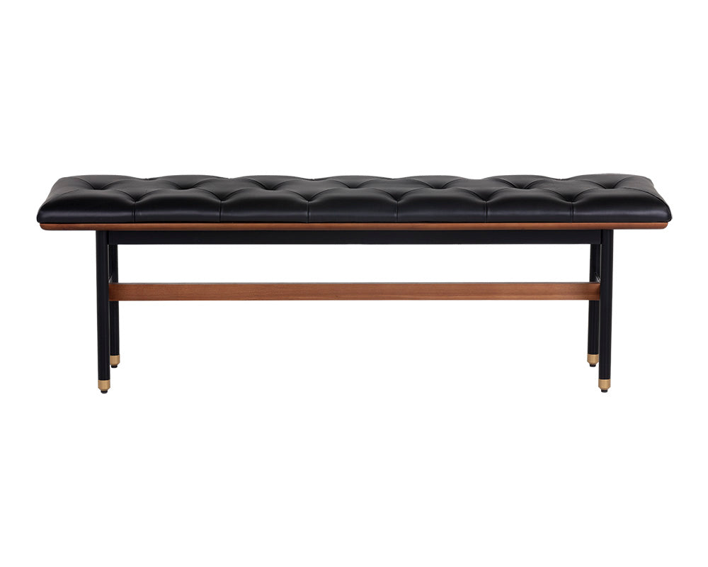 Sophisticated and timeless, this mid-century modern bench includes beautiful button tufting on the seat. Stocked in black faux leather and paired with a black steel base. Features an accenting solid walnut timber frame and beam on the base. Brass metal caps complete the look. Also available in vienna cream fabric. Handle With Care: This design has been crafted with faux leather. Faux leather is manufactured to reflect the natural characteristics of leather; as such, colour variations, markings, wrinkles, grooves, and light scratches are appreciated characteristics. No two pieces will be alike. Visit our Product Care page for more information on how to ensure the lasting beauty of this piece.