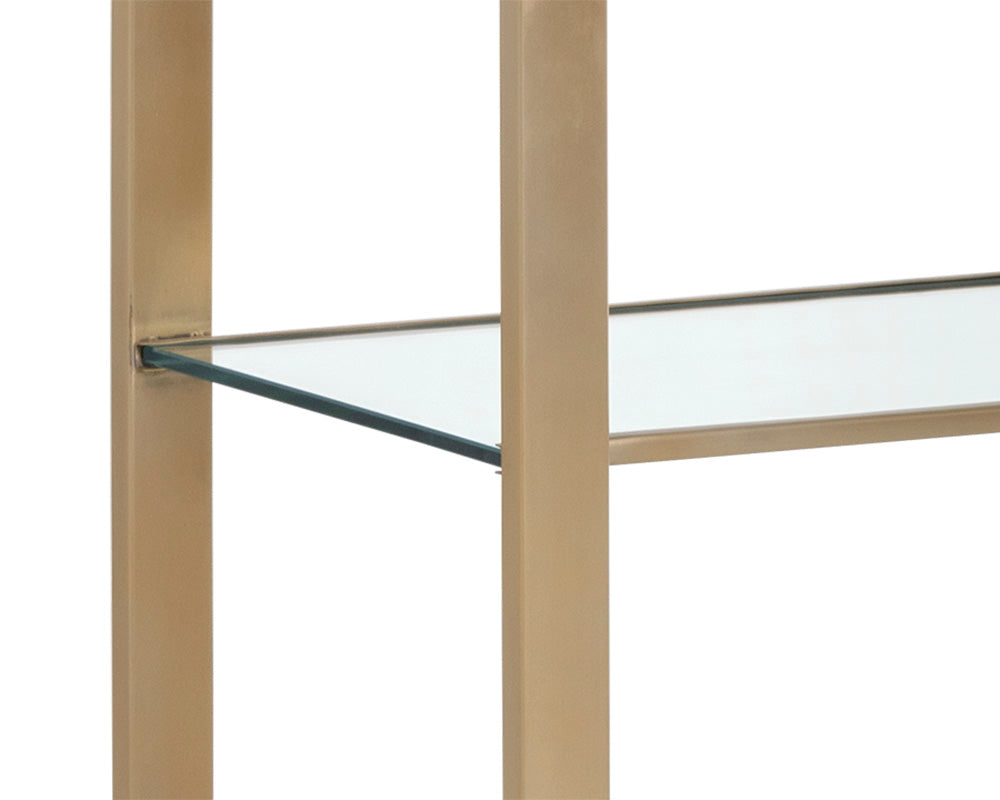 This large, modern bookcase will bring elegance and sophistication to home office, living, lounge spaces and more. Features four smoked glass shelves with brushed gold rails and a mirrored bottom shelf for ample storage and a round edge frame in black stainless steel. Also available in four clear glass shelves and a mirrored bottom shelf for ample storage and a round edge frame in brushed gold stainless steel.. Can be paired with coordinating end table. Available in small size as well. Made in India: With refined craftsmanship, this design was brought to life by skilled local artisans. By nature, these materials develop unique imperfections such as fissures, markings and colour variations for a truly one-of-a-kind piece.