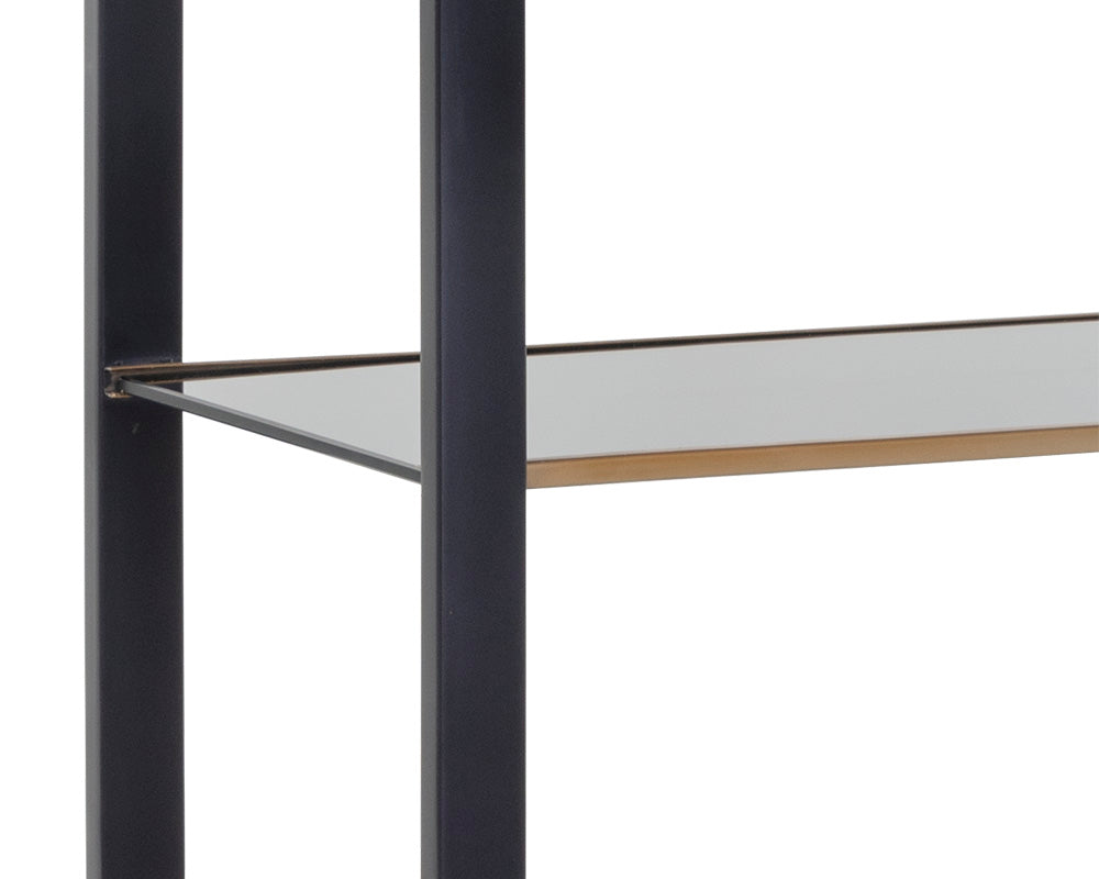 This modern bookcase will bring elegance and sophistication to home office, living, lounge spaces and more. Features four smoked glass shelves with brushed gold rails and a mirrored bottom shelf for ample storage and eatures a round edge frame in black stainless steel. Also available in four clear glass shelves and a mirrored bottom shelf for ample storage and features a round edge frame in brushed gold stainless steel. Coordinating end table also available. Made in India: With refined craftsmanship, this design was brought to life by skilled local artisans. By nature, these materials develop unique imperfections such as fissures, markings and colour variations for a truly one-of-a-kind piece.