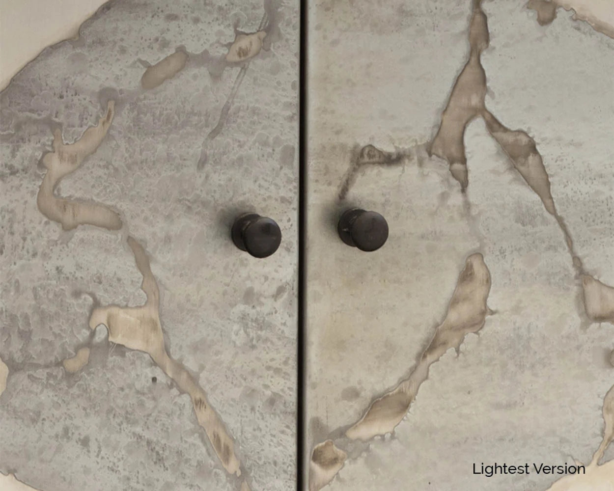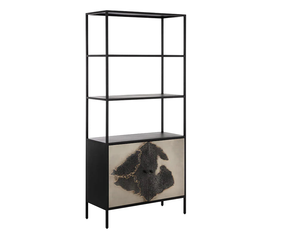 Make a bold statement with this unique bookcase. Cabinet feature a one-of-a-kind patina finish, boldly contrasted with a black iron frame. Made in India. With refined craftsmanship, this design was brought to life by skilled local artisans. By nature, these materials develop unique imperfections such as markings and colour variations for a truly one-of-a-kind piece. Pictures shown reflect the lightest and darkest variations of our Arlington patina finish. Actual product may range between these finishes.