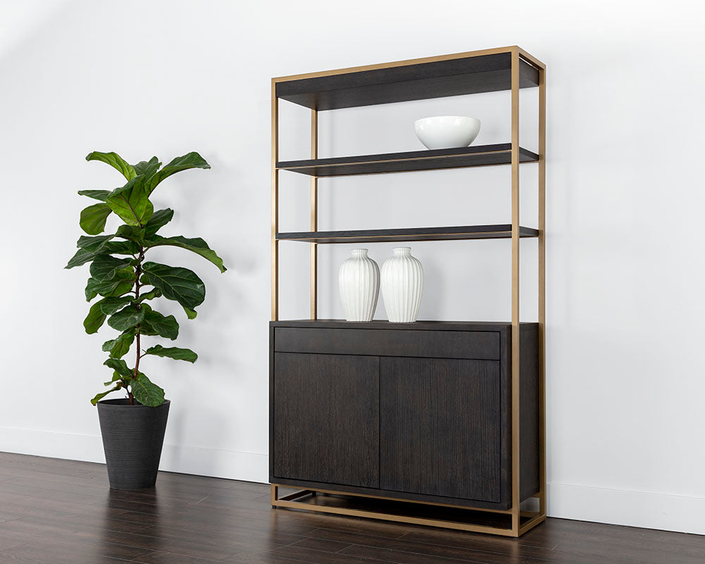 Classic style meets modern edge with this handsome bookcase. Make a statement with its bold, powder coated steel frame in a rustic bronze finish. The base and shelves are made with a wooden oak veneer in grey. Anti-tipping kit included.