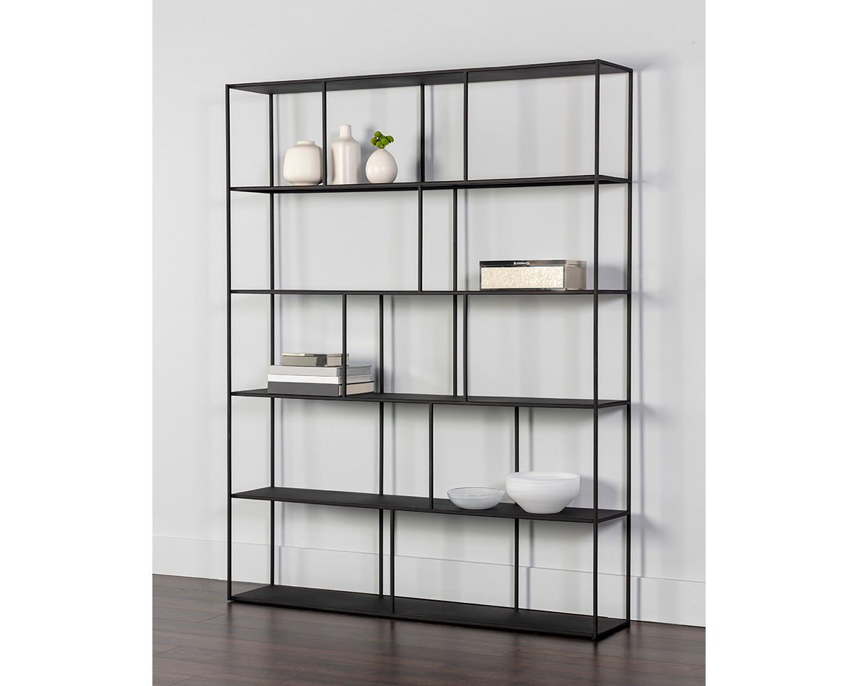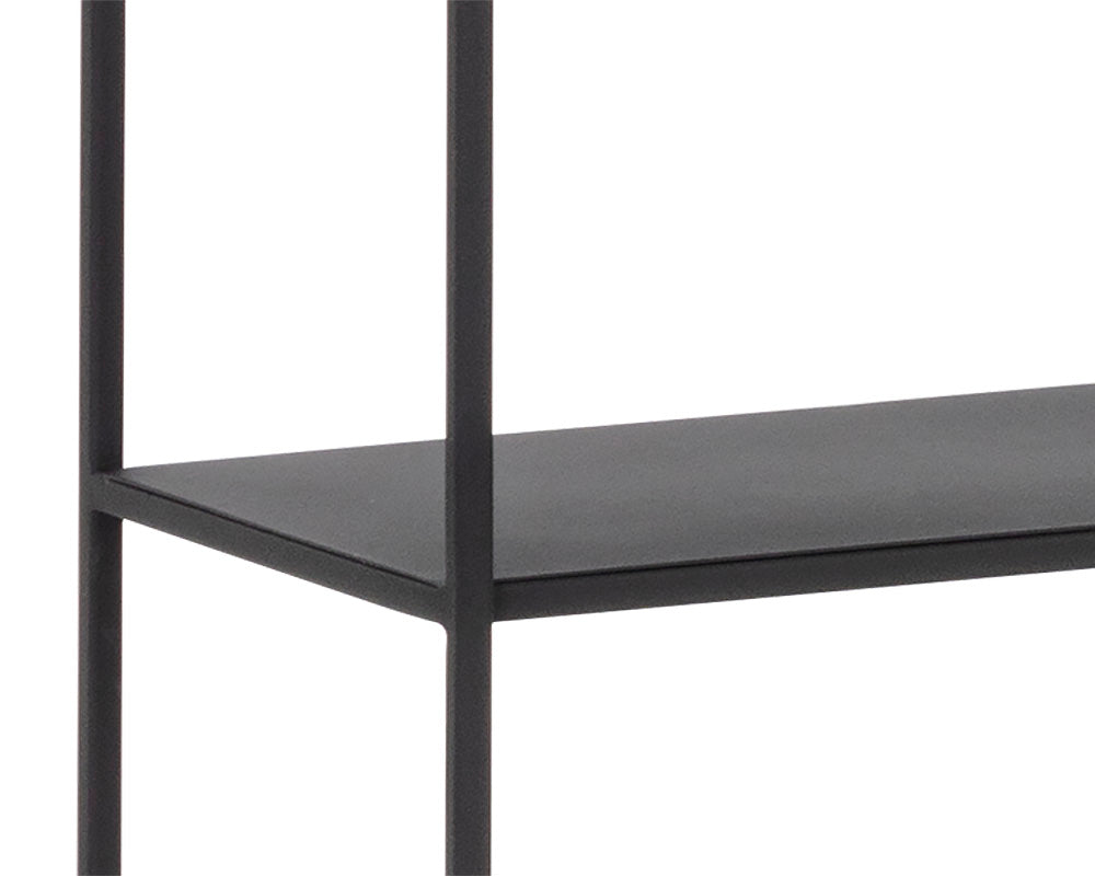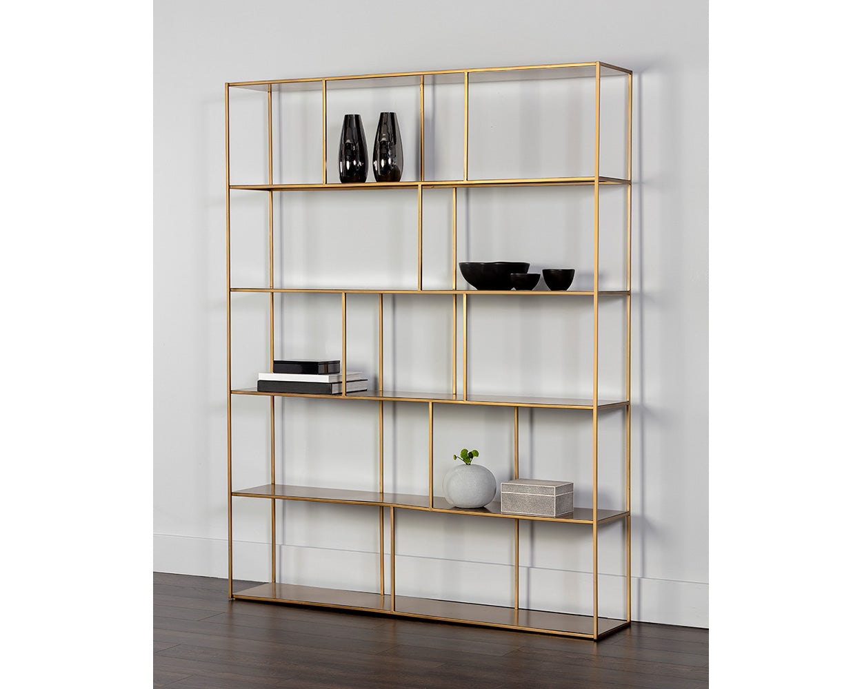 Add style and warmth to living and office spaces with this well-designed iron bookcase in a antique brass or matte black finish. Can be placed in pairs or multiples for added impact and functionality. Also available in a smaller size. Anti-tipping kit included.