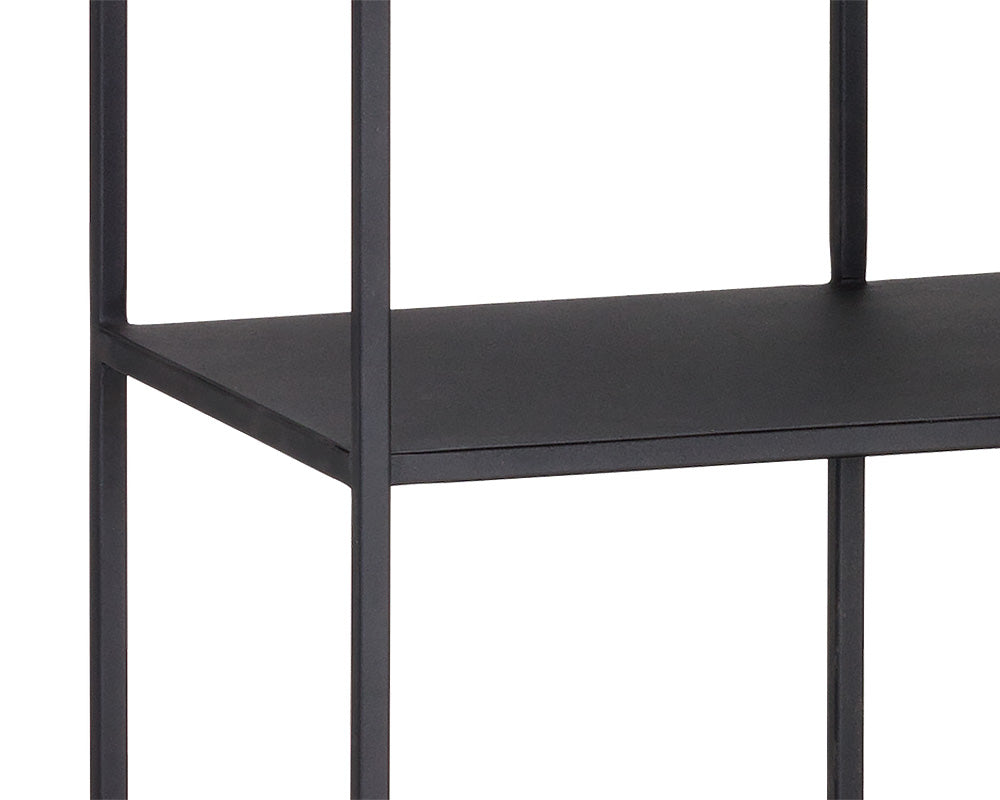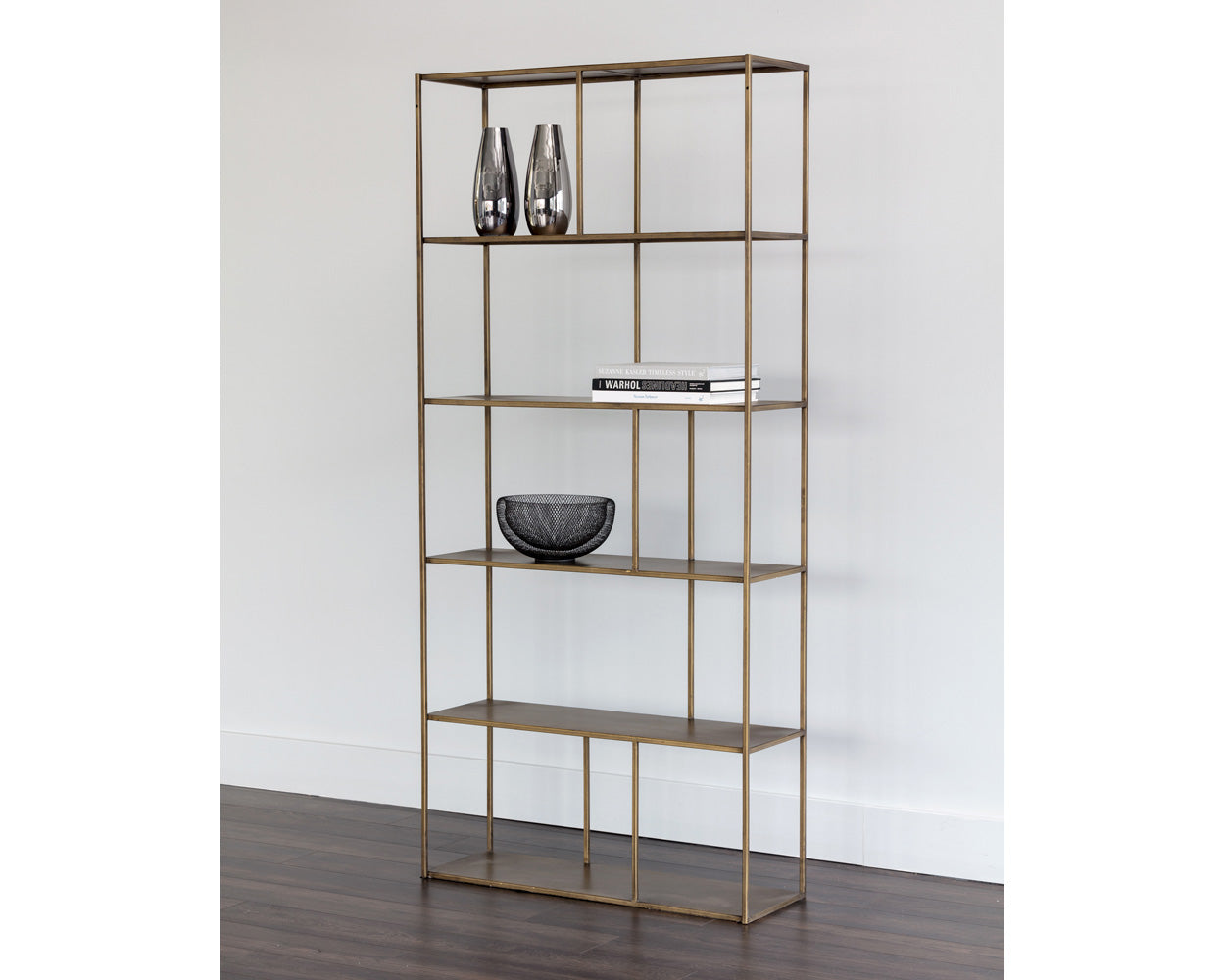 Add style and warmth to living and office spaces with this well-designed iron bookcase in a brushed antique brass or matte black finish. Can be placed in pairs or multiples for added impact and functionality. Also available in a smaller size. Anti-tipping kit included.