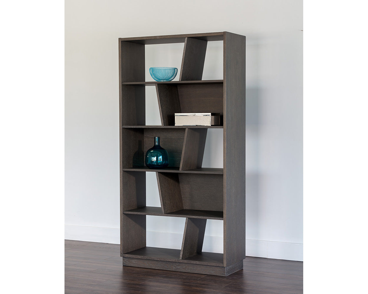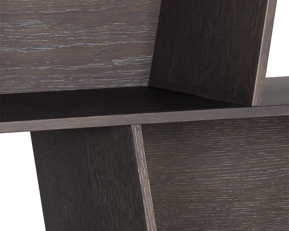 This bold and contemporary bookcase will bring a sense of movement and drama to living, lounge and office spaces. Crafted with solid oak wood and oak veneer with a charcoal grey finish, this bookcase features staggered shelving for ample storage. Pair in multiples for a unique effect. Anti-tipping kit included. Also available in a rustic oak finish.