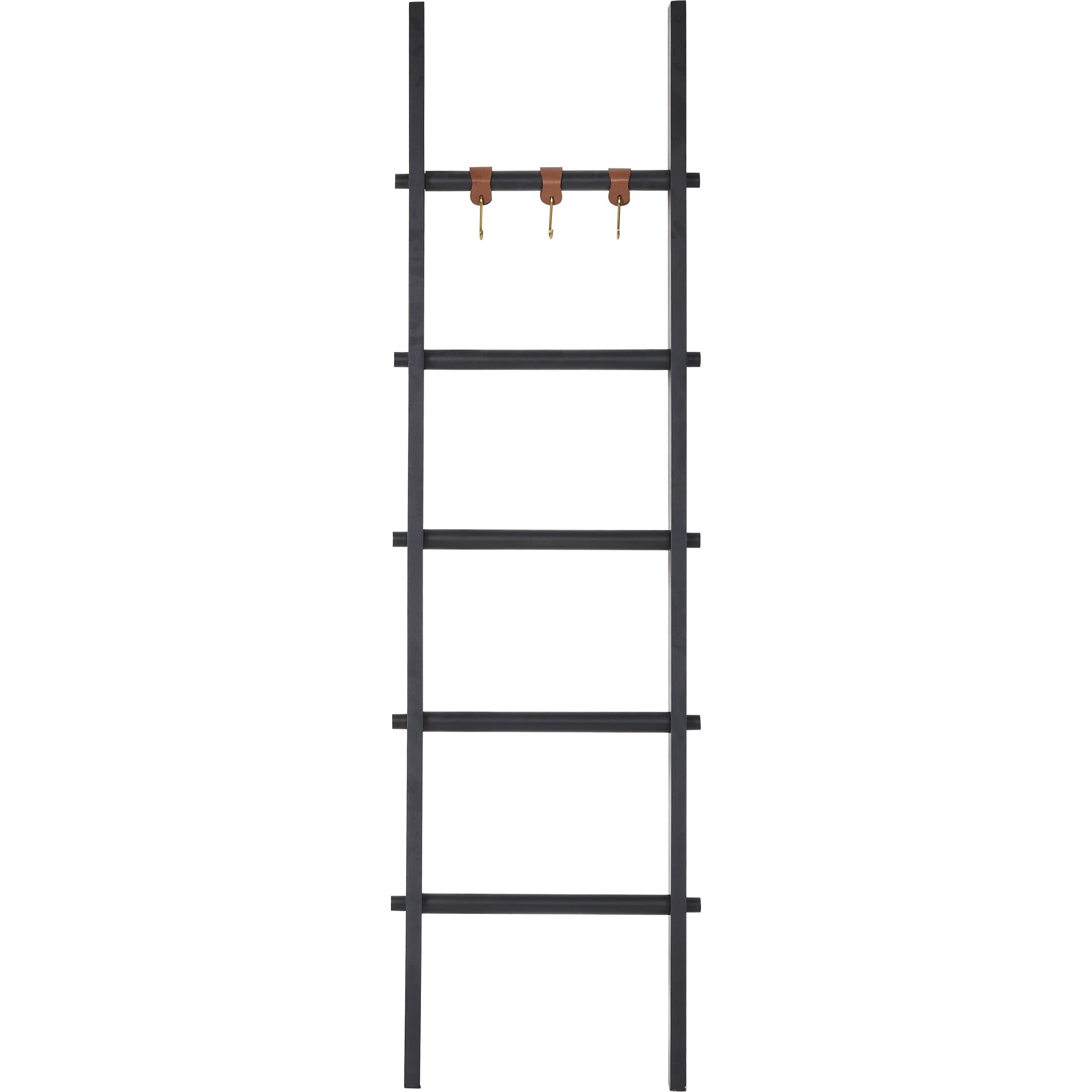 The ultimate comfort accessory finds its organizational match in this decorative ladder. Fit for the mid-century modern or industrial interior, its black painted mango wood build, cognac-toned leather straps and antique brass-plated aluminum hooks become a trifecta of style within the space. Whether holding throw blankets or standing solitary, its grand 72-inch-tall frame, creates a lasting impression at every pass.