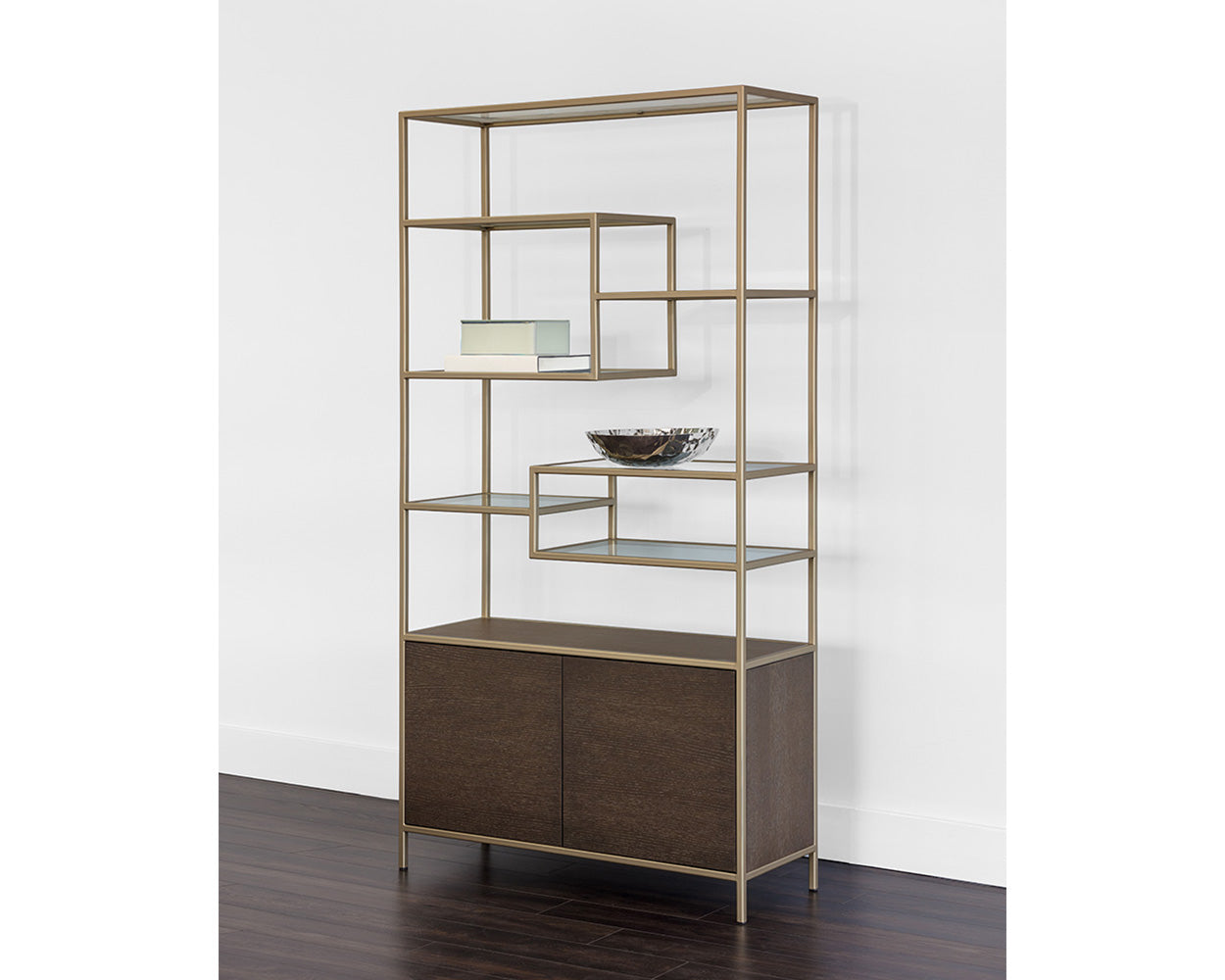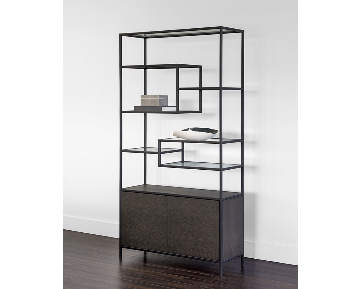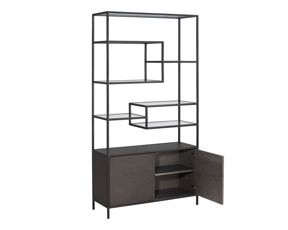 A trifecta of materials comes together in this modern bookcase. Crafted in Indonesia, the base features charcoal grey oak wood with a surrounding black iron frame. Completed with sleek glass shelves and two cabinets for added style and function. Create a stylish living or office space by pairing with coordinating desk. Also available in raw umber brown oak wood with a surrounding gold iron frame.