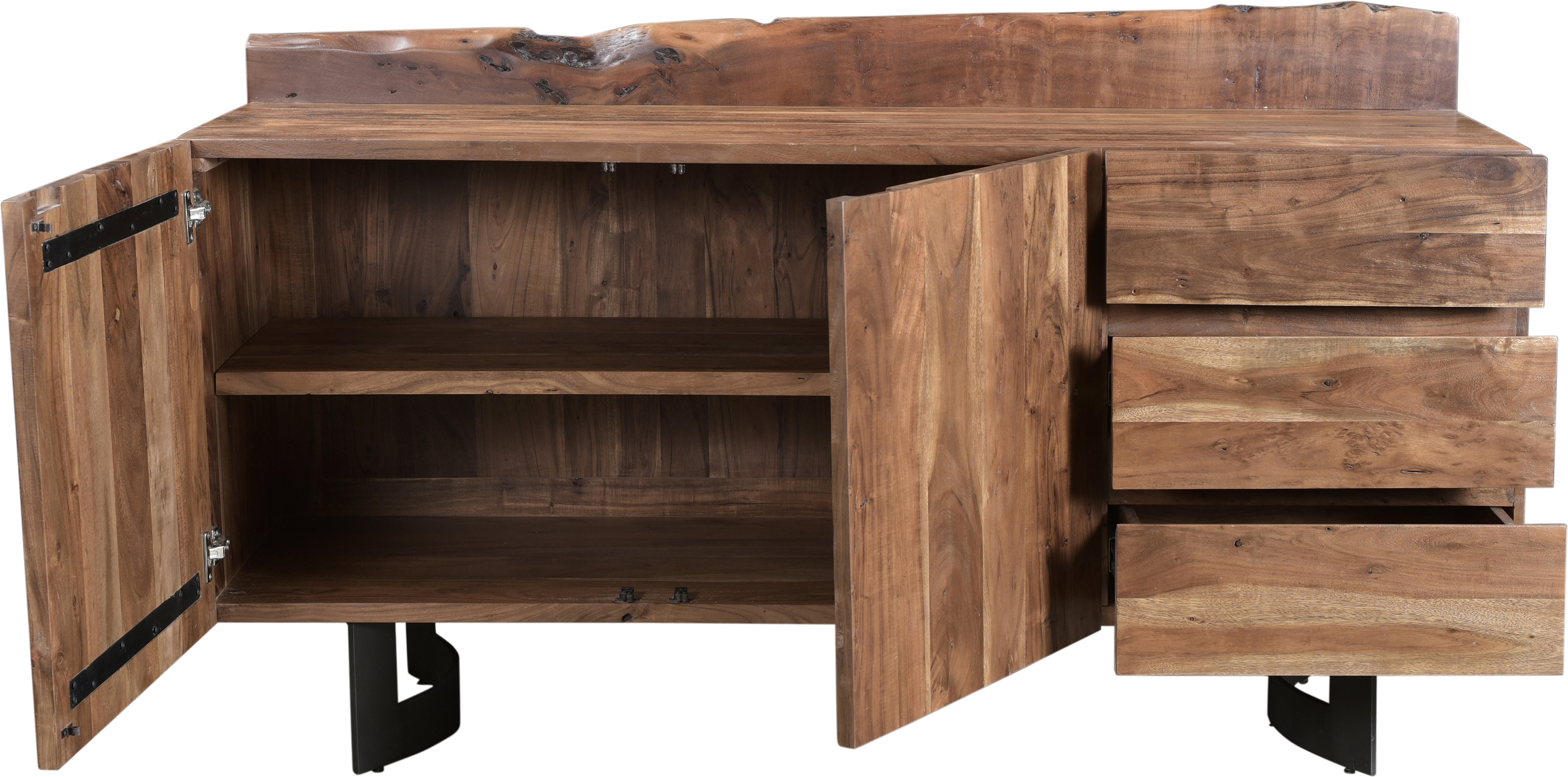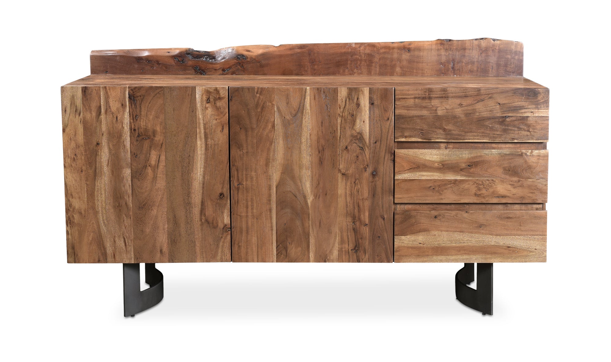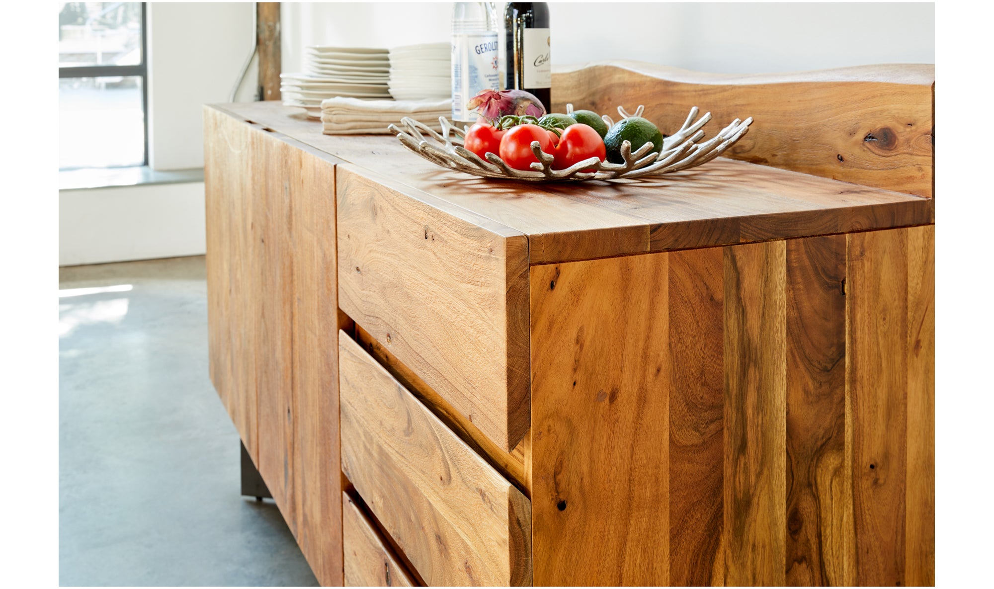 The Bent collection puts nature’s craft front and center. Made of beautiful solid acacia wood, rustic live edge detailing shows off the unique knots and whorls of the wood. Two doors and side-mounted drawers all open to reveal ample storage in this gorgeous buffet. The perfect sideboard for your dining utensils, it can also serve as a console table or storage cabinet. Pair with other pieces in the Bent collection for a complete look.