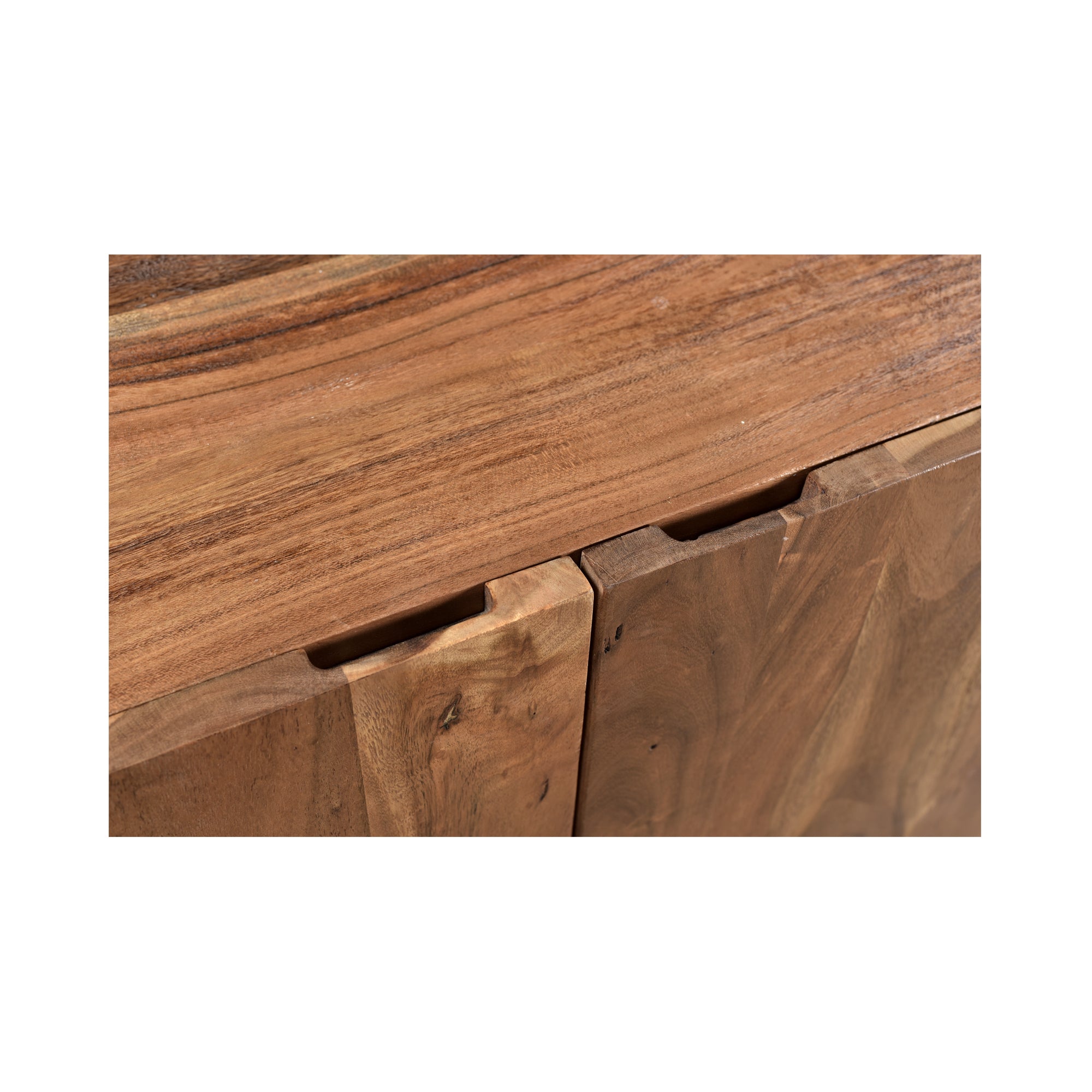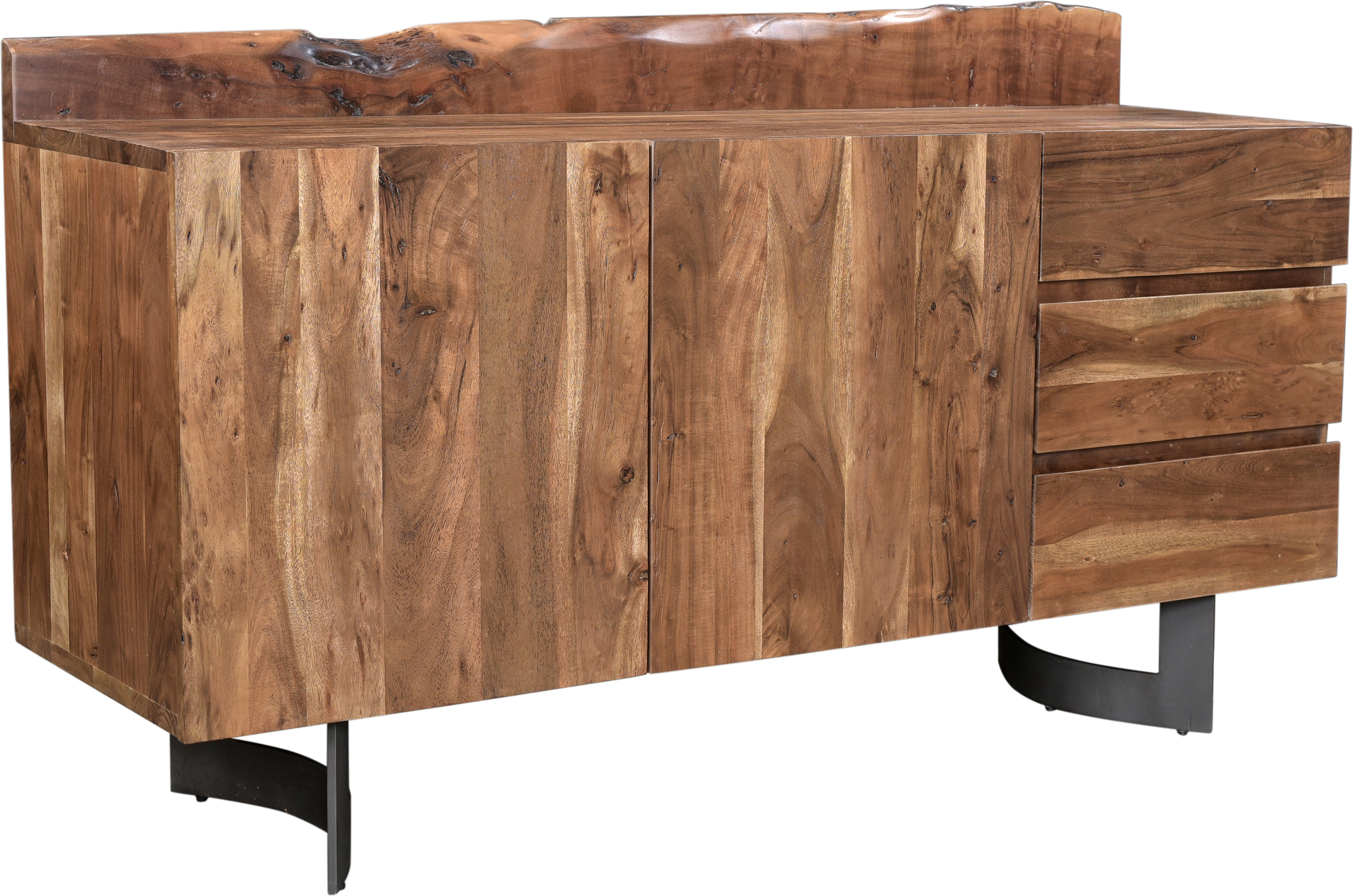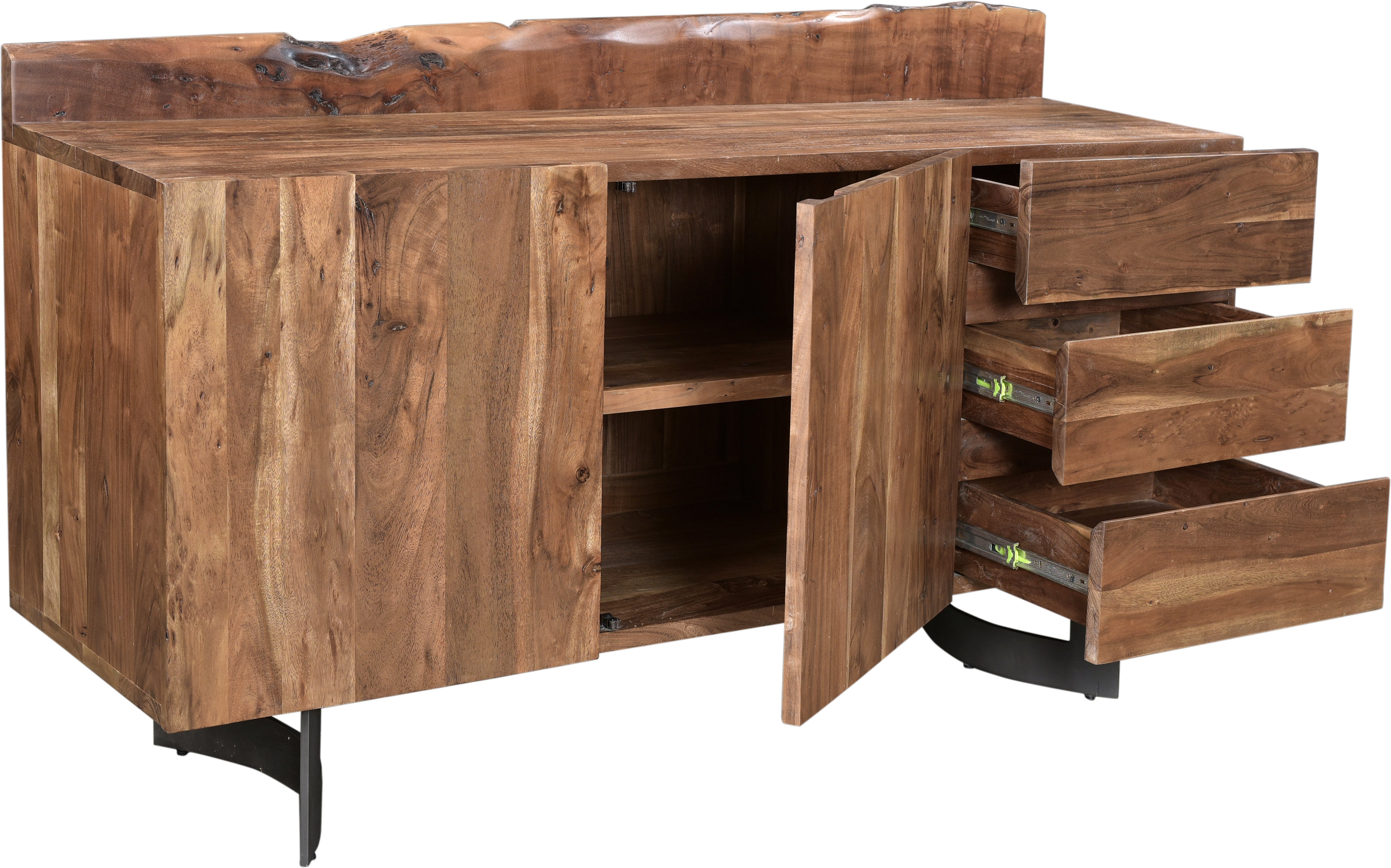 The Bent collection puts nature’s craft front and center. Made of beautiful solid acacia wood, rustic live edge detailing shows off the unique knots and whorls of the wood. Two doors and side-mounted drawers all open to reveal ample storage in this gorgeous buffet. The perfect sideboard for your dining utensils, it can also serve as a console table or storage cabinet. Pair with other pieces in the Bent collection for a complete look.