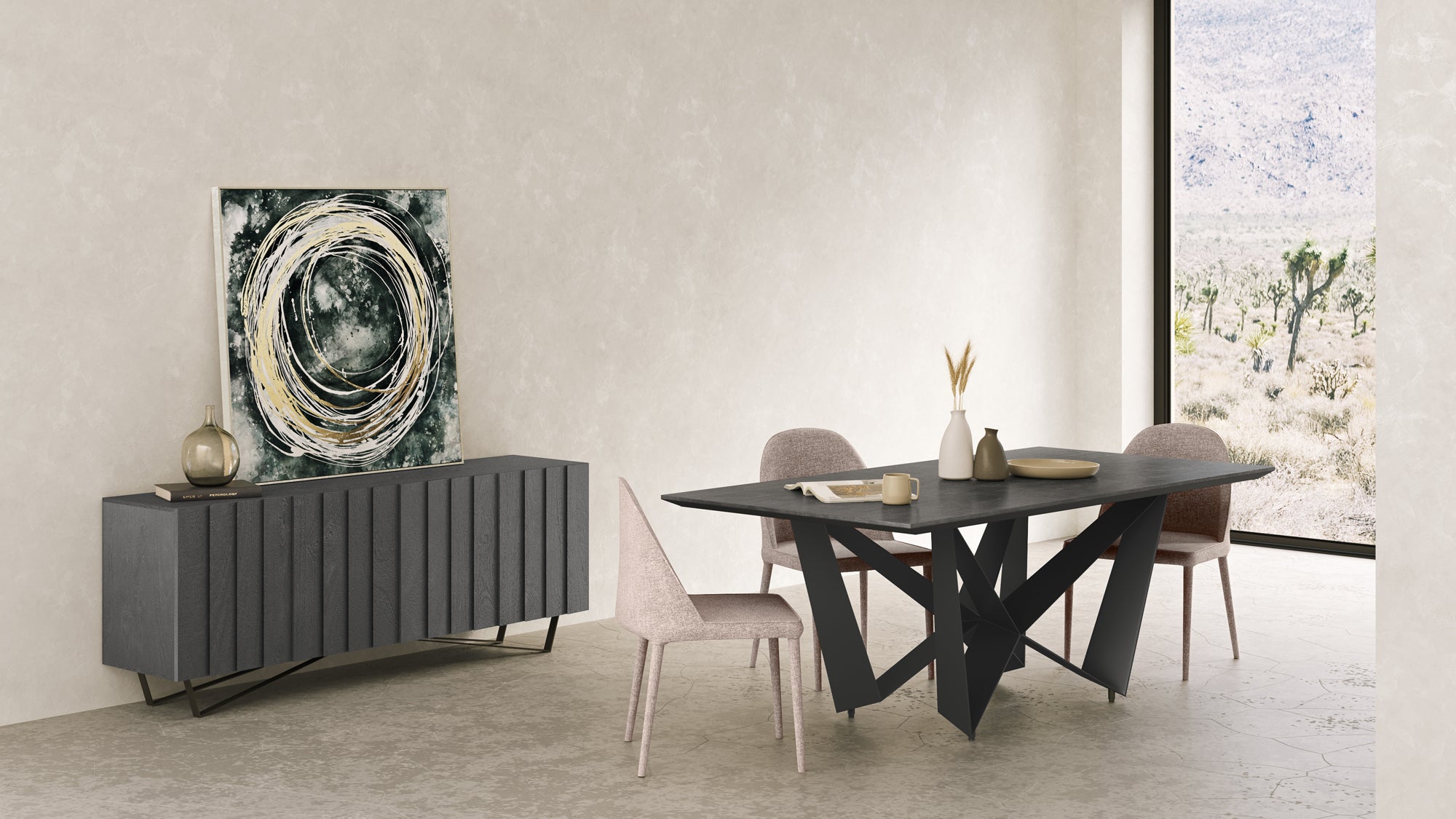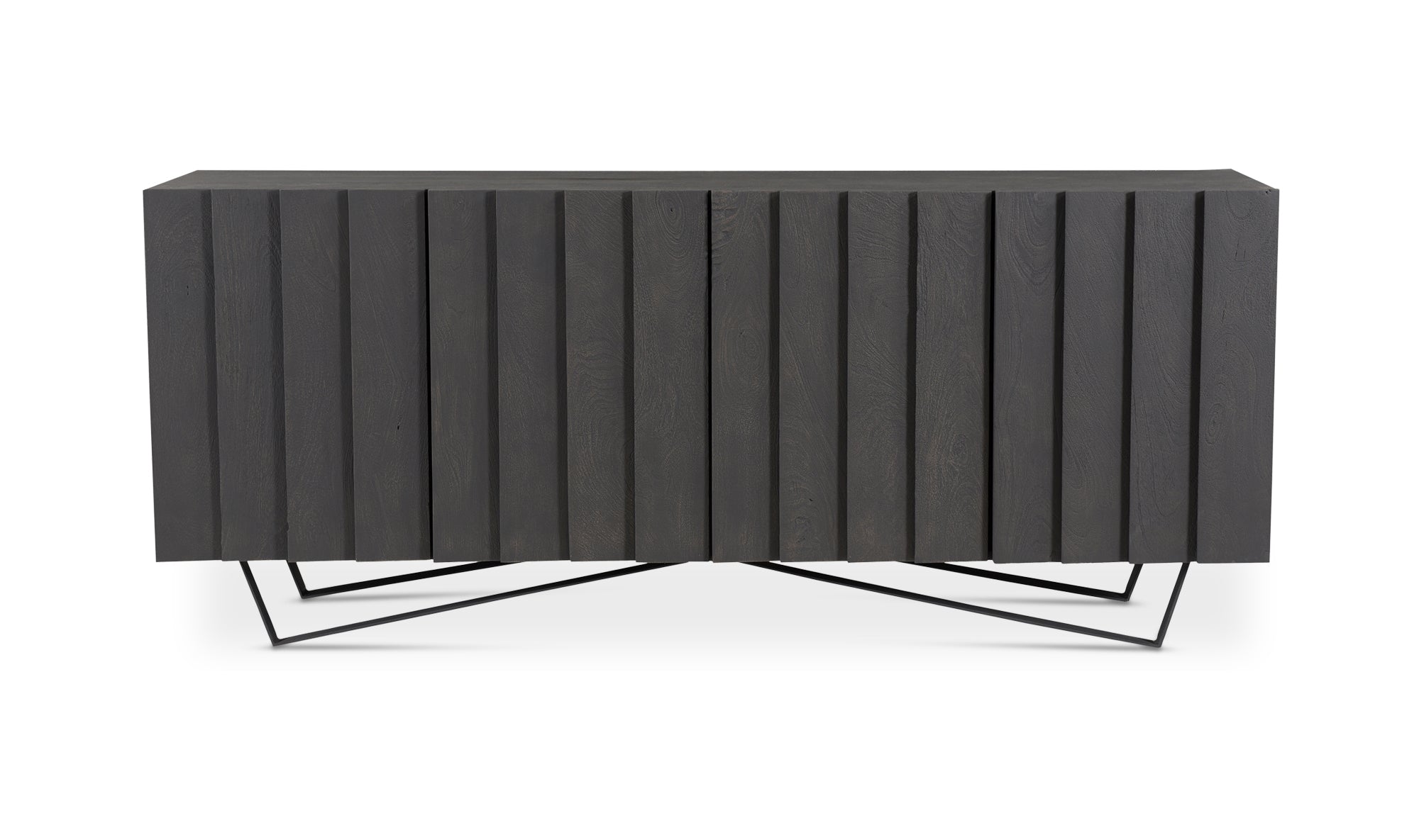 Invite darker hues and decorative introspection into your space with the Brolio collection. Solid, dark-hued mango wood cuts a dramatic profile, while sturdy iron legs bring sculptural elegance to satisfy those artsy cravings. The Brolio sideboard features 4 hidden doors, providing a subtle look for your dining space while still safely storing all your dinnertime items. An ideal storage solution for the dining room, pair this piece with others from the Brolio collection for a complete look.