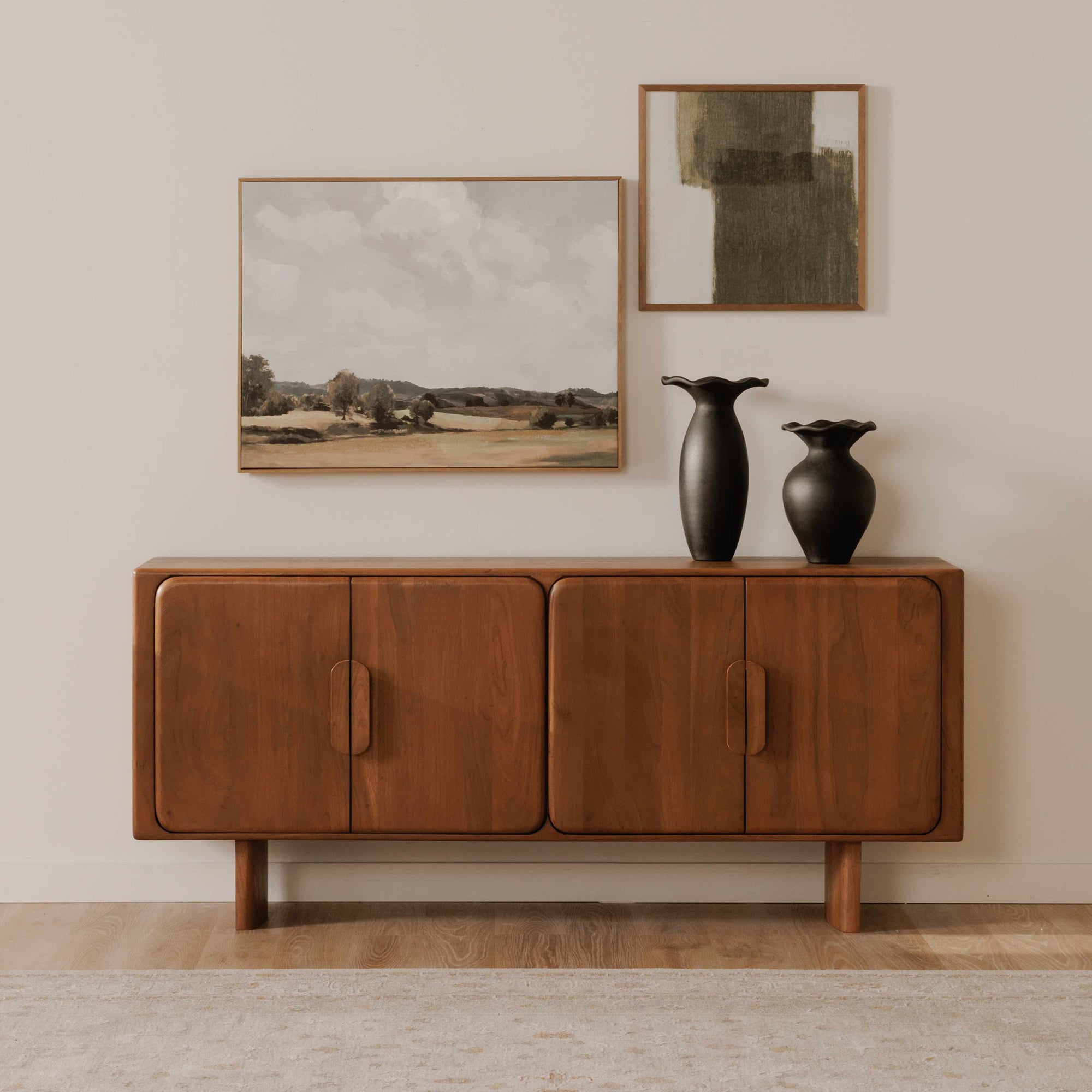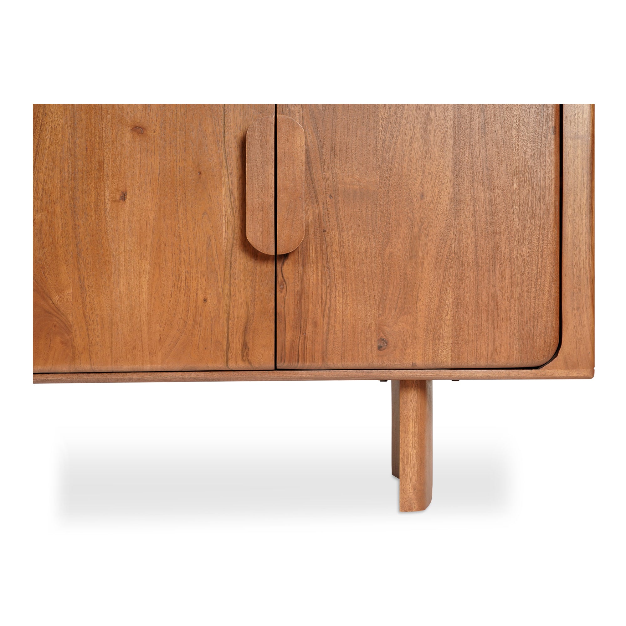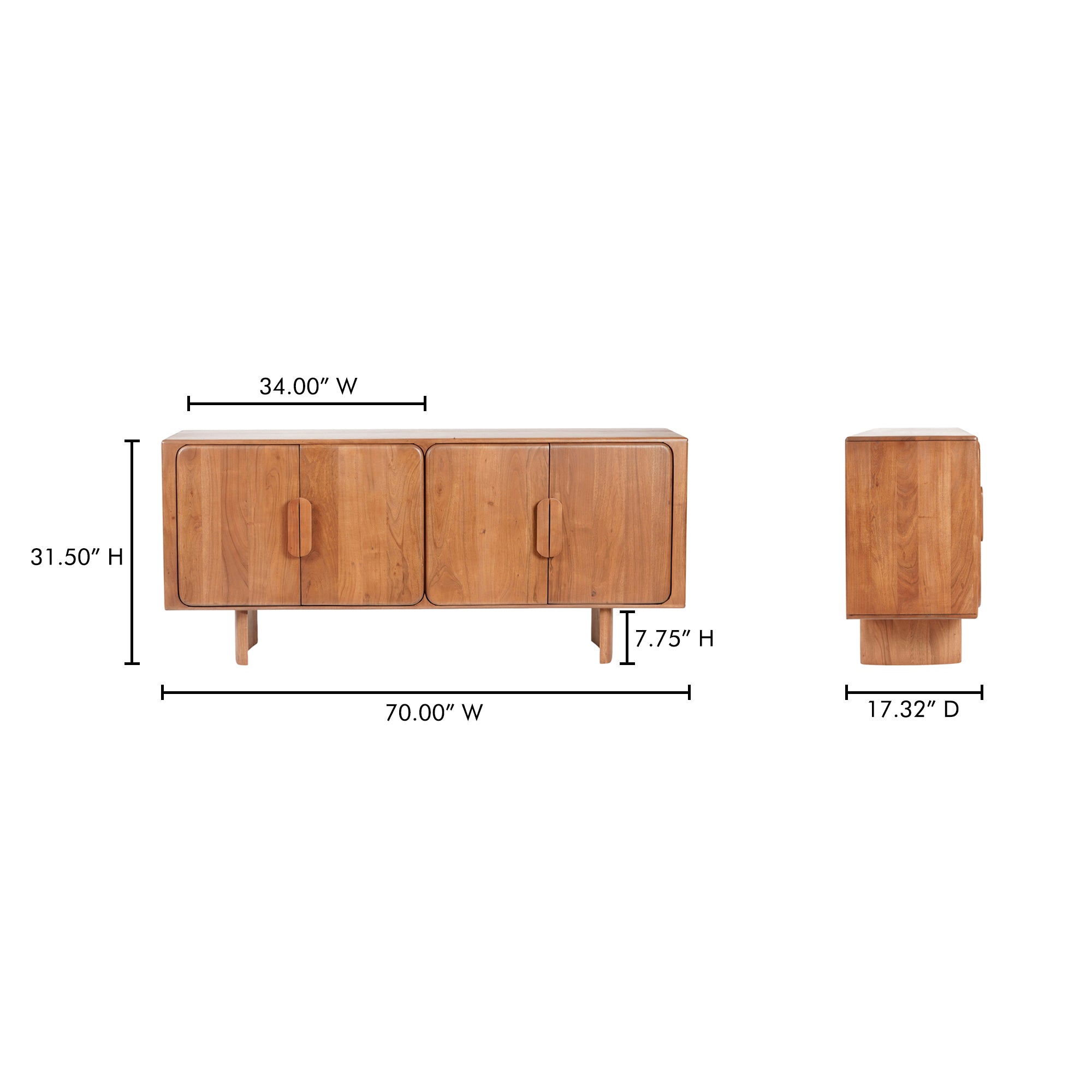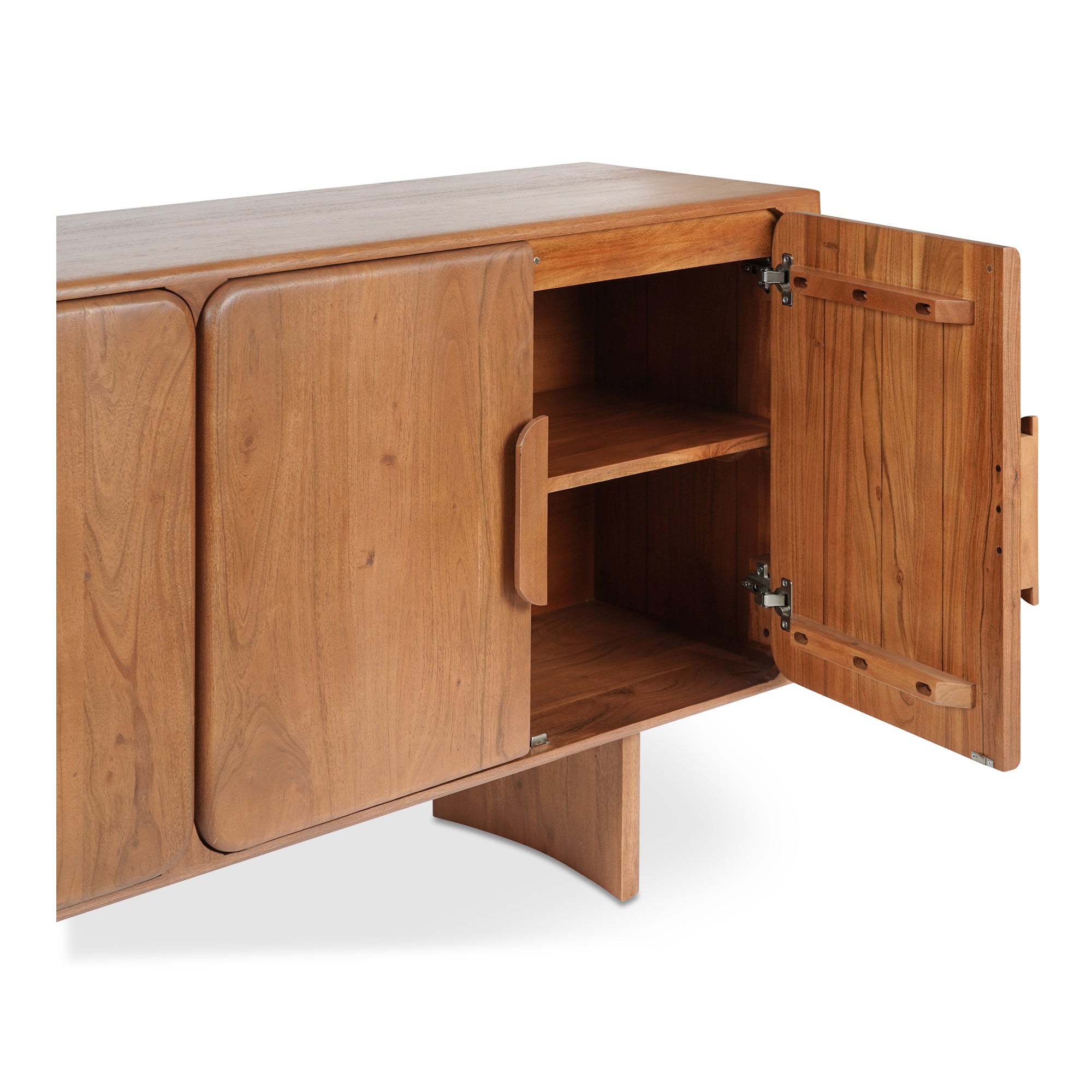 Round curved doors in a rich brown tone exude warmth and elegance in the Orson sideboard. Crafted from durable solid Acacia wood, this sideboard is both long-lasting and easy to maintain, while the glass door front with magnetic door catches adds effortless functionality.