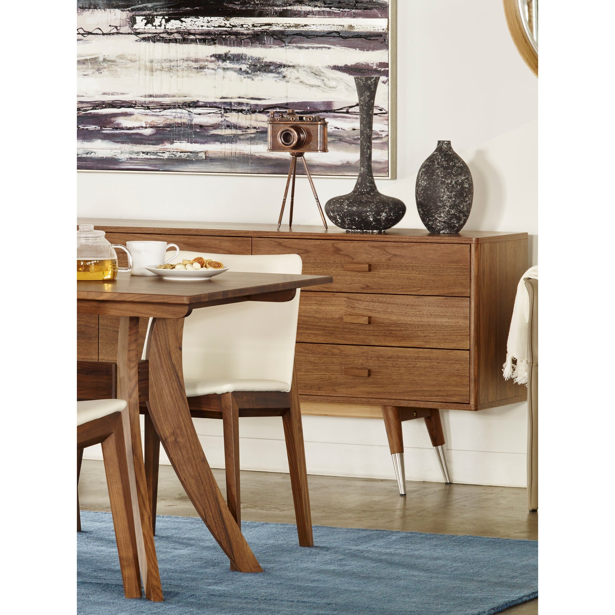 This Danish inspired sideboard is the perfect addition to any stylish dining room. Made of quality walnut-veneer and set on classic pencil legs, for a retro look and feel. With two doors and three drawers, the sideboard offers loads of storage options.