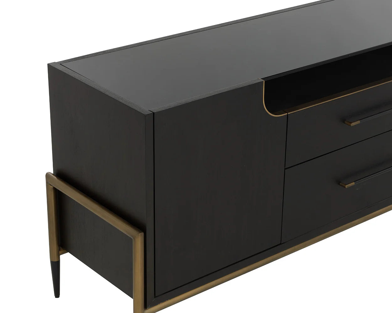 Make a statement with this stylish sideboard that exudes prestige. Features a espresso acacia wood veneer with two soft closing drawers. Completed with black and antique brass iron handles with a coordinating base. As wood is an organic, porous material, these pieces will contain natural variation of texture and may also exhibit fine indentations and cracks. Wood pieces will also display a disparity of colour and grain, and visible knots and burls that add to the character of each piece.