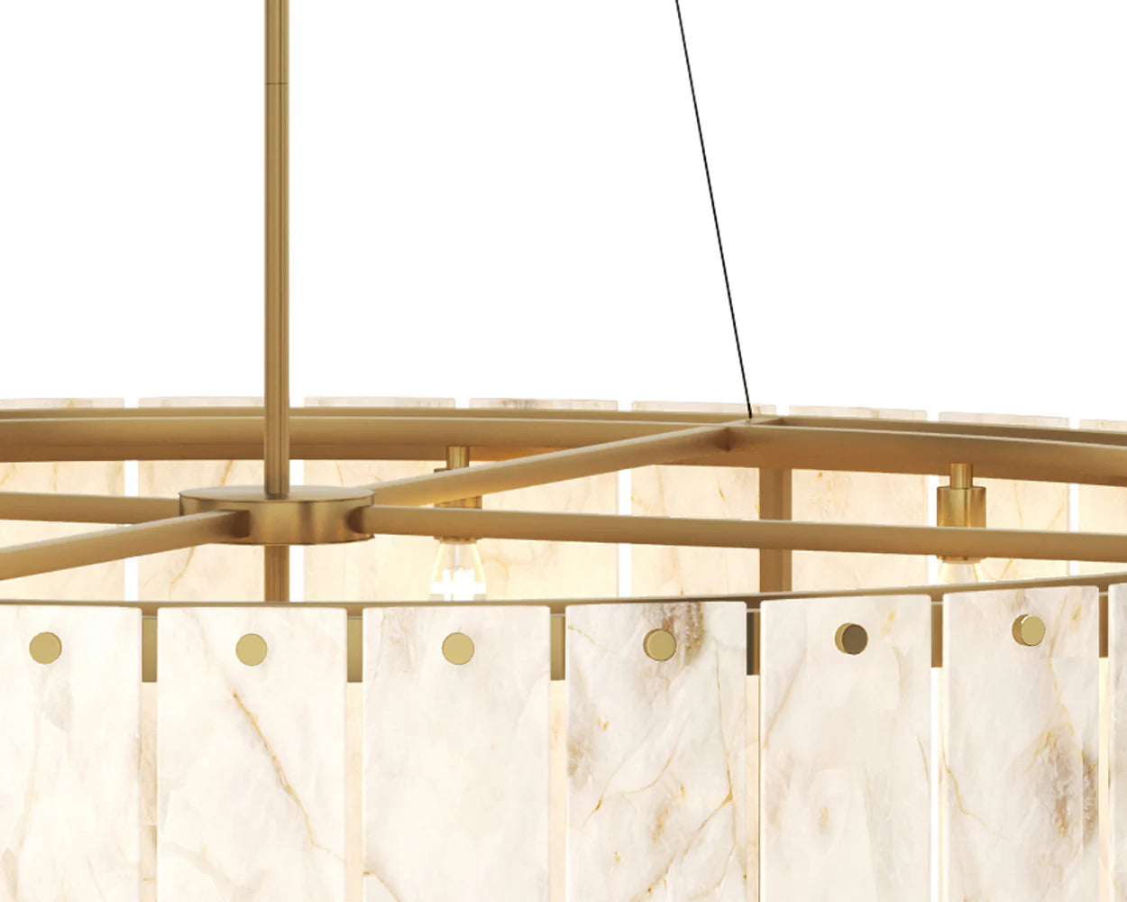 Striking and unforgettable, the Aspara Chandelier is a modern treasure that will make its presence felt in large spaces. This substantially-sized showpiece is masterfully crafted with two tiers of natural Spanish alabaster, prized for its translucency and soft cream colour. Each alabaster panel is sizeable and features unique veining that makes every chandelier one-of-a-kind.
