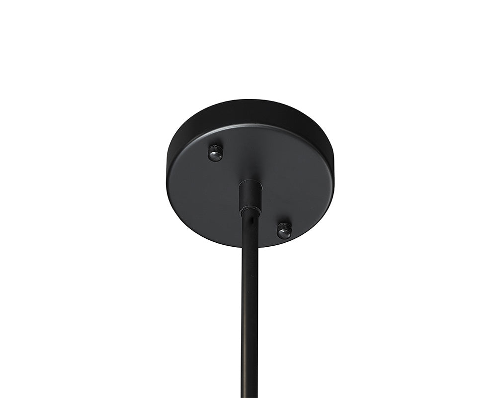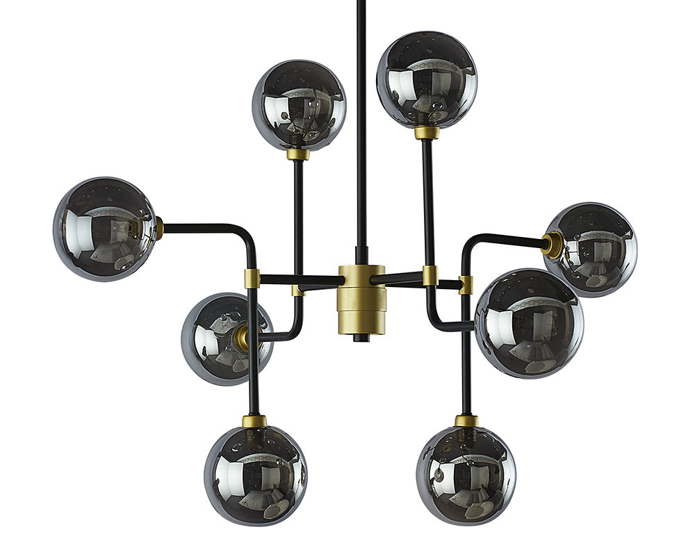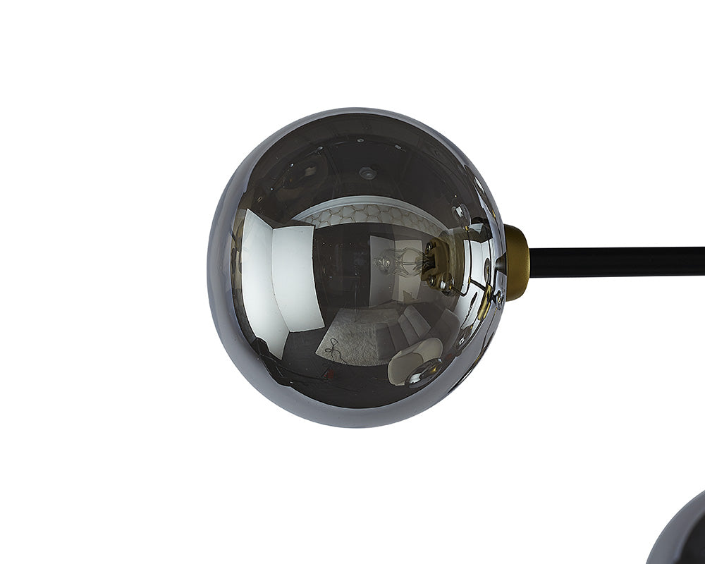 This modern ceiling light will create an alluring environment in living, lounge and dining spaces. Features black iron rods with gold hardware with smoke grey glass. Install multiples for a dramatic look. Available in large and small sizes.