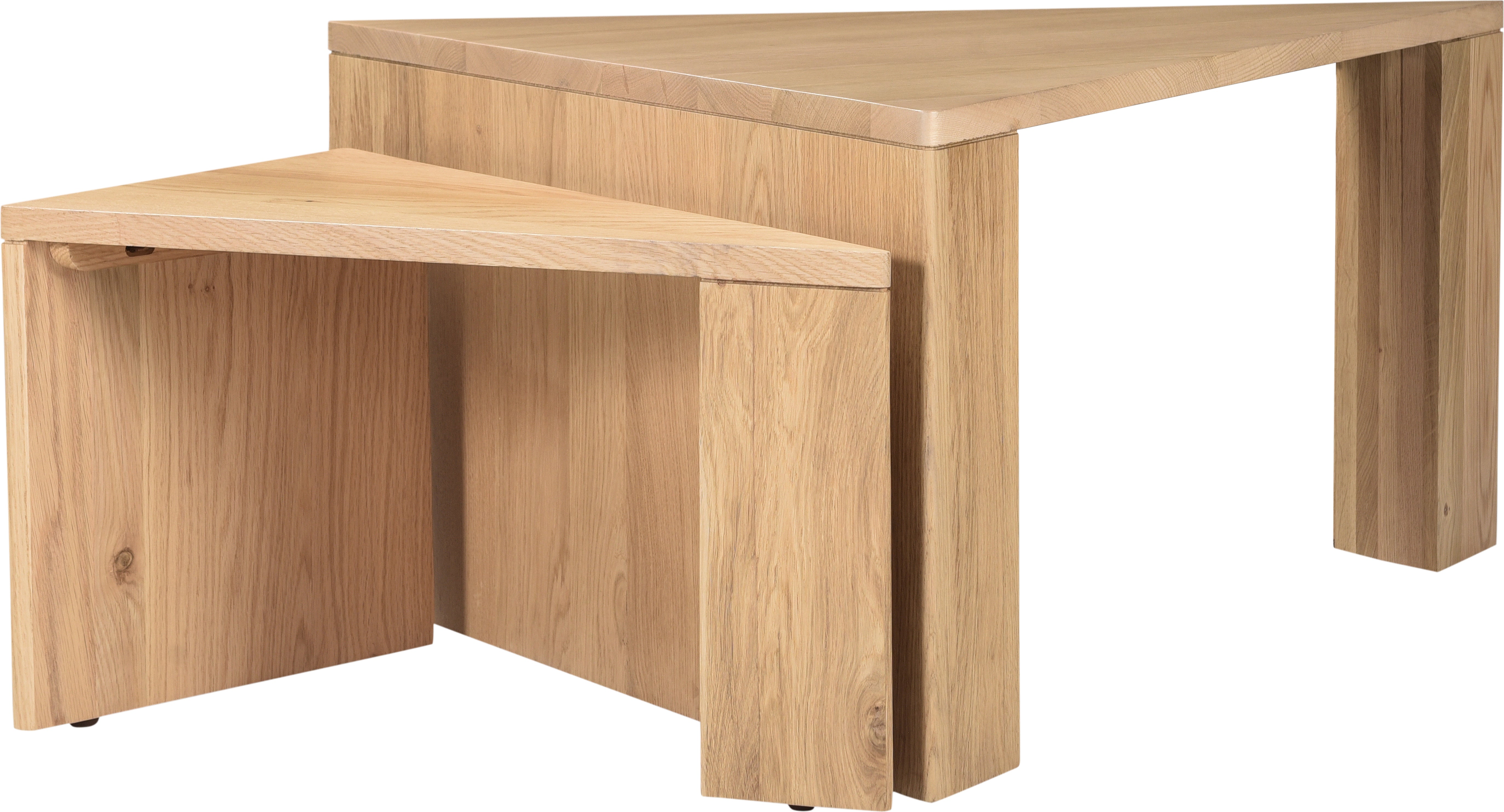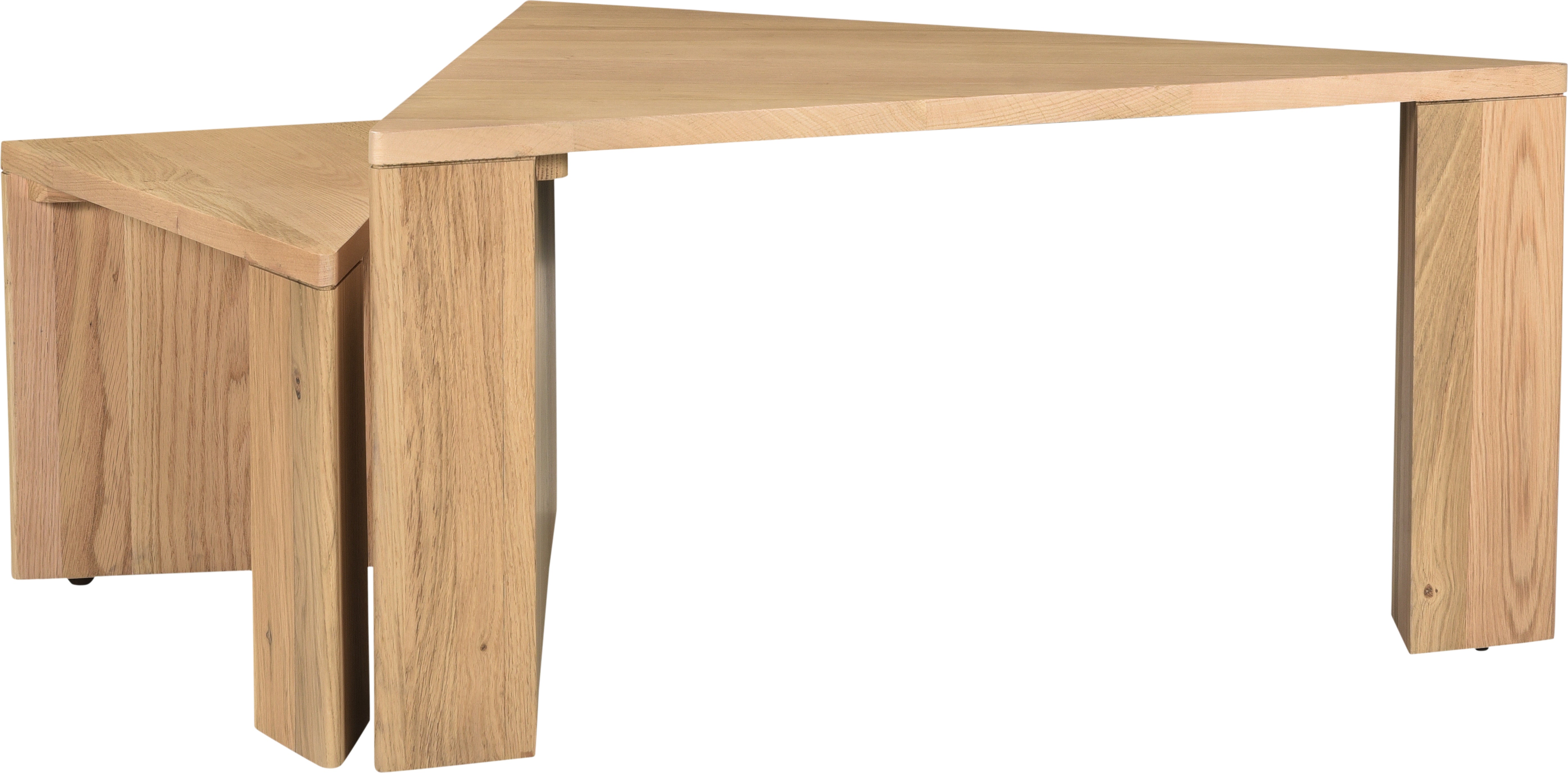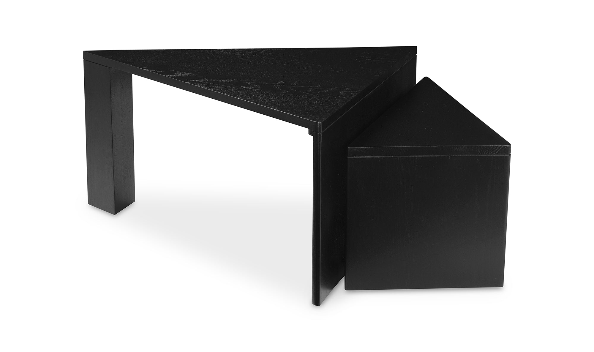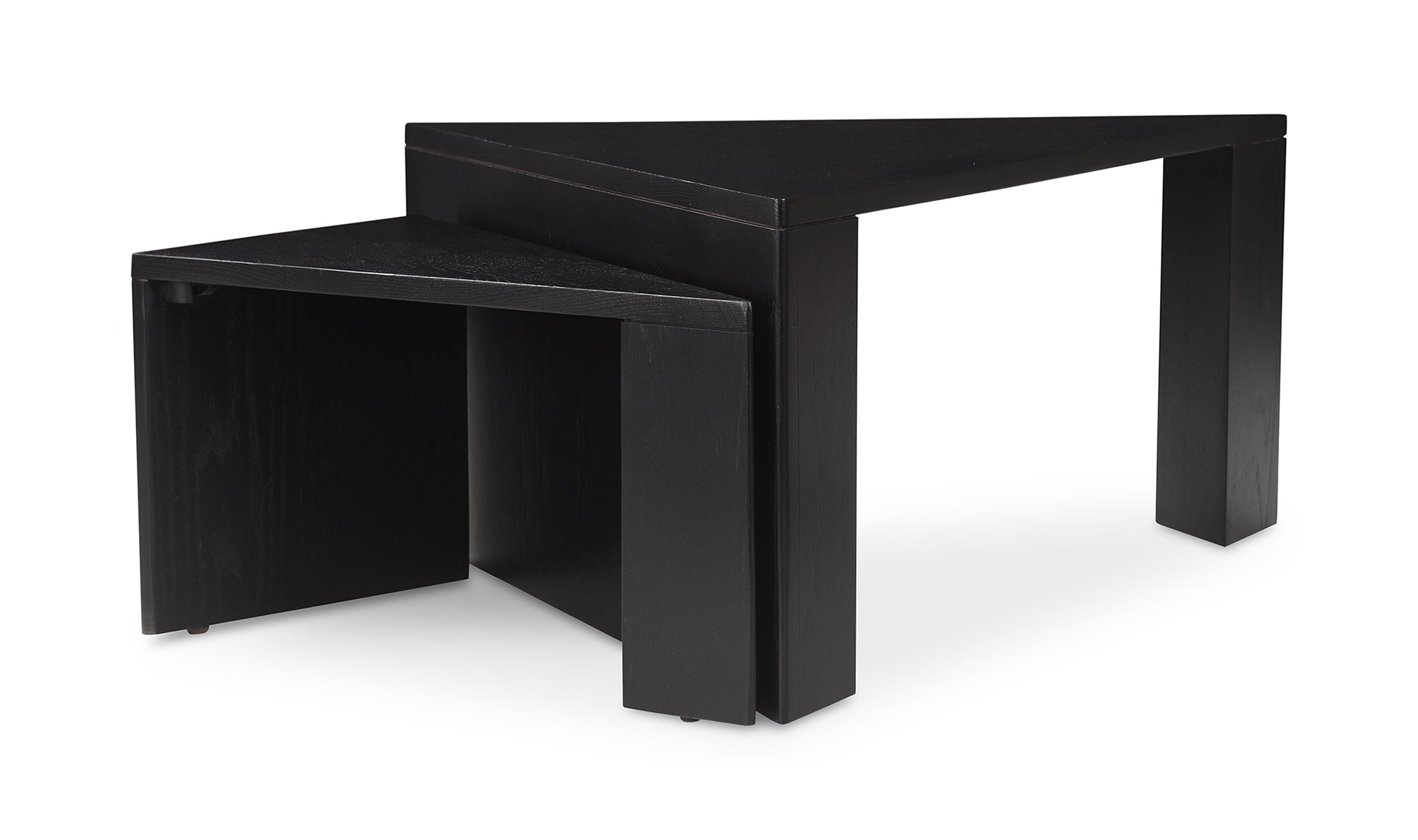 The complementing angles and radiused pillars of the Aton nesting coffee table create an elegant yet striking focal piece for any living area. The triangular nesting tables can be arranged in a variety of orientations, allowing for versatile and expandable curation.