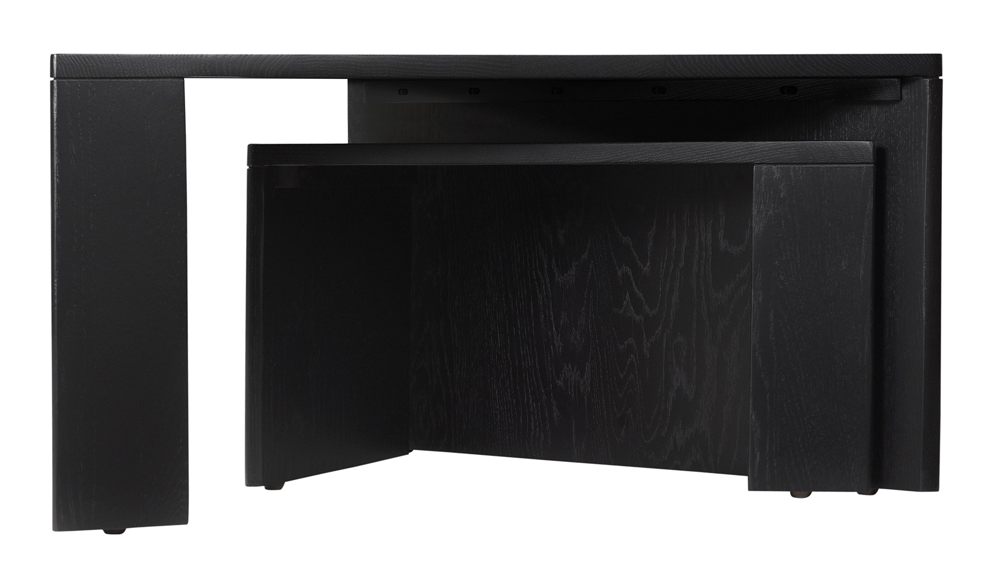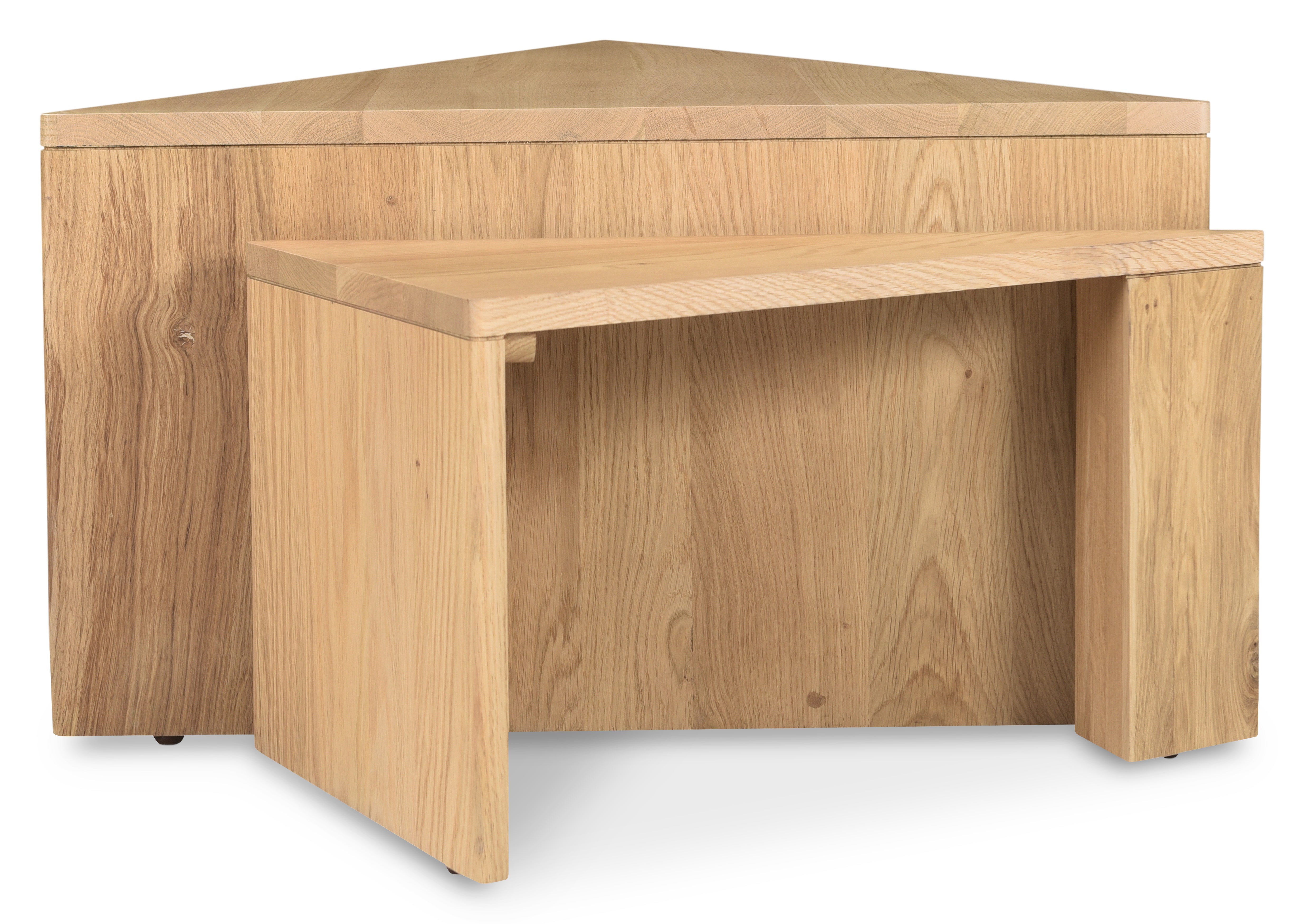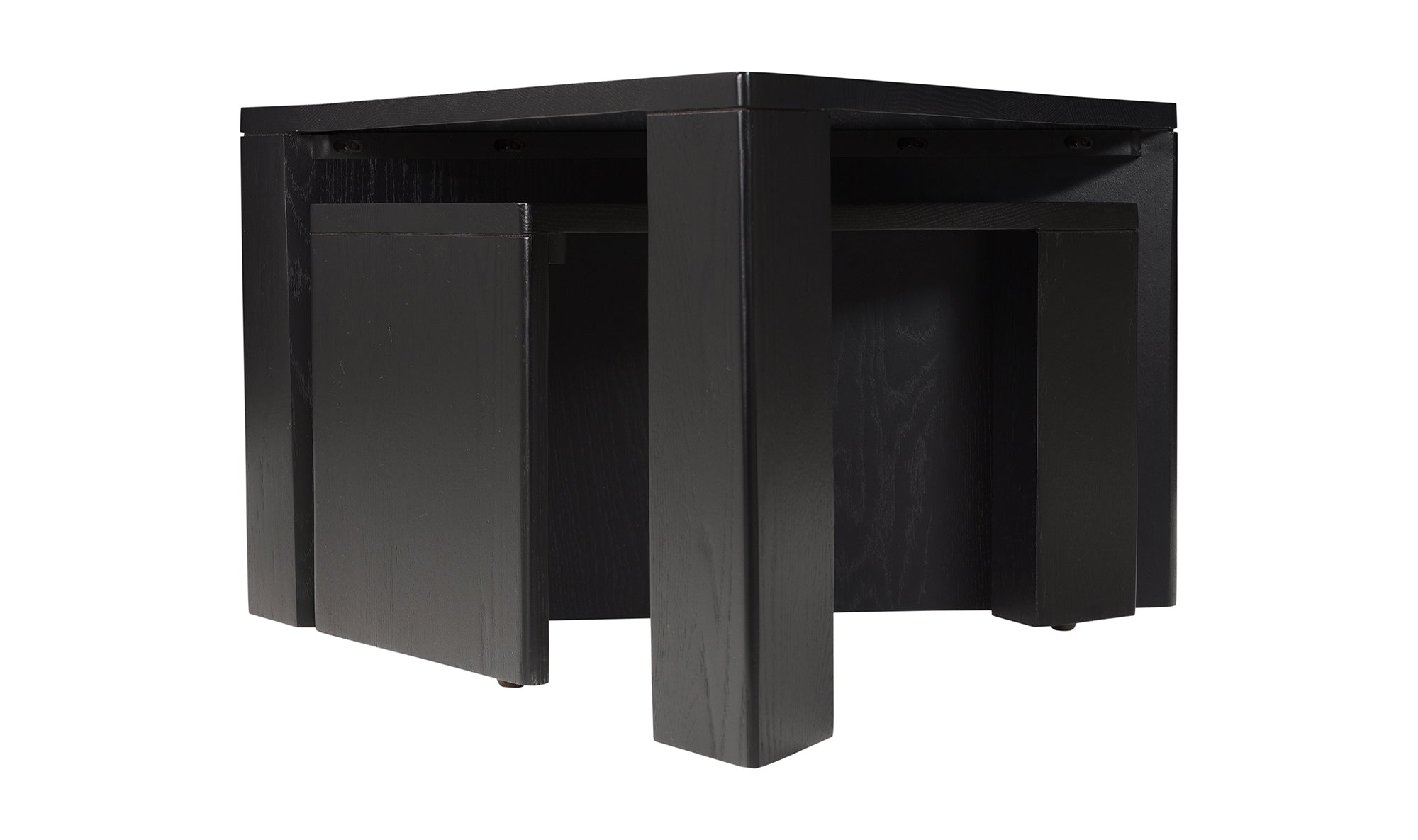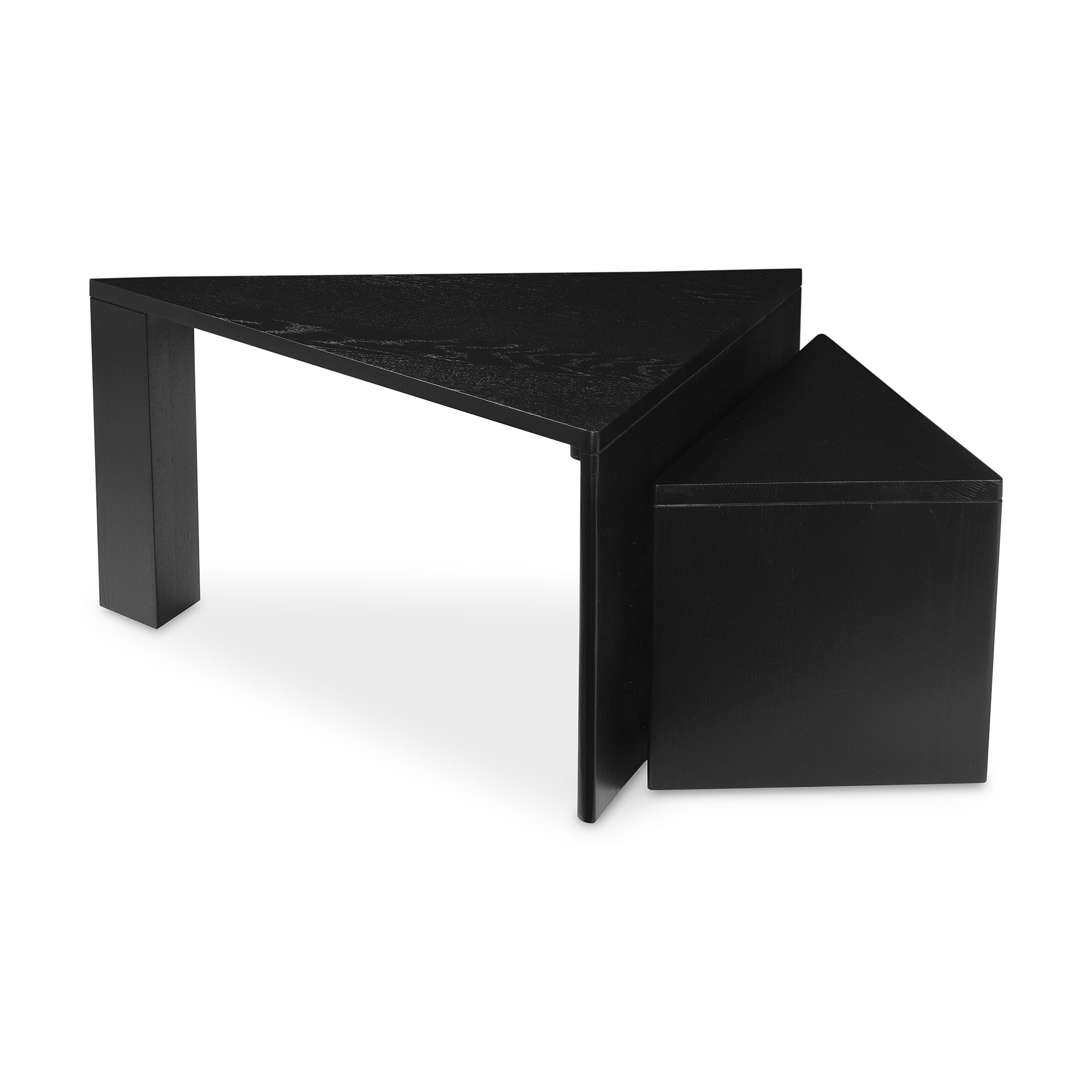 The complementing angles and radiused pillars of the Aton nesting coffee table create an elegant yet striking focal piece for any living area. The triangular nesting tables can be arranged in a variety of orientations, allowing for versatile and expandable curation.