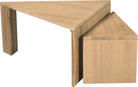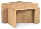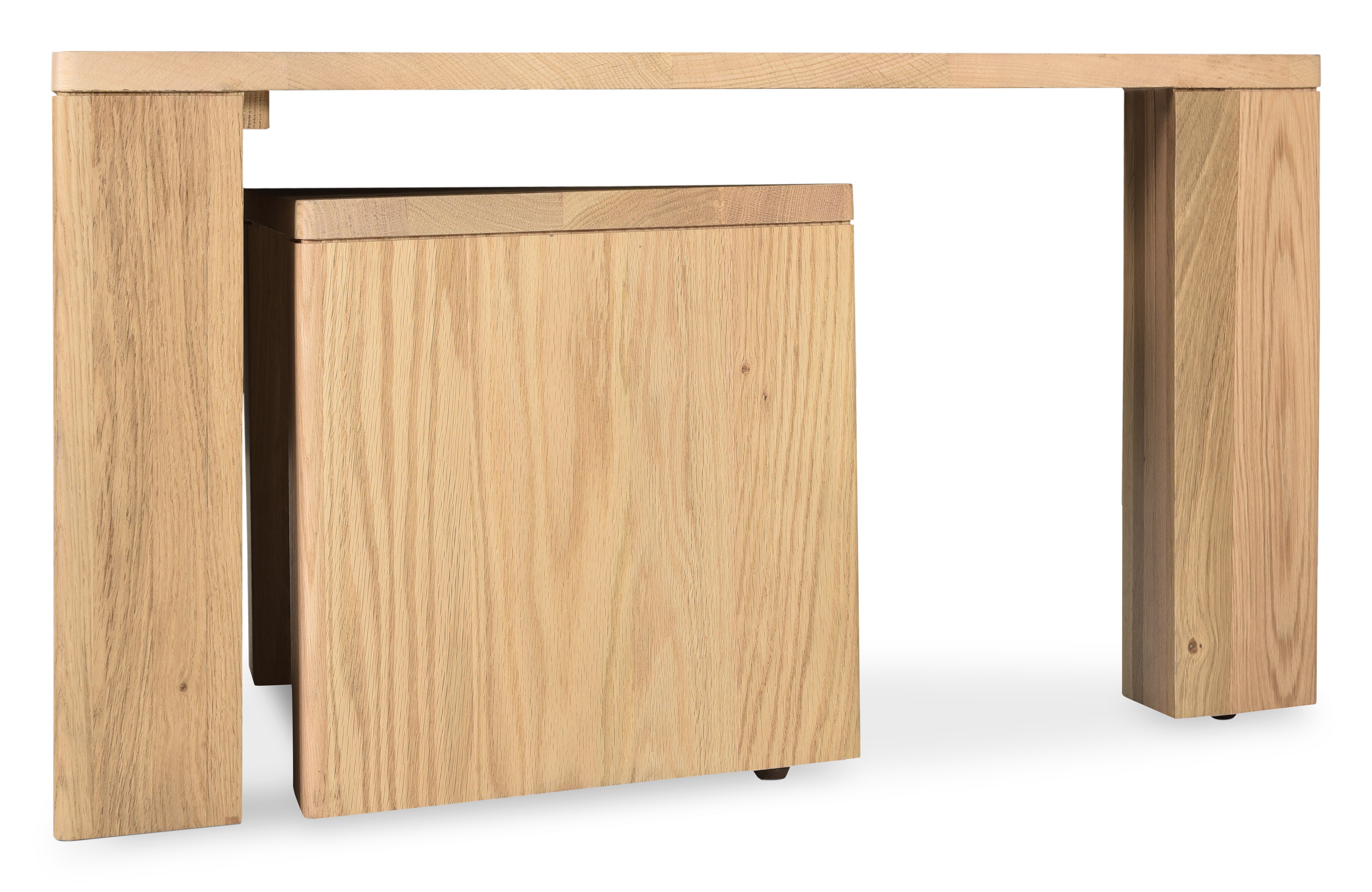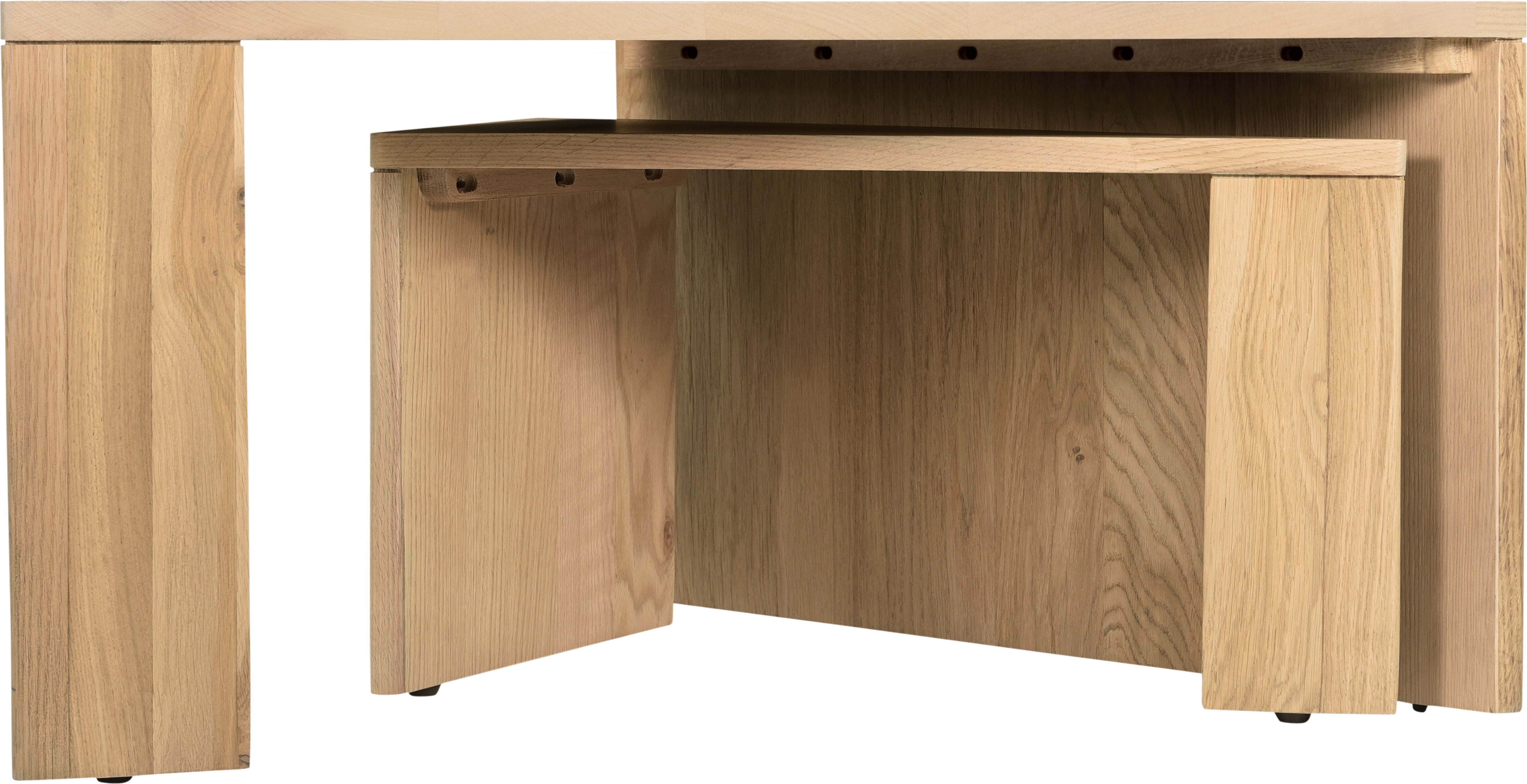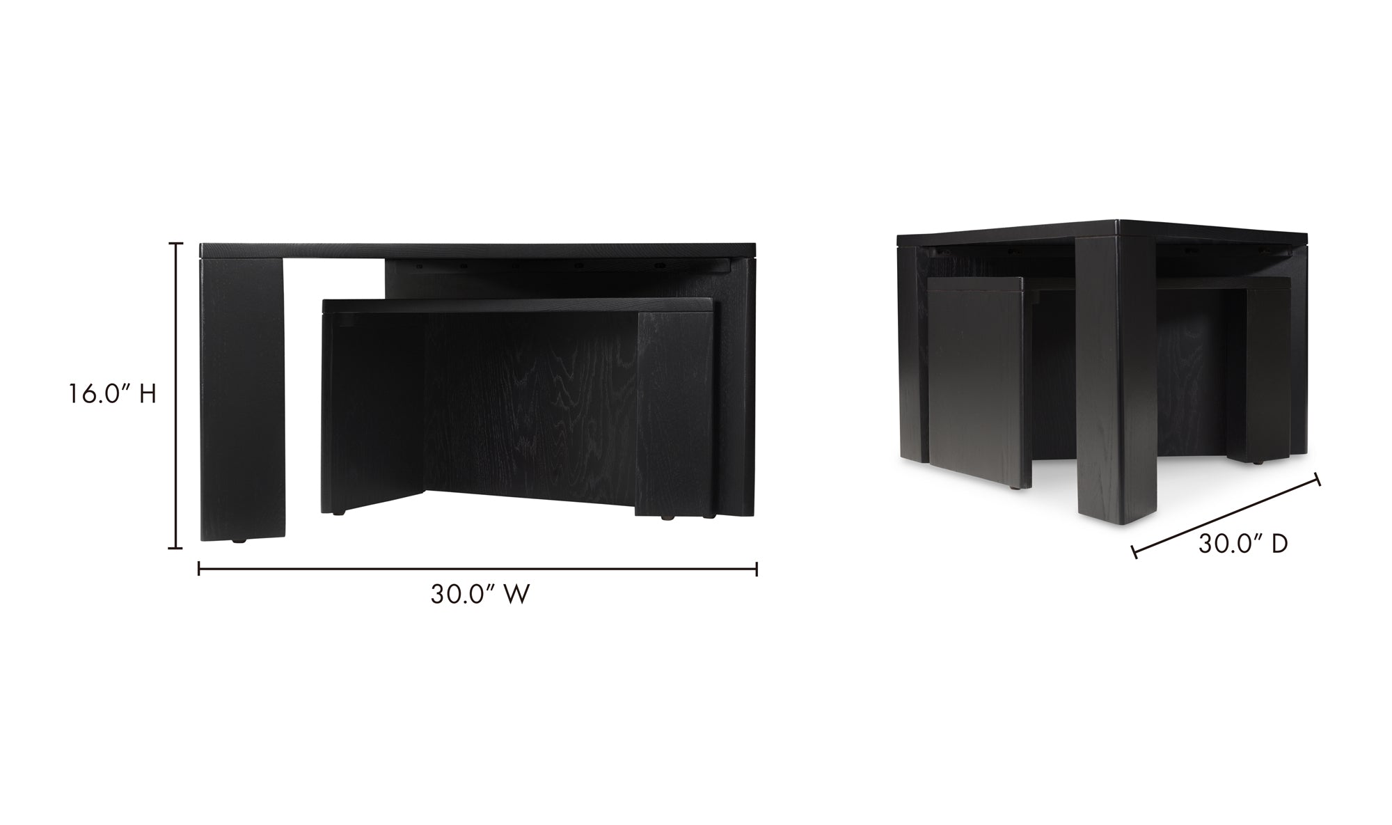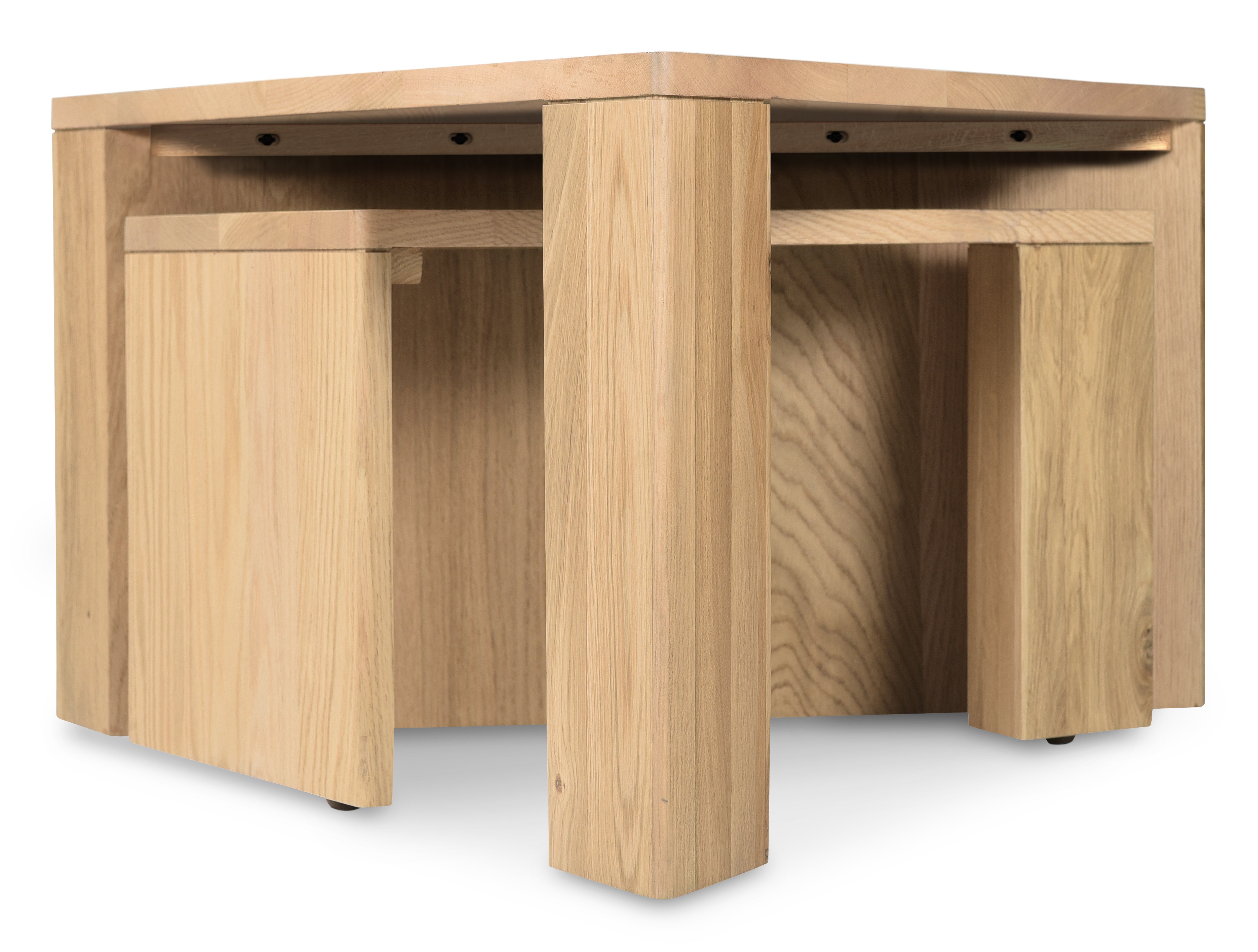 The complementing angles and radiused pillars of the Aton nesting coffee table create an elegant yet striking focal piece for any living area. The triangular nesting tables can be arranged in a variety of orientations, allowing for versatile and expandable curation.