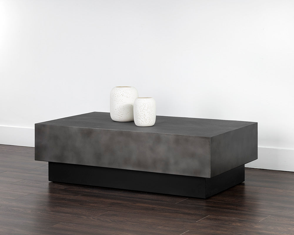 Turn heads with this contemporary, rectangular coffee table that features a bold design.Crafted with an antique brass steel top and a matte black powder coated steel base. Coordinating end table also available. Also comes in a gunmetal finish.