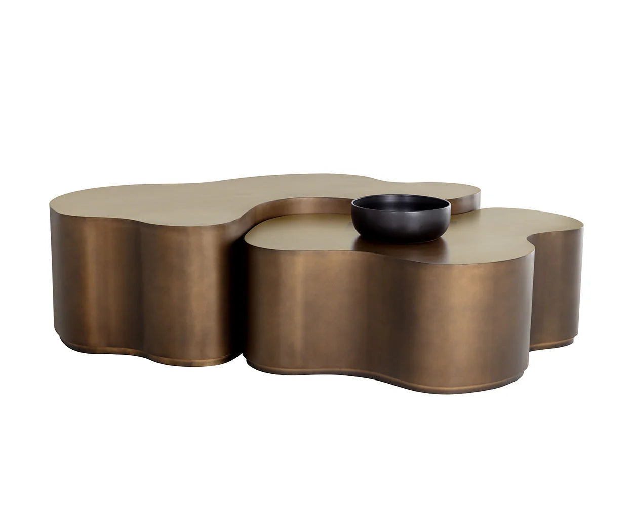 Free-flowing curves give the Boise Nesting Coffee Tables fluid silhouettes that create the perfect accent in any living space. Crafted from aluminum with antique brass and antique bronze finishes, these versatile tables can be nested together or arranged separately, offering flexibility and style.