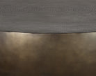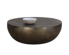 Add global flair to any living space with this unique coffee table. Handcrafted in India using antique bronze aluminum curved into a drum like shape. The etched tabletop adds extra character to complete the piece. With refined craftsmanship, this design was brought to life by skilled local artisans in India. By nature, these materials develop unique imperfections such as fissures, markings and colour variations for a truly one-of-a-kind piece.