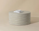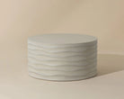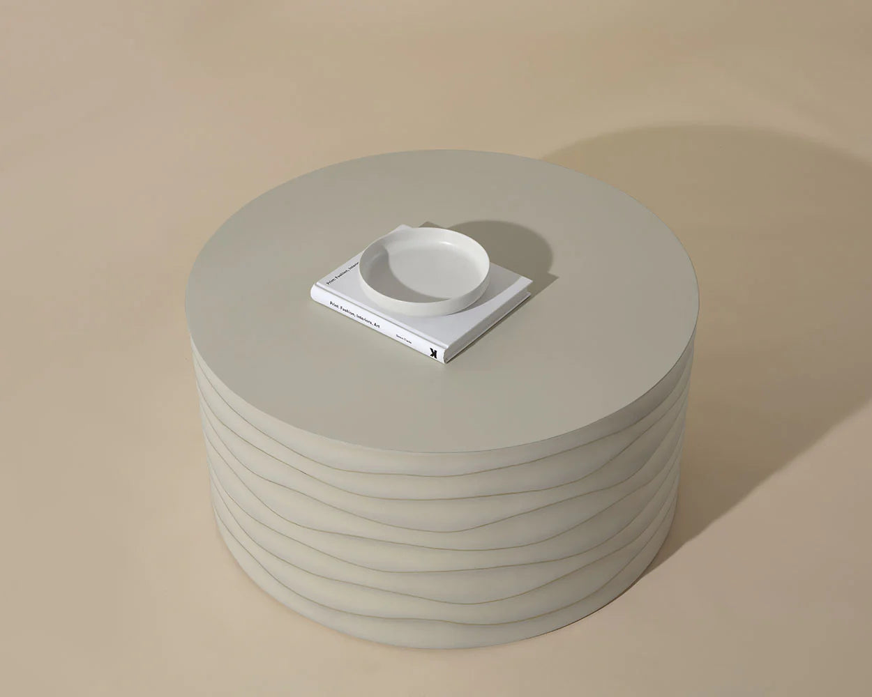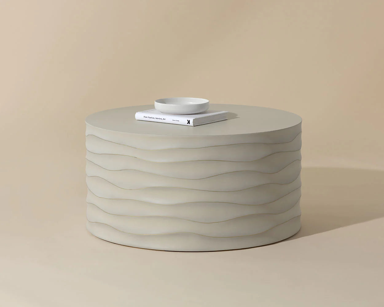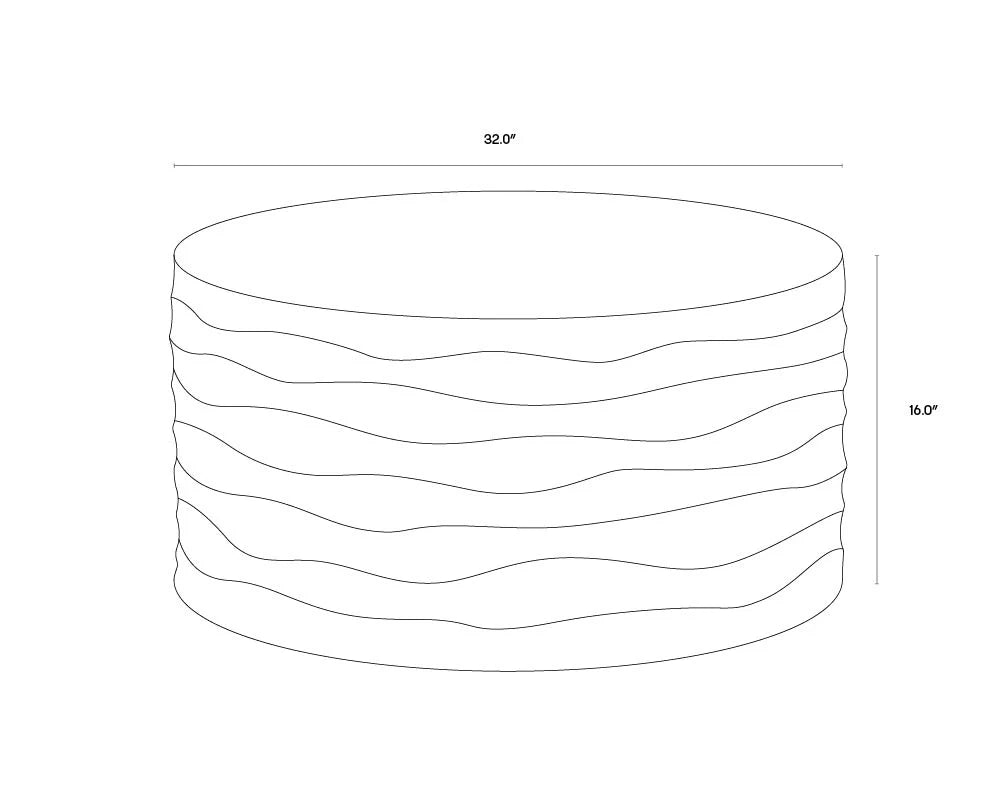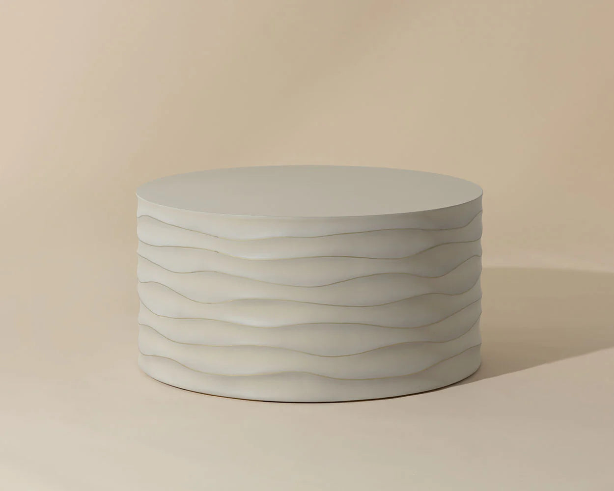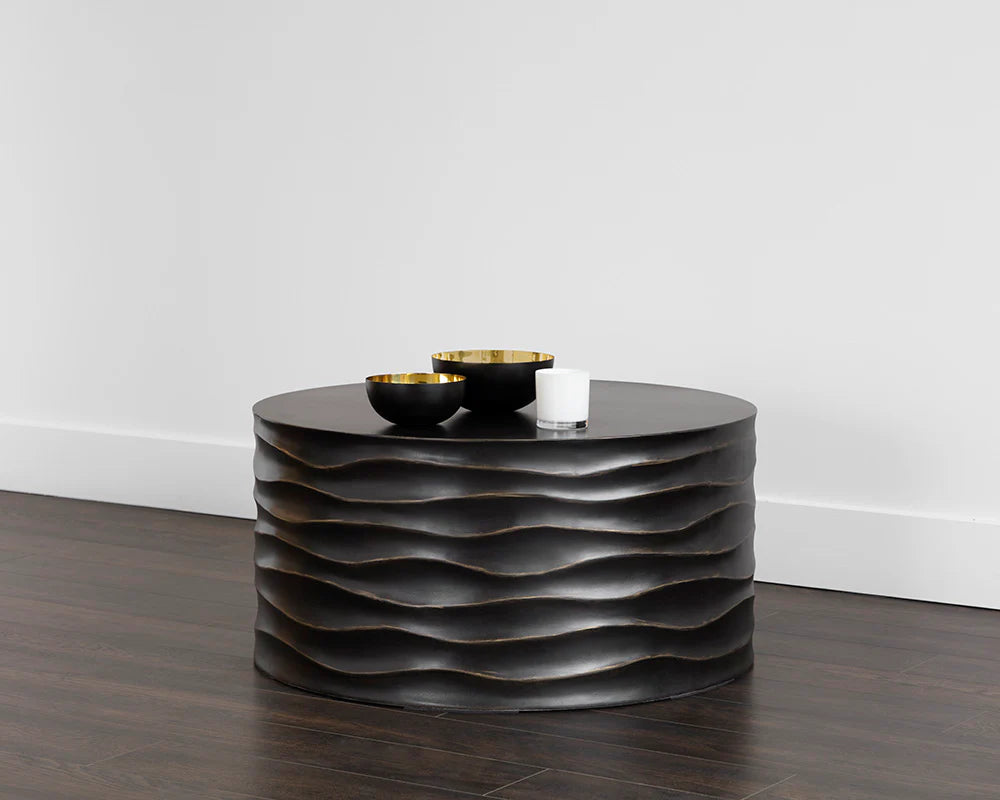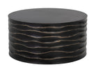 This large, round coffee table will create a moody environment. This piece features hand sculpted ridges with a painted brass finish. The perfect addition to living, lounge and office spaces.